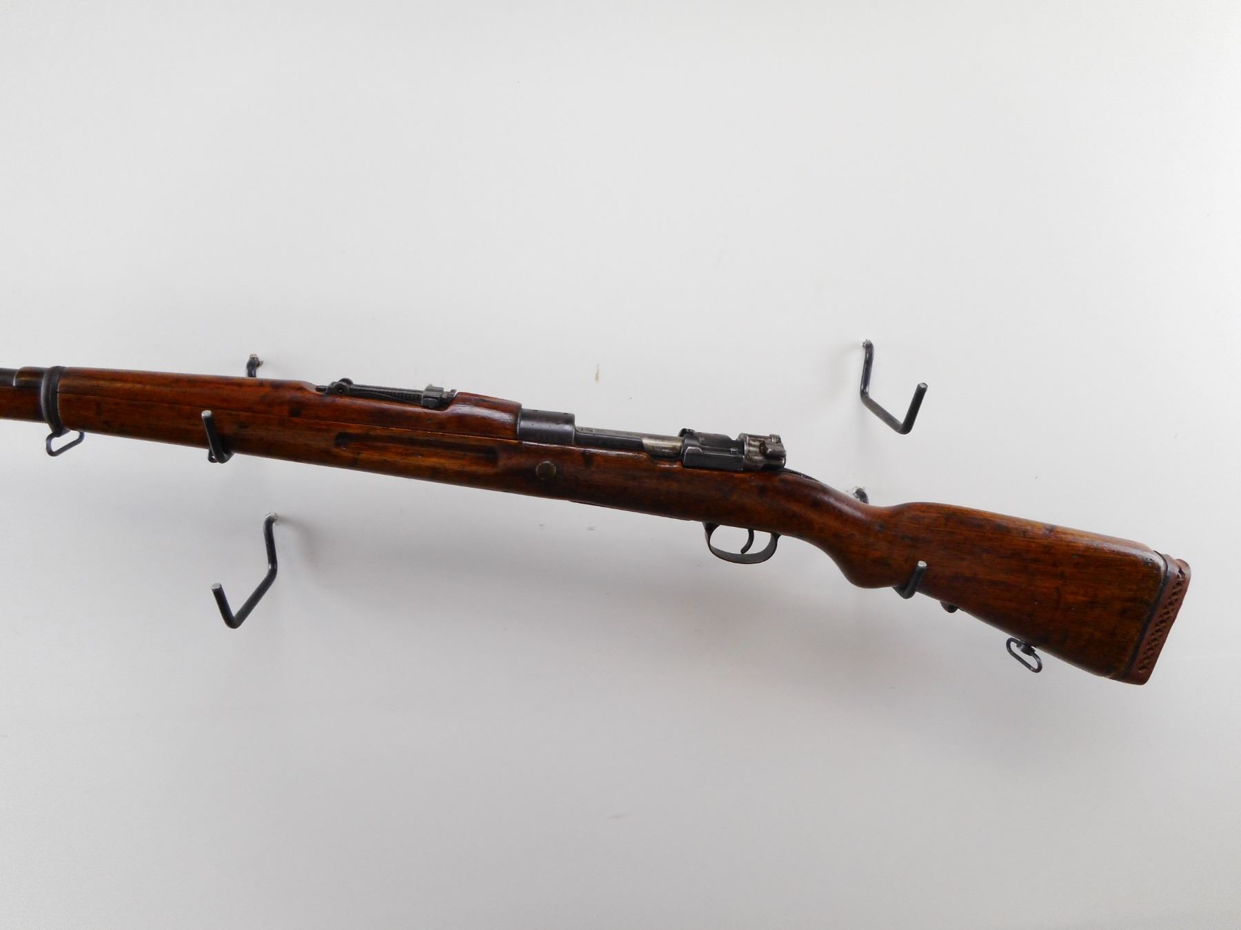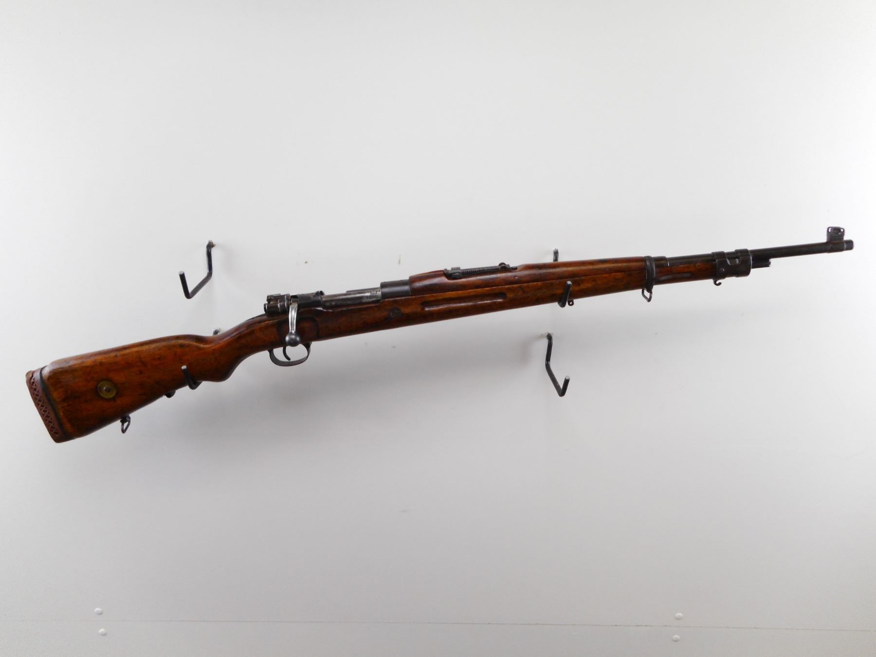 MAUSER , MODEL: 08/34 BRAZILIAN , CALIBER: 30-06 SPRG , BORE IS FAIR AND WORN. BARLEY CORN FRONT SIGHT WITH EARS. ADJUSTABLE U NOTCH REAR SIGHT. RECEIVER IS MODIFIED AND DRILLED AND TAPPED. BOLT HANDLE IS BENT DOWN. TWO PIECE FULL MILTIARY STOCK. GROOVED FOREND. RED VENTED RUBBER RECOIL PAD. SLING STUDS AND SWIVELS. TWO BARREL BANDS. BAYONET LUG. STEEL FLOOR PLATE AND TRIGGER GUARD. METAL FINISH IS TURNING BROWN WITH WEAR AND HANDLING MARKS. STOCK SHOWS NUMEROUS HANDLING MARKS AND DINGS. , SERIAL # 8398 , ACTION: BOLT ACTION RIFLE , BARREL LENGTH: 24" , CONDITION: 5/10 , CLASS: CANADIAN NON RESTRICTED CLASS