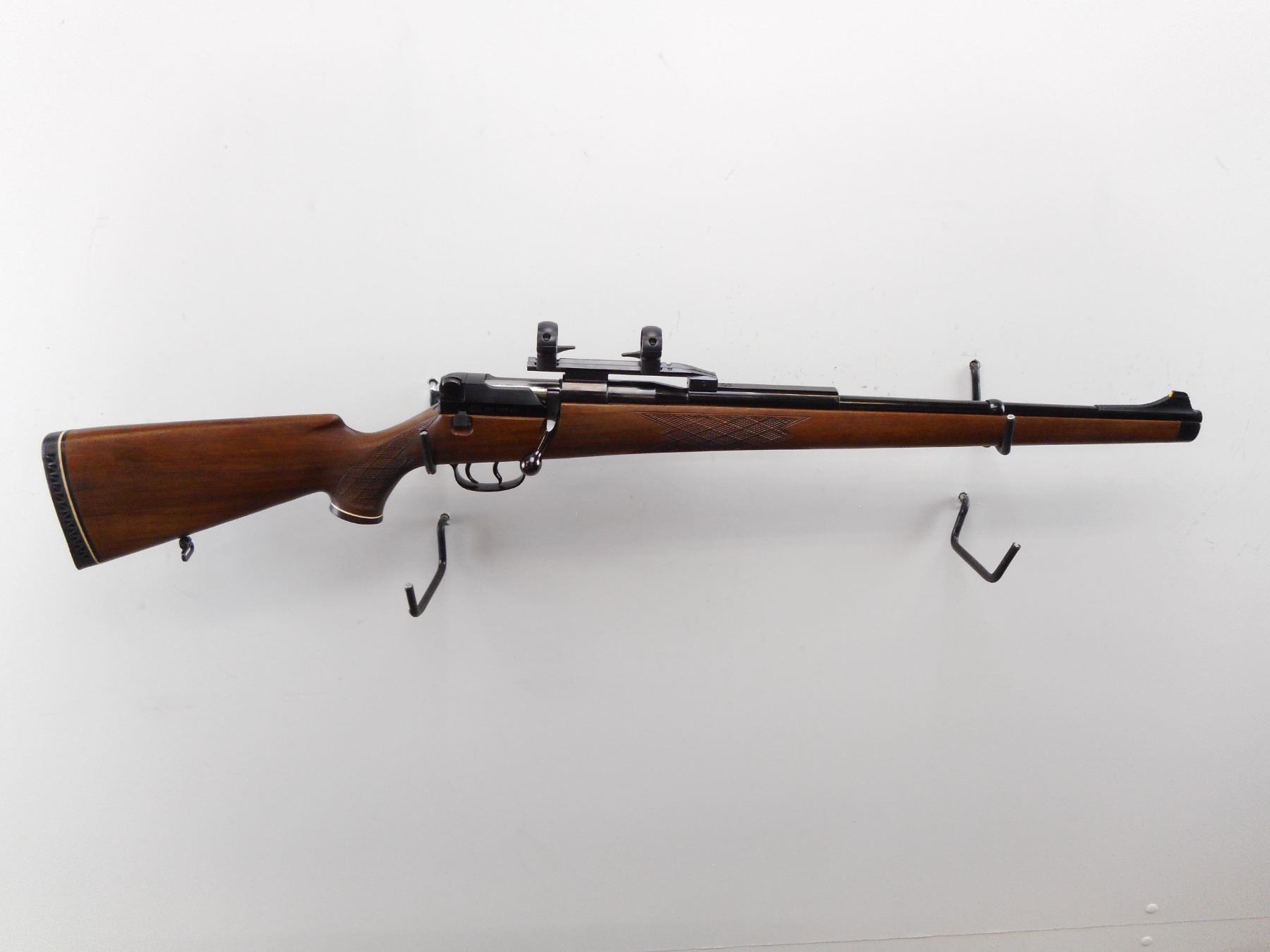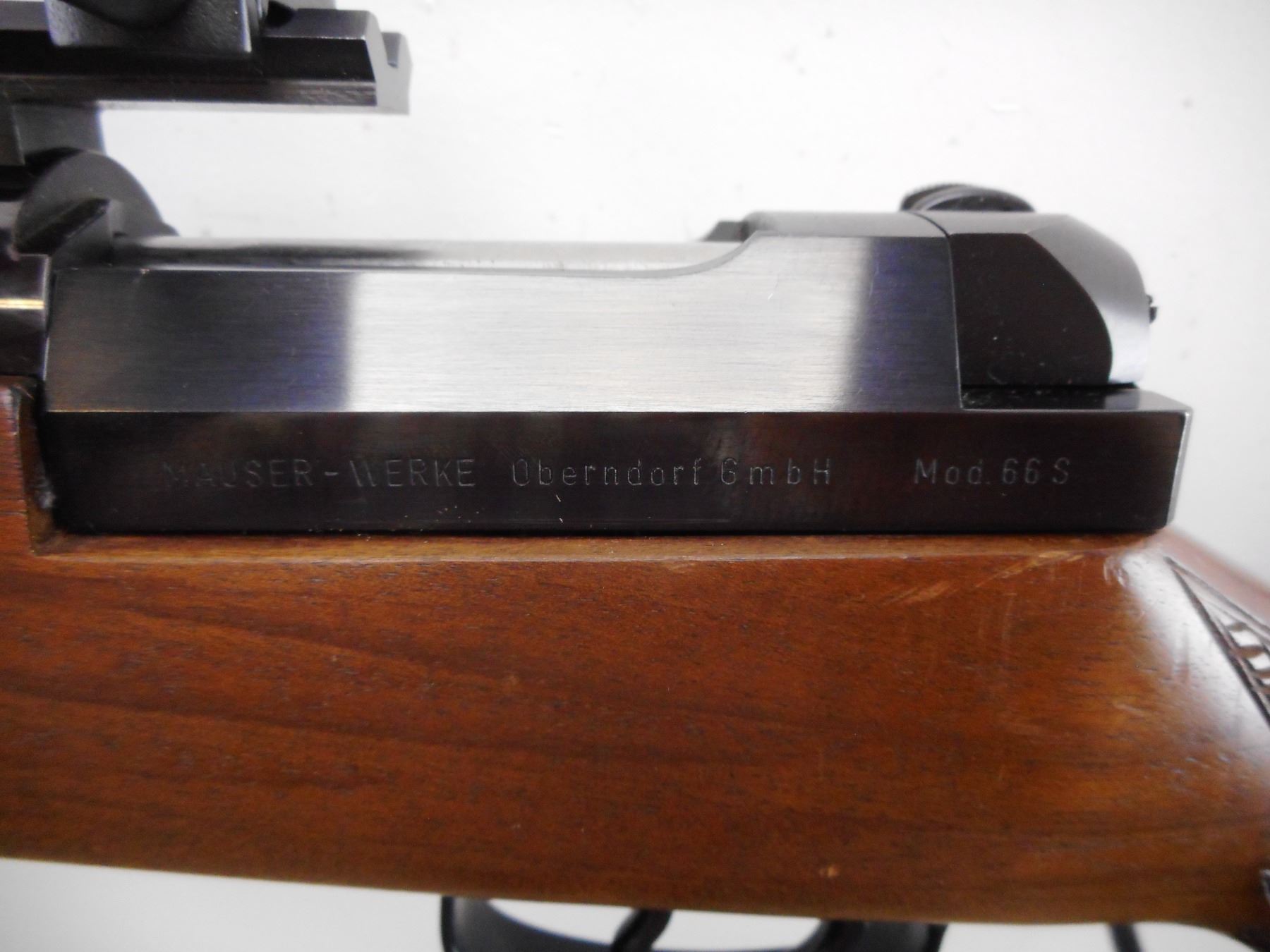 CONDITION: 8+/10 , MAUSER , MODEL: 66S , CALIBER: 270 WIN , BORE IS EXCELLENT. BLADE FRONT SIGHT WITH RAMP, REAR SIGHT REMOVED, WJ CHAPMAN SCOPE MOUNT WITH 1" QD RINGS, POLISHED BLUE ON METAL PARTS, DOUBLE SET TRIGGERS. ONE PIECE FULL LENGTH STOCK, CHECKERED FOREARM AND PISTOL GRIP, CHEEK REST, BLACK VENTED RUBBER RECOIL PAD, GRIP CAP, REAR SLING SWIVEL. METAL SHOWS SLIGHT HANDLING MARKS AND WEAR. STOCK SHOWS SMALL SCRATCHES AND DINGS , ACTION: BOLT ACTION RIFLE , BARREL LENGTH: 21" , SERIAL # SG43915 , CLASS: CANADIAN NON RESTRICTED CLASS