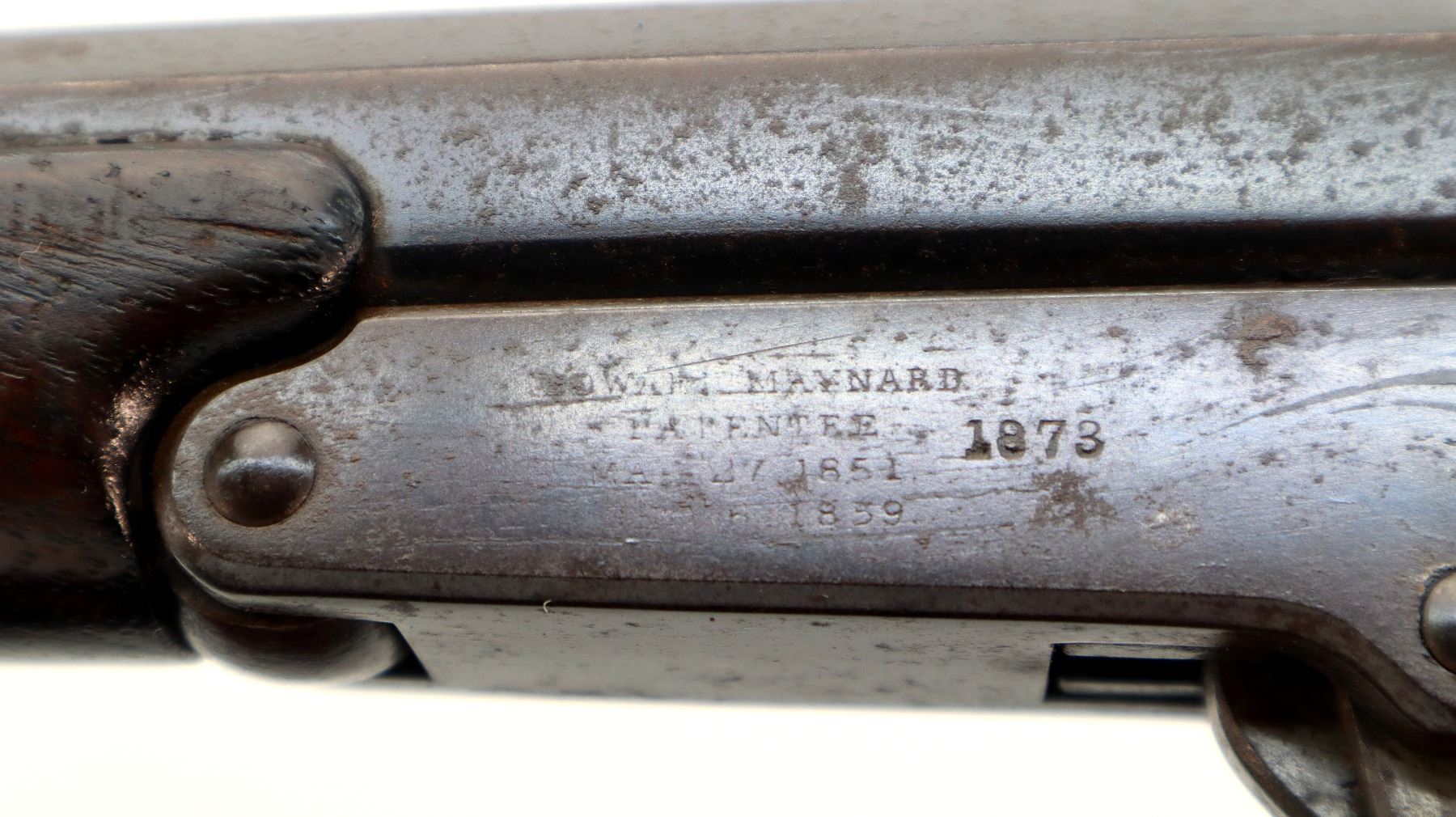Main Description: Blade front sight, adjustable folding rear peep sight, heavy round barrel with hex rear portion, checkered spur hammer, firing pin is present, extractor is missing. Two piece wood stocks, checkered forearm which is cracked, straight grip, smooth curved steel butt plate.