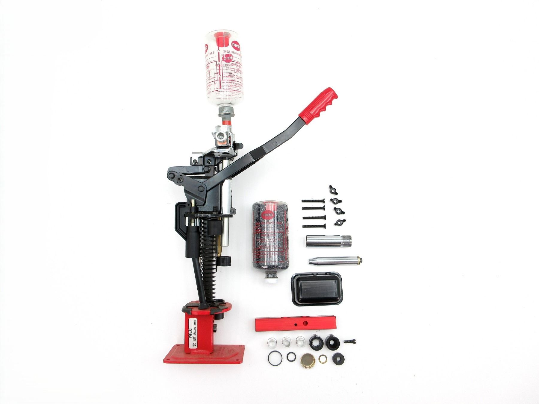 LOT INCLUDES; (1) MEC 10 GAUGE PRESS, MAY REQUIRE ADJUSTMENTS AND/OR MAY NOT BE COMPLETE, WITH (2) POWDER / CHARGE BARS, ONE INSTALLED, UN-INSTALLED BAR MARKED: "302, 200", (1) POWDER BAFFLE, INSTALLED, (2) POWDER / SHOT BOTTLES, ONE WITH UNKNOWN SHOT, APPROX. 5LBS (WEIGHT INCLUDES BOTTLE), (3) 10 G. CRIMPERS, ONE INSTALLED, (3) MEC POWDER BUSHINGS, #37, #40 & #44, (1) CATCH TRAY, ETC. SEE PHOTOS.
