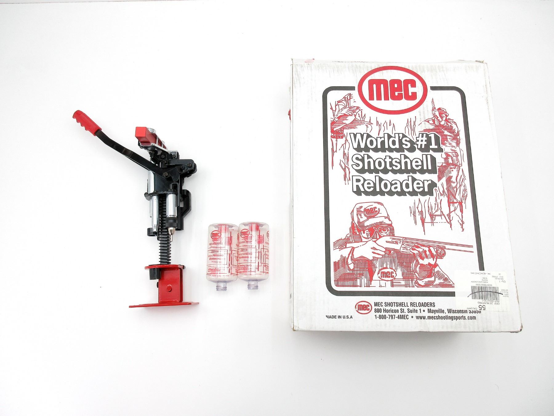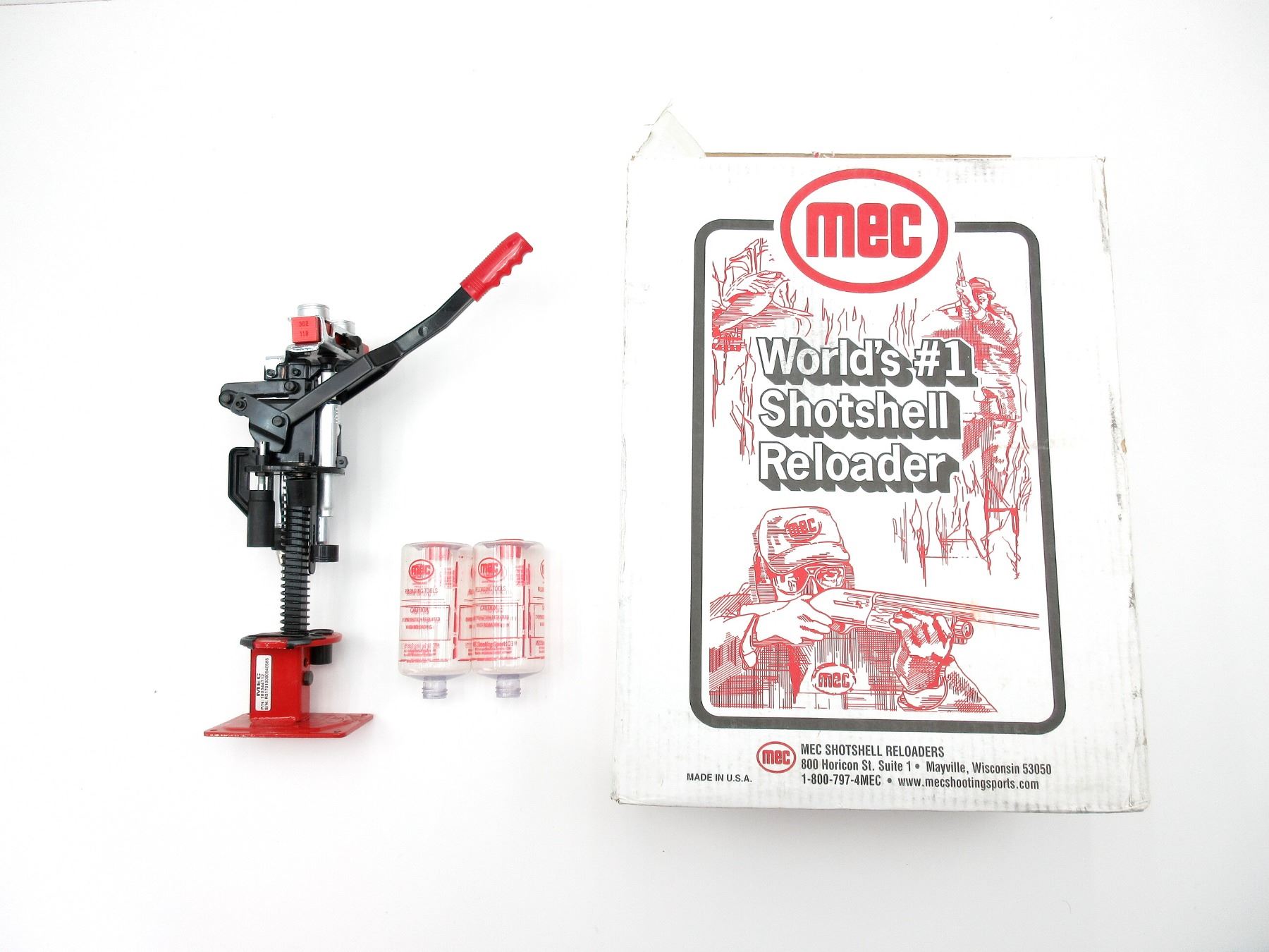 LOT INCLUDES; (1) MEC 12 GAUGE PRESS WITH (2) POWDER / SHOT BOTTLES, (1) POWDER BAR & WITH ORIGINAL BOX, MAY REQUIRE ADJUSTMENTS AND/OR MAY NOT BE COMPLETE. SEE PHOTOS.