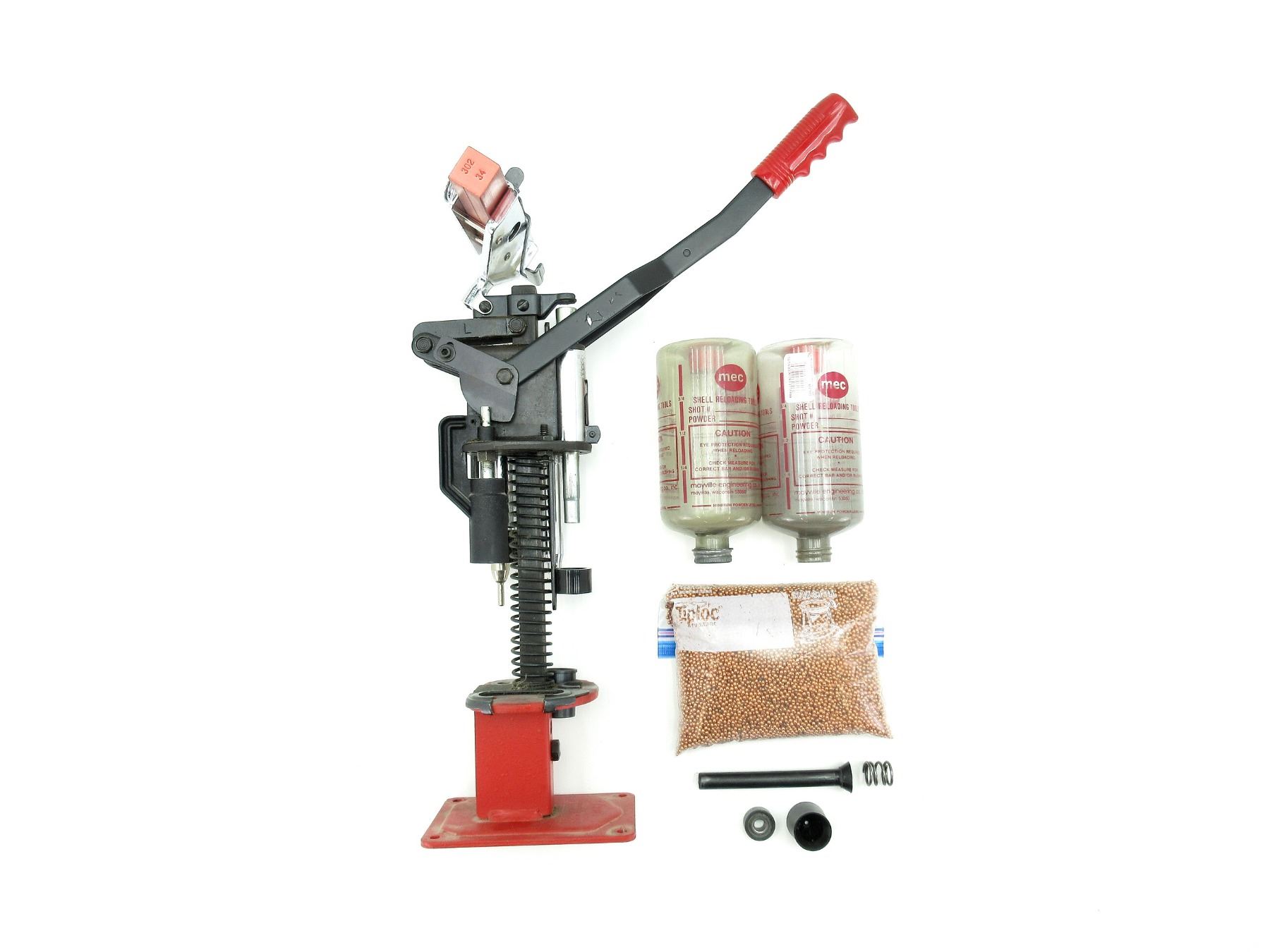 LOT INCLUDES; (1) MEC 20 GAUGE PRESS WITH (2) POWDER / SHOT BOTTLES, (1) UNKNOWN BAG OF COPPER SHOT APPROX. 8.4LBS, (1) 20 GAUGE CRIMPER & (1) POWDER BAR, MAY REQUIRE ADJUSTMENTS AND/OR MAY NOT BE COMPLETE. SEE PHOTOS.