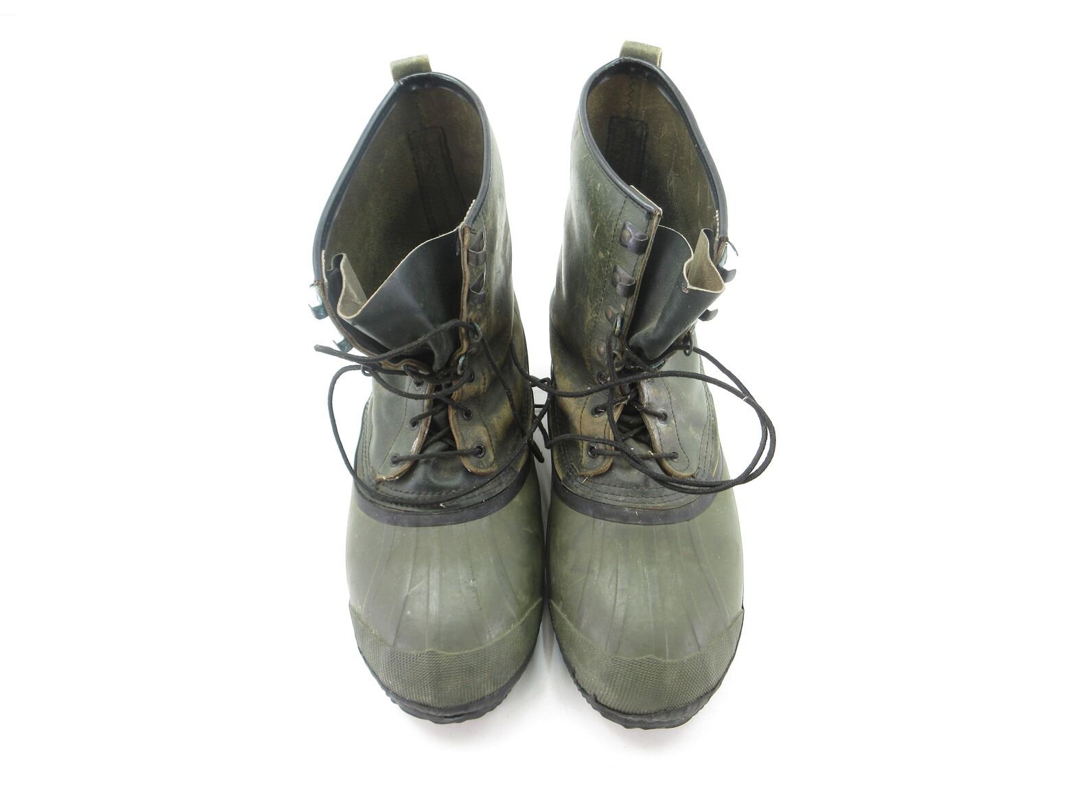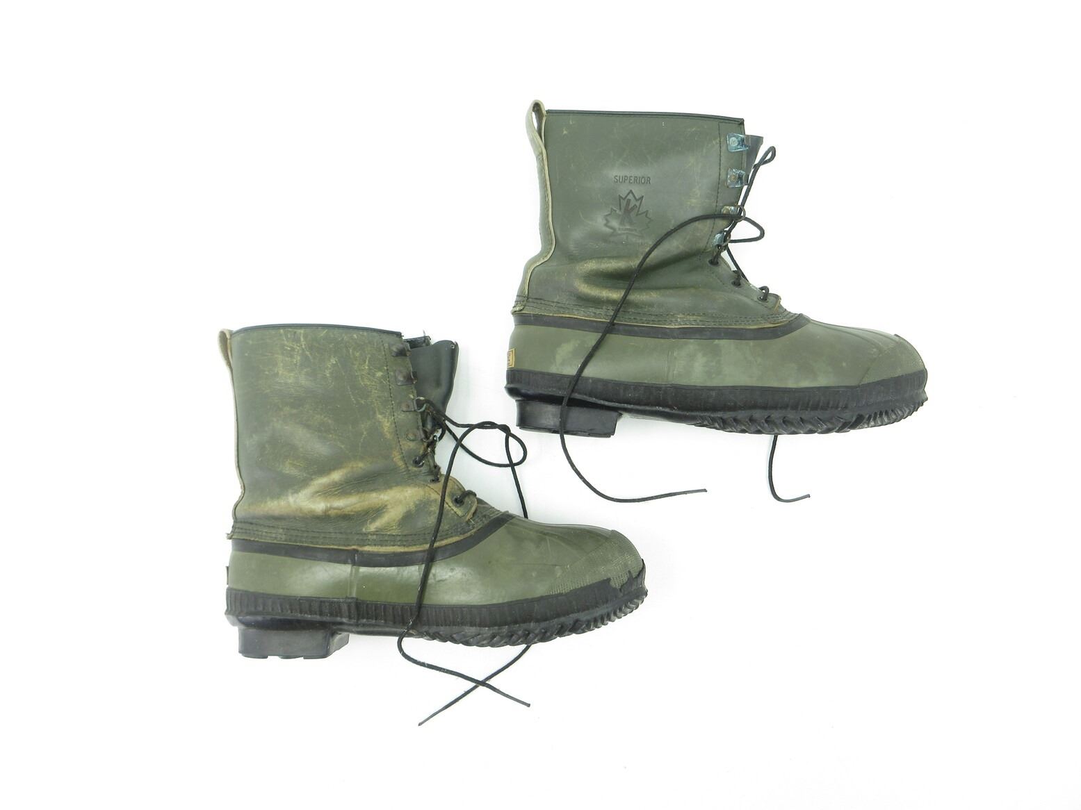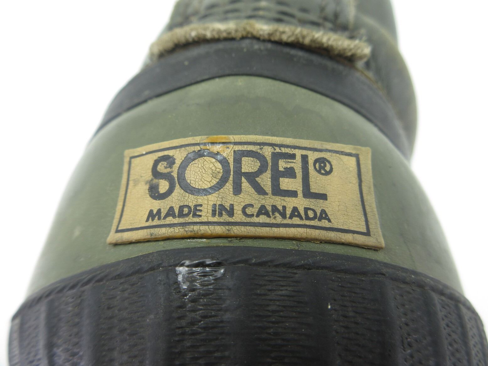 MEN'S SOREL SUPERIOR KAUFMAN SIZE 13 BOOTS. (1) PAIR OF BOOTS, SIZE MEN'S 13, GREEN LEATHER, UNLINED, RUBBERIZED SOLES, SHOWS WEAR & TEAR, LACE UP. SEE PHOTOS.