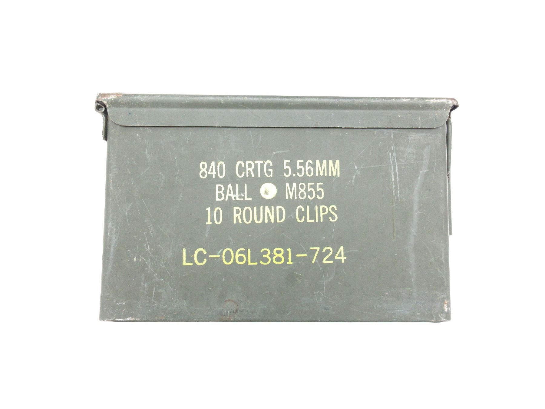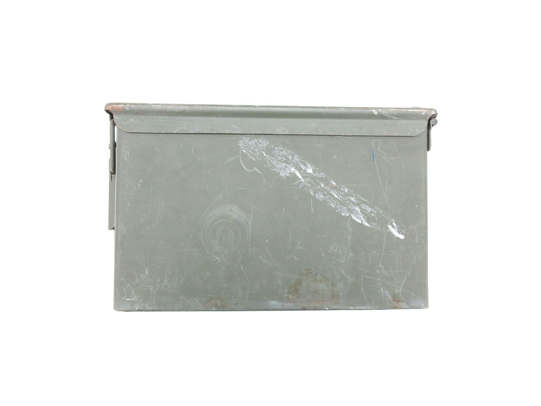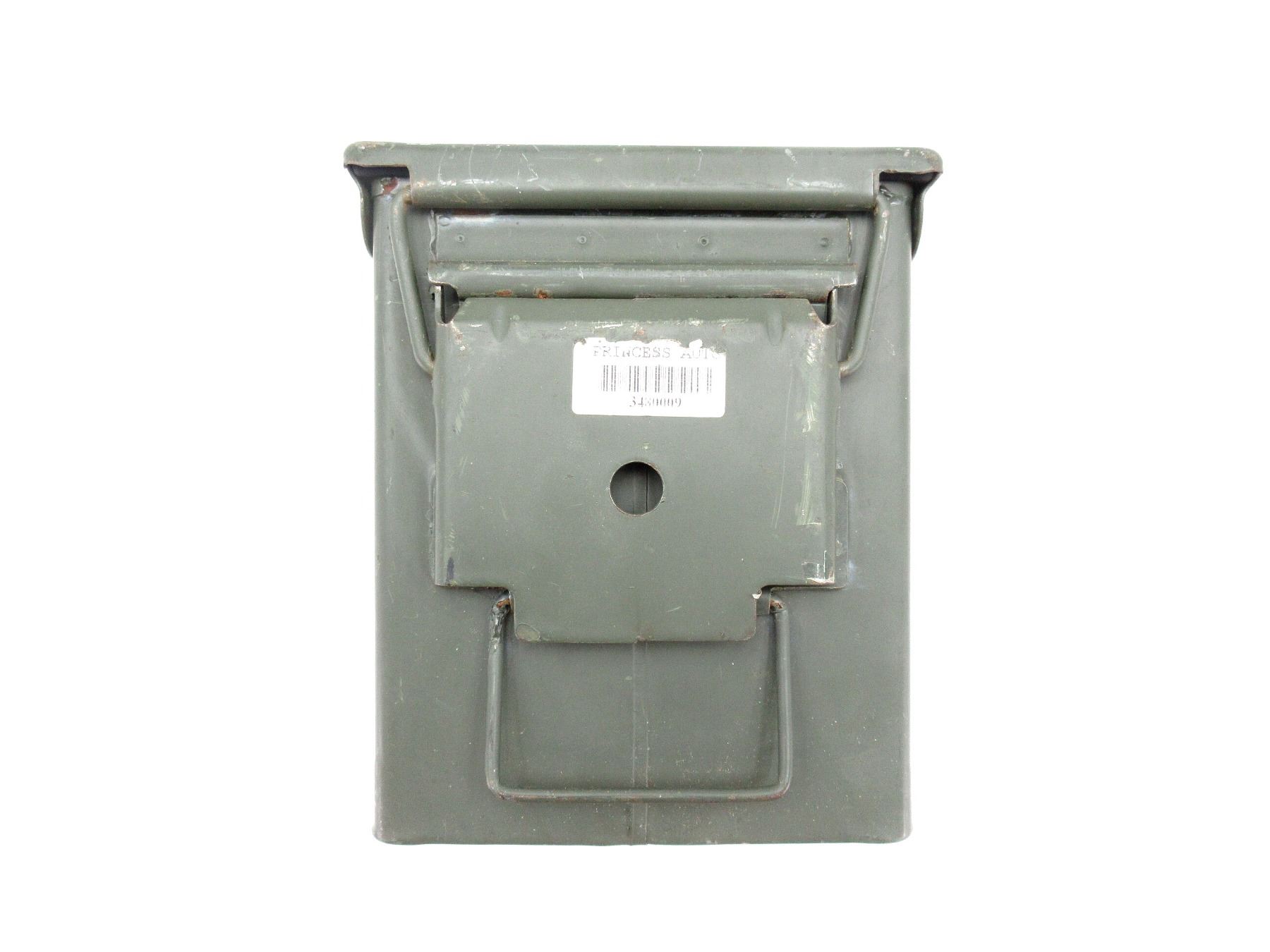 (1) GREEN PAINTED METAL AMMO TIN, VARIOUS MARKINGS & APPROX. 12" X 6" X 7.25". SEE PHOTOS.