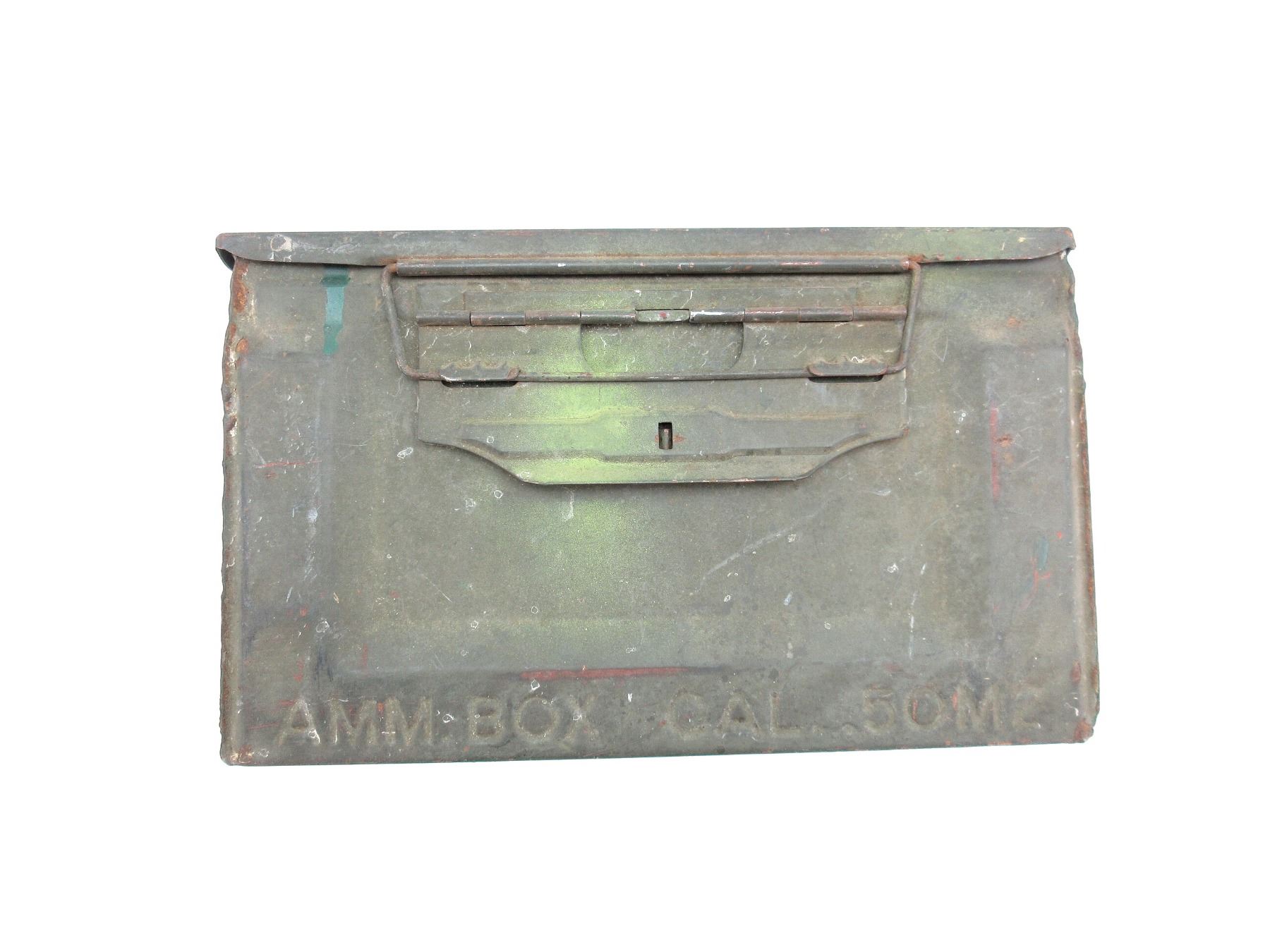 (1) GREEN PAINTED METAL AMMO TIN, VARIOUS MARKINGS & APPROX. 12.25" X 6.25" X 7.5". SEE PHOTOS.