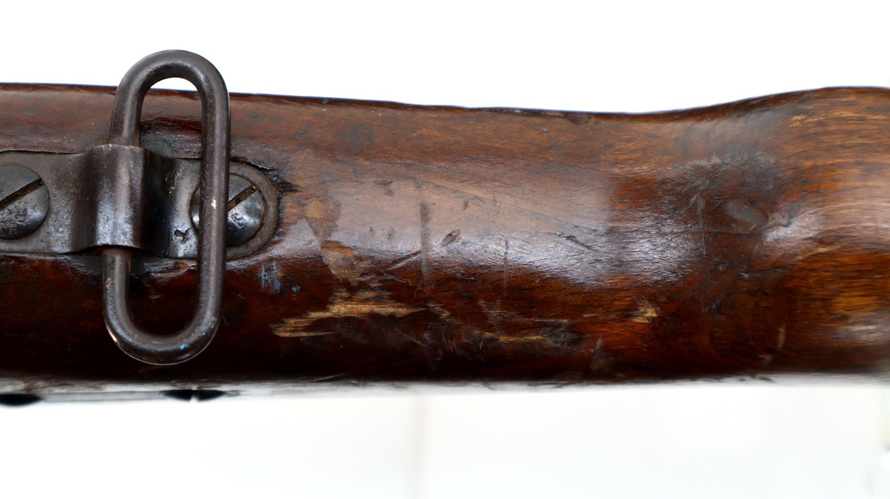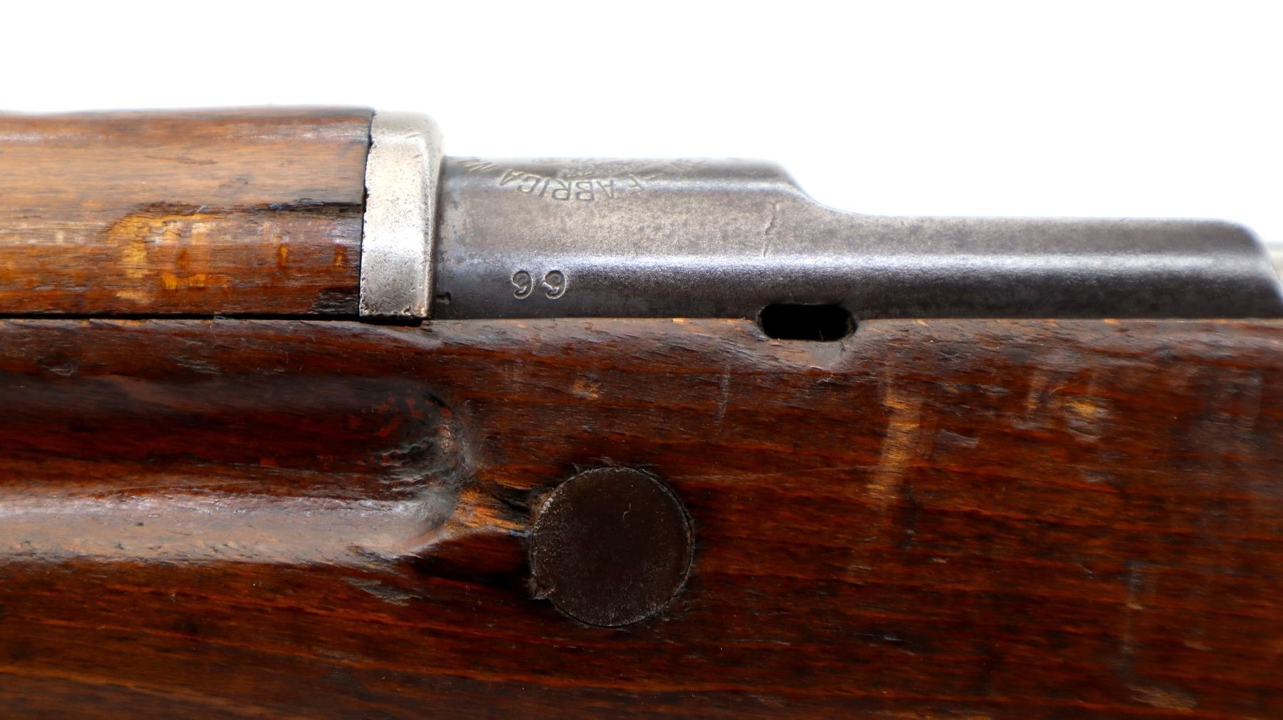 Main Description: Manufactured by National Arms 1936, bolt mismatched. Barley corn front sight with ramp, adjustable u notched rear sight, blued finish, Mexican crest on receiver ring, silver bolt with turned down handle and checkered cocking piece. Two piece full military wood stocks, finger grooved forearm, cracked in front of rear sight, some chips around recoil lug, pistol grip, smooth steel butt plate with trap, heel of stock has a brass disk numbered 123 with various markings, sling swivels, bayonet lug. Missing cleaning rod.