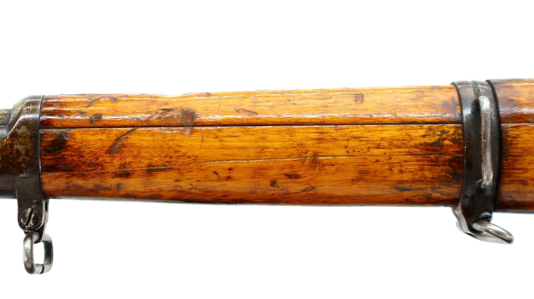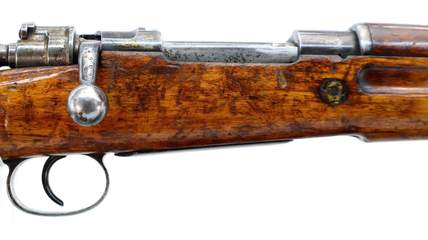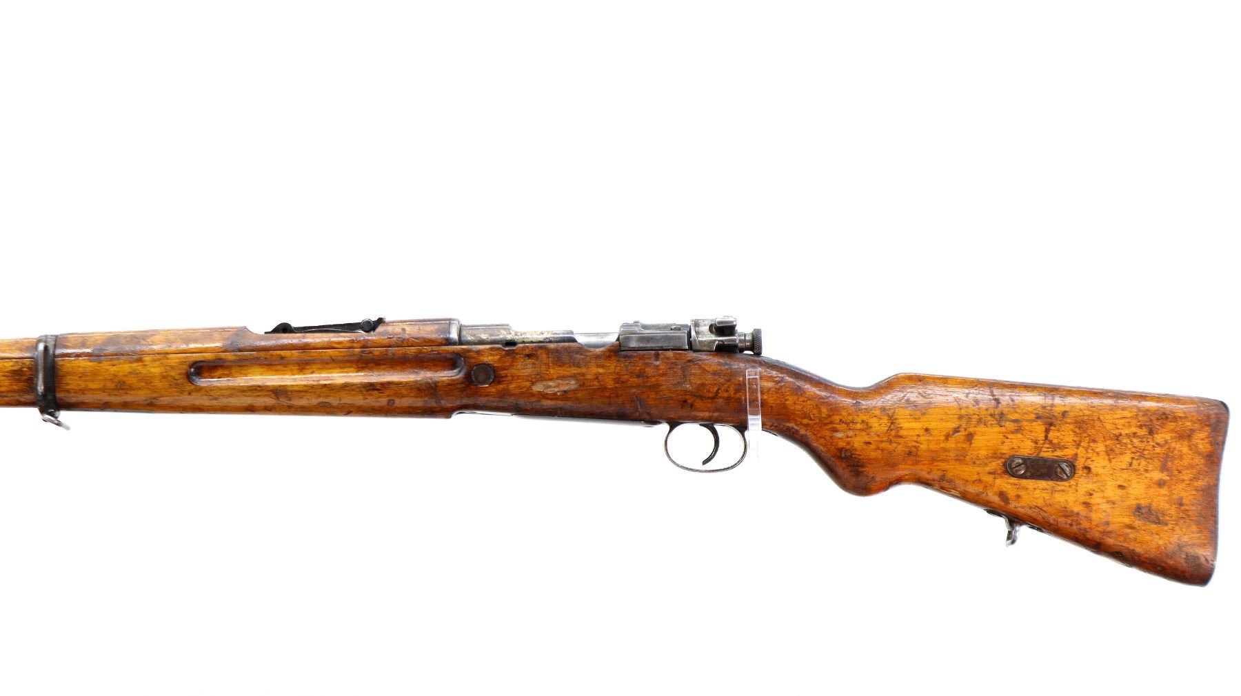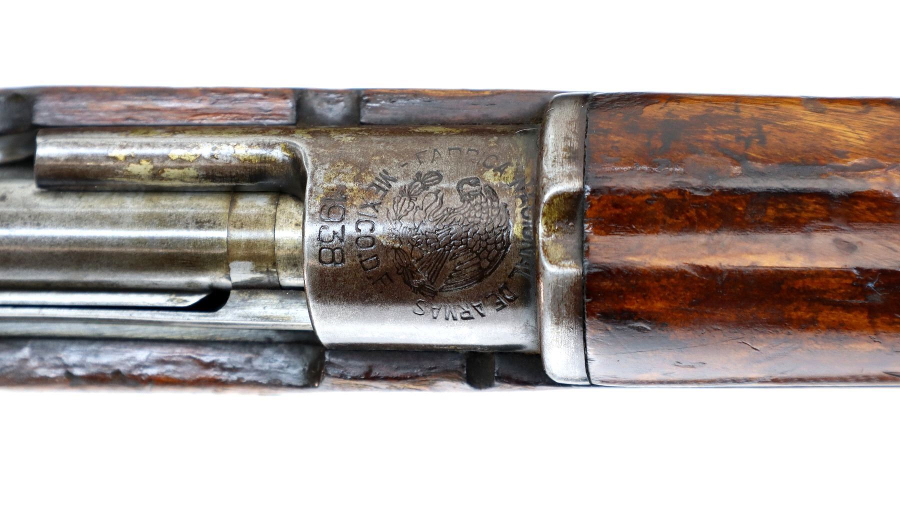 Main Description: Manufactured by National Arms 1938, bolt matches. Barley corn front sight with ramp missing ears, u notched rear sight missing elevation catch, Mexican crest on receiver ring, turned down bolt handle, checkered cocking piece. Two piece refinished full military wood stocks, finger grooved forearm, pistol grip, smooth steel butt plate with trap, sling swivels, bayonet lug, missing cleaning rod.