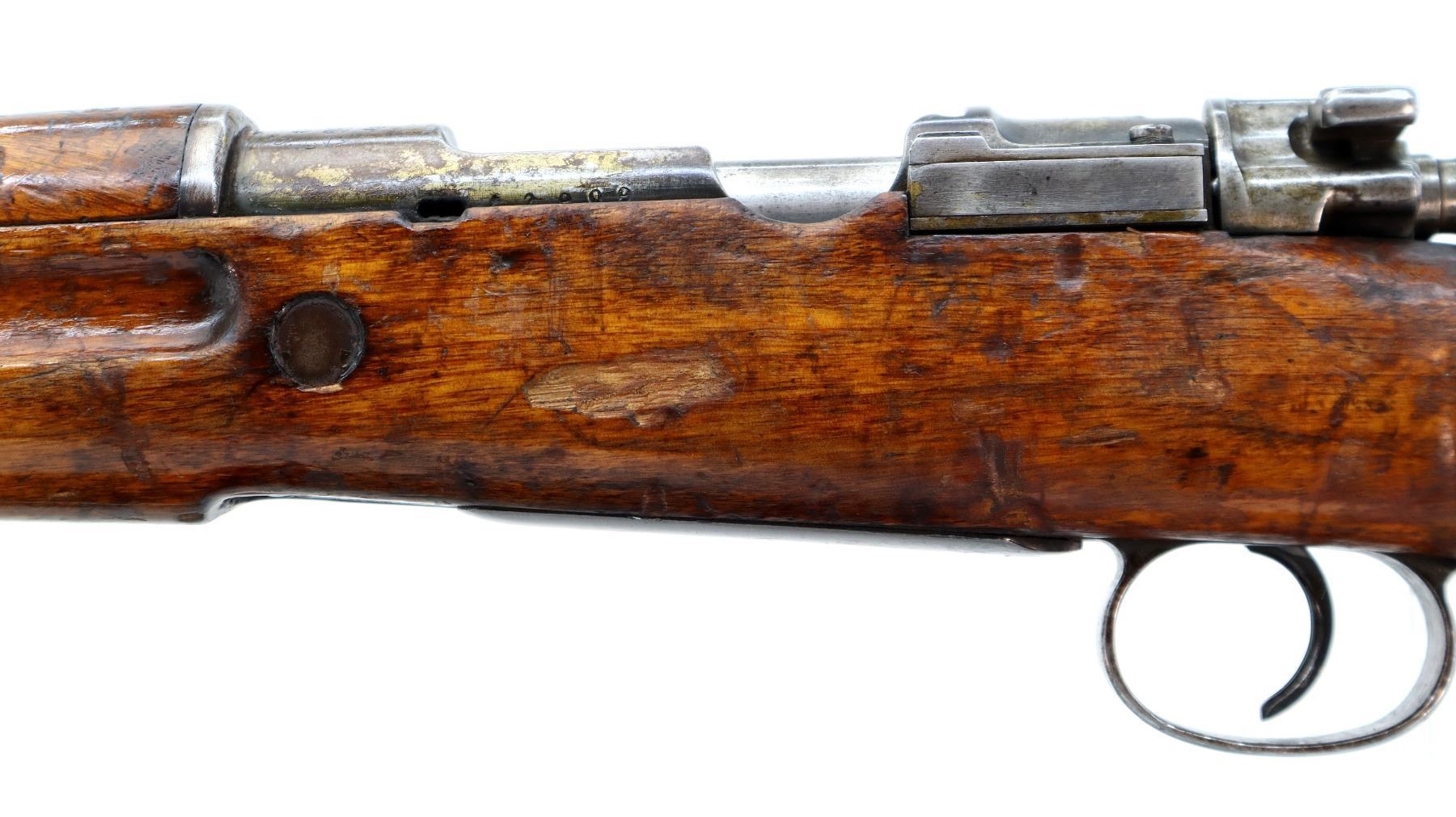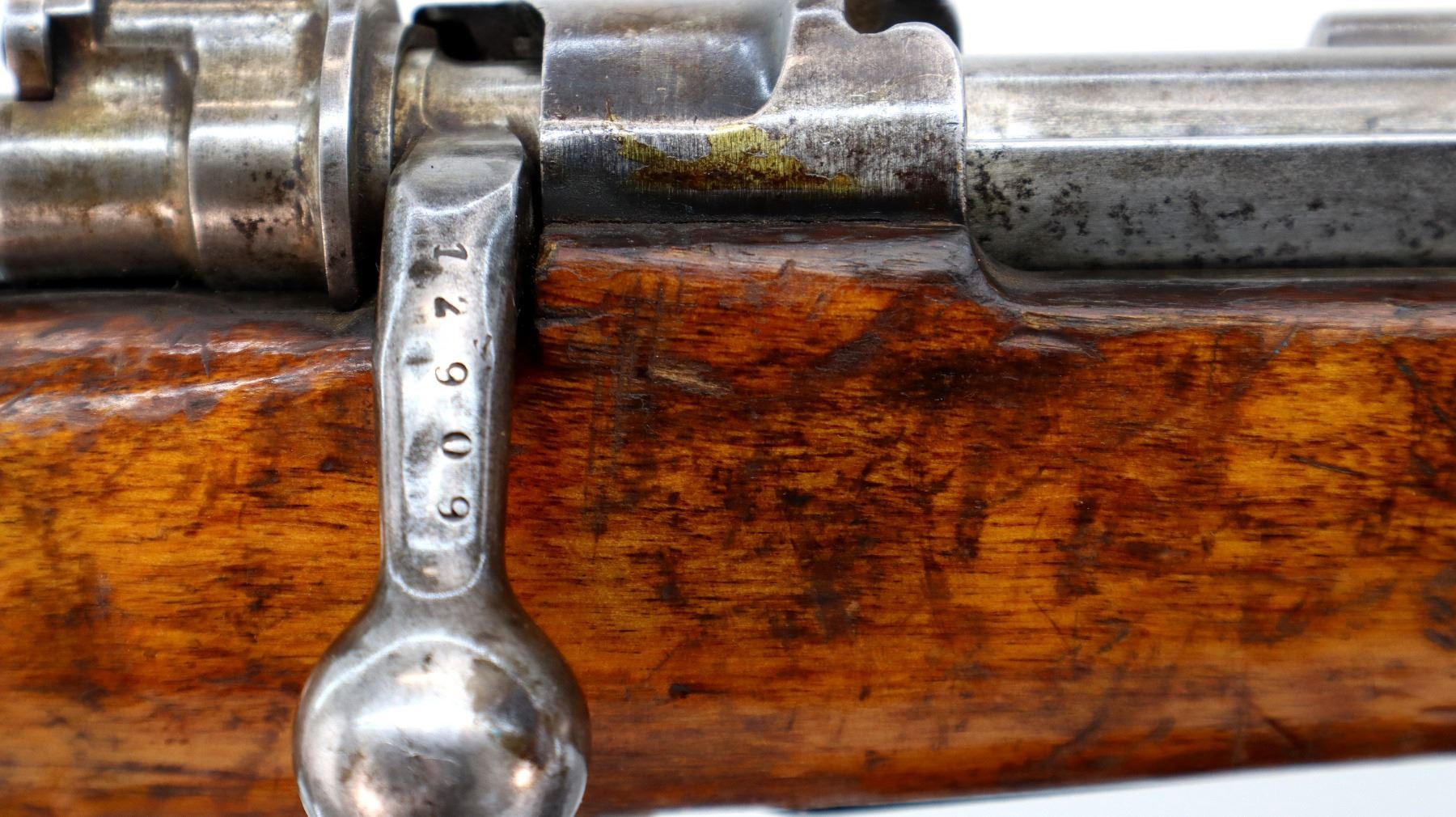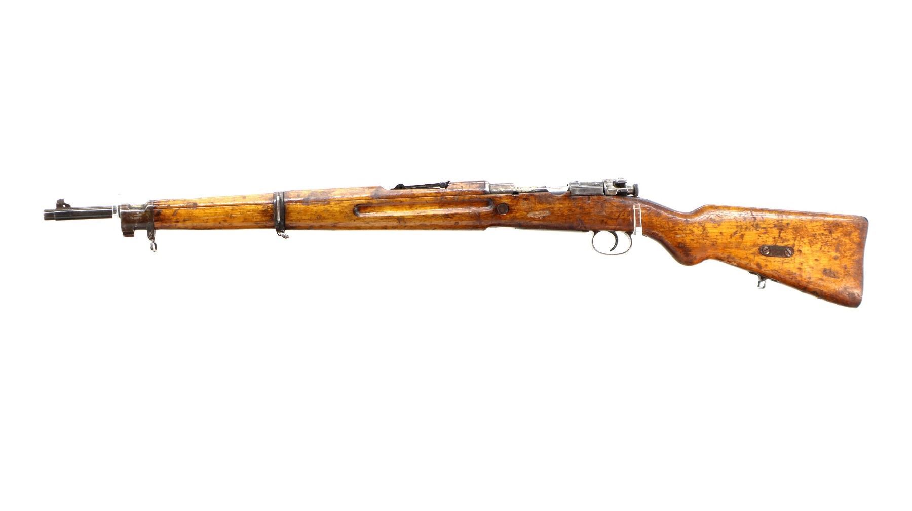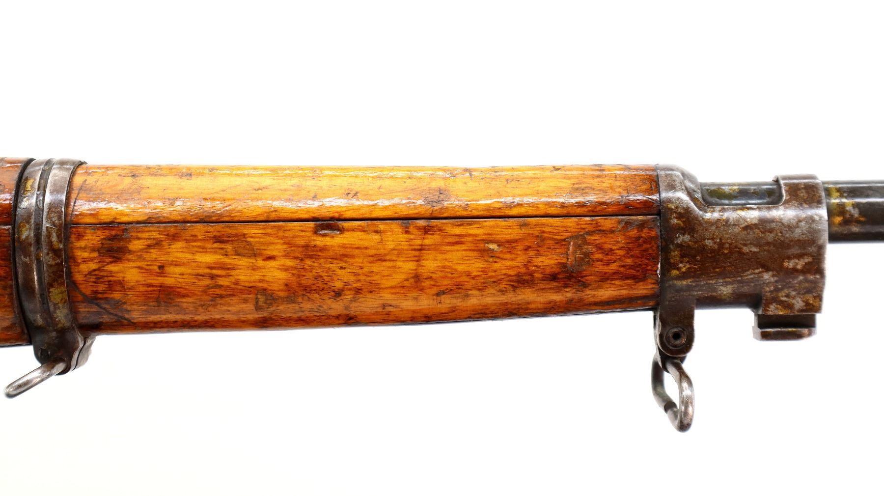Main Description: Manufactured by National Arms 1938, bolt matches. Barley corn front sight with ramp missing ears, u notched rear sight missing elevation catch, Mexican crest on receiver ring, turned down bolt handle, checkered cocking piece. Two piece refinished full military wood stocks, finger grooved forearm, pistol grip, smooth steel butt plate with trap, sling swivels, bayonet lug, missing cleaning rod.