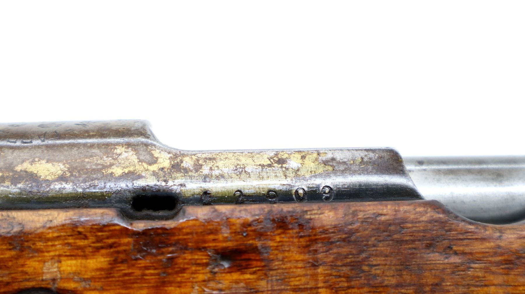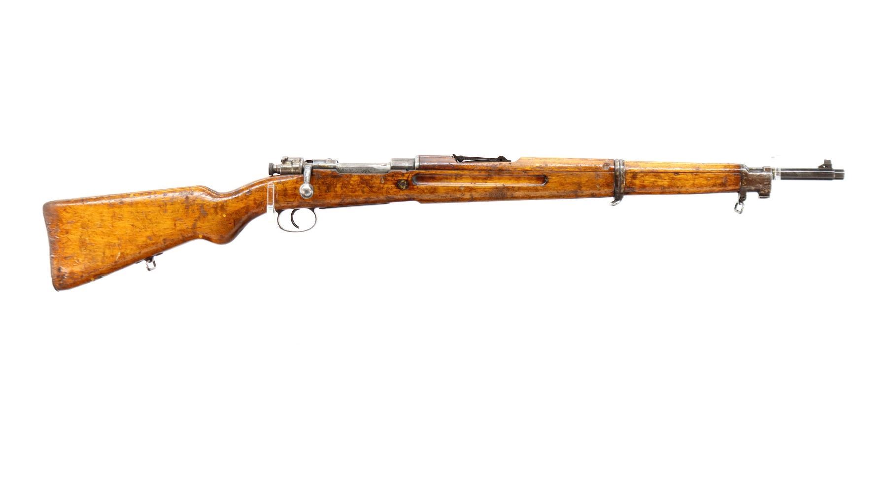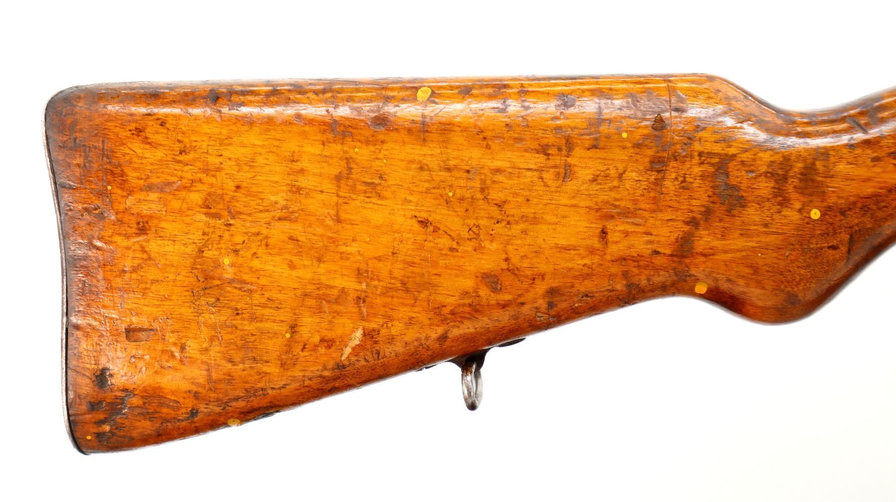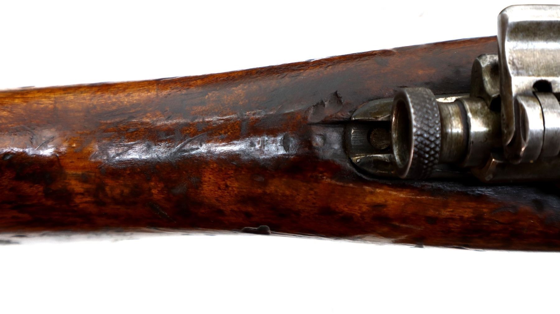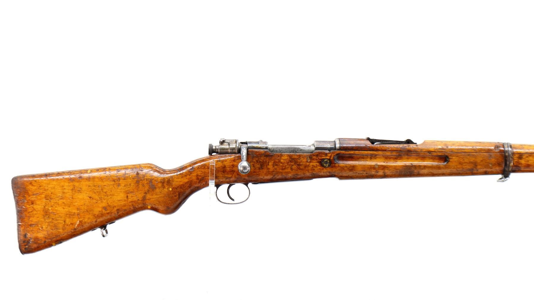 Main Description: Manufactured by National Arms 1938, bolt matches. Barley corn front sight with ramp missing ears, u notched rear sight missing elevation catch, Mexican crest on receiver ring, turned down bolt handle, checkered cocking piece. Two piece refinished full military wood stocks, finger grooved forearm, pistol grip, smooth steel butt plate with trap, sling swivels, bayonet lug, missing cleaning rod.