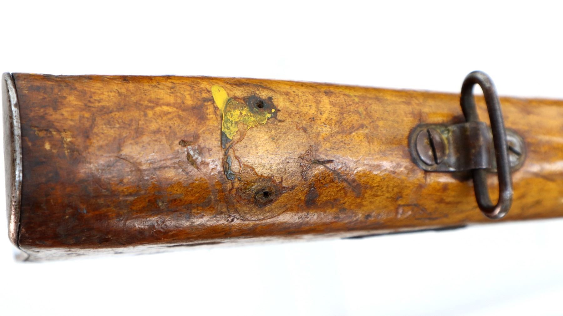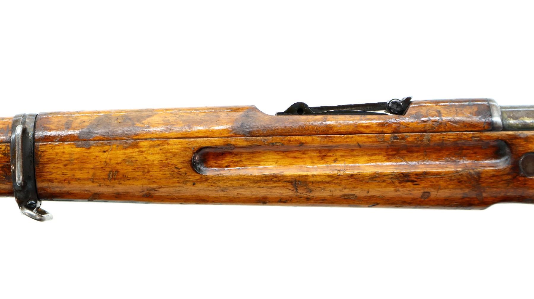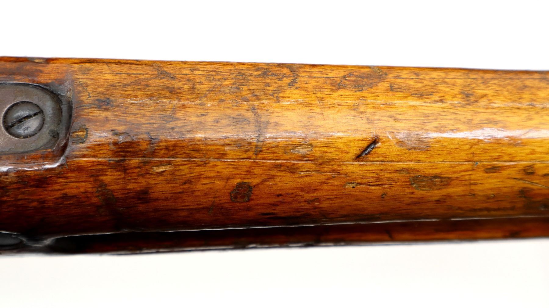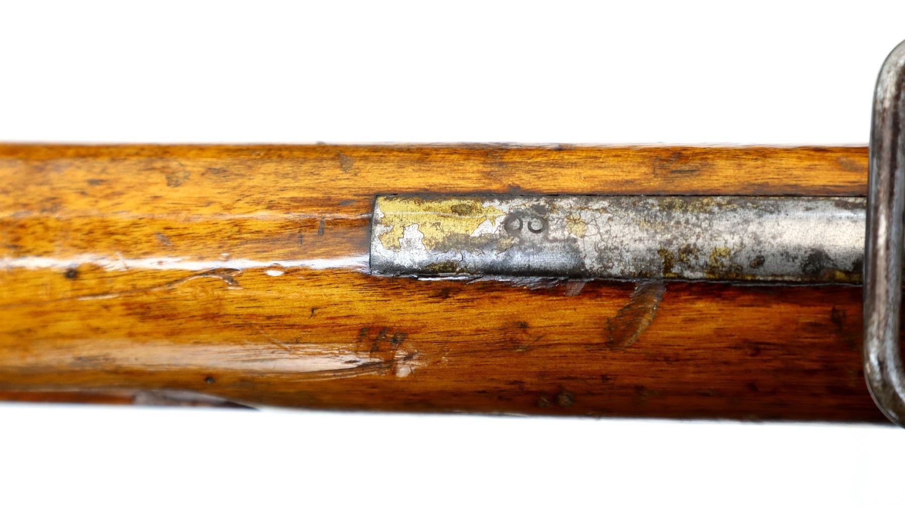 Main Description: Manufactured by National Arms 1938, bolt matches. Barley corn front sight with ramp missing ears, u notched rear sight missing elevation catch, Mexican crest on receiver ring, turned down bolt handle, checkered cocking piece. Two piece refinished full military wood stocks, finger grooved forearm, pistol grip, smooth steel butt plate with trap, sling swivels, bayonet lug, missing cleaning rod.