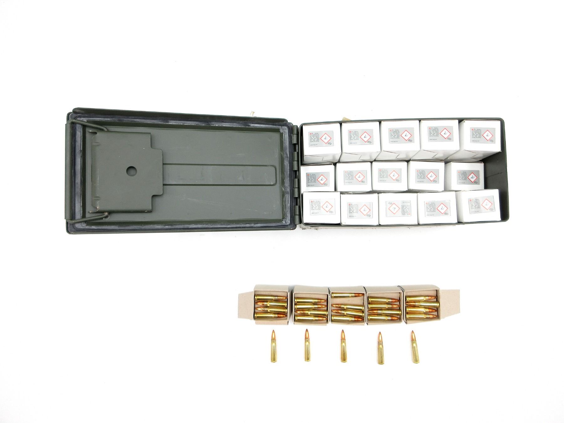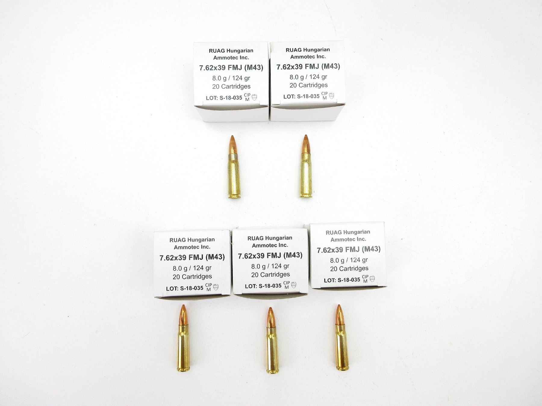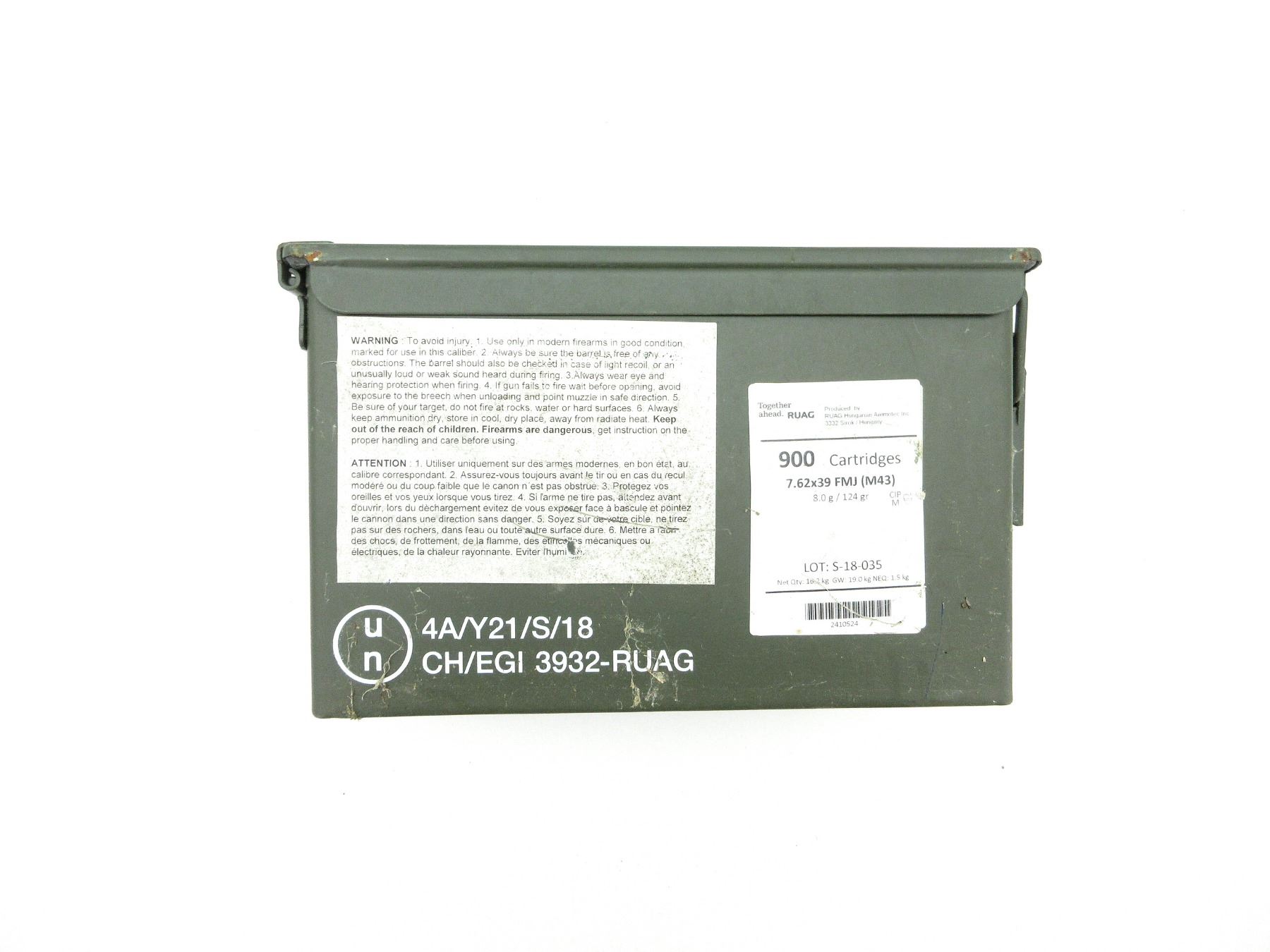 LOT INCLUDES; APPROX (900) RNDS, 124 GRNS (STATED ON BOXES NOT CONFIRMED), FMJ, (M43), ONE METAL AMMO LOT, APPROX. DIM 12"X6"X7", MADE IN HUNGARY.