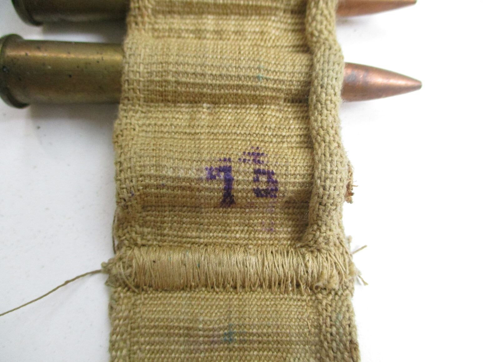 MILITARY WWII BRITISH .303 BR ON MG BELT, 247 RNDS ON VICKERS STRIPLESS BELT WITH STARTER TAG, DATED 1945. LOT ALSO INCLUDES (1) DRY/AMMO BOX APPROX. 12 X 7 X 9, THERE ARE NEW SHIPPING RESTRICTIONS, PLEASE MAKE SURE YOU HAVE READ AND CONFIRMED WE CAN SHIP TO YOU BEFORE BIDDING ON THIS LOT. PLEASE SEE LOT 0 IN THIS SESSION. NO REFUNDS WILL BE ISSUED, OR BIDS RETRACTED
