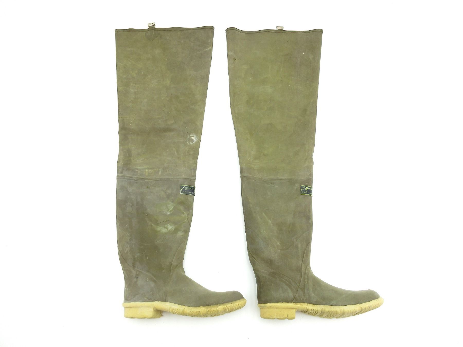(1) PAIR OF TAN HIP WADERS, SHOE SIZE APPROX. 11" LONG, OVERALL HEIGHT APPROX. 31.5", SHOWS WEAR / TEAR. SEE PHOTOS.