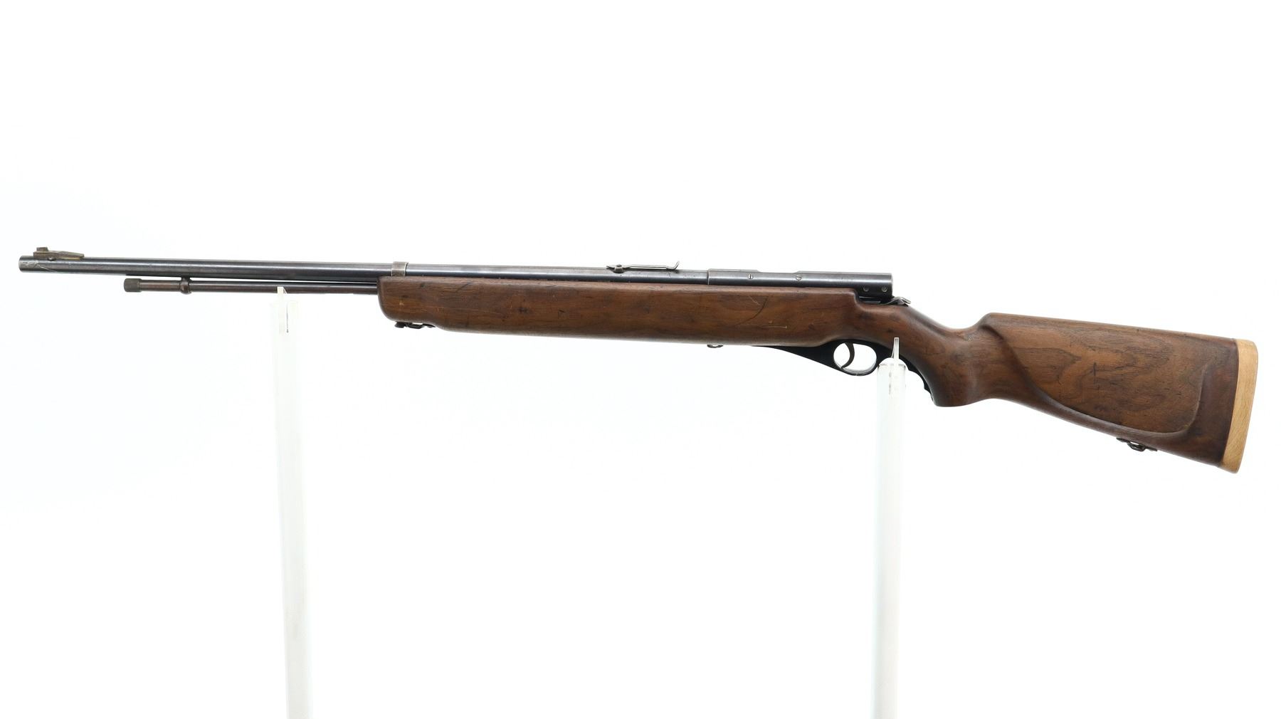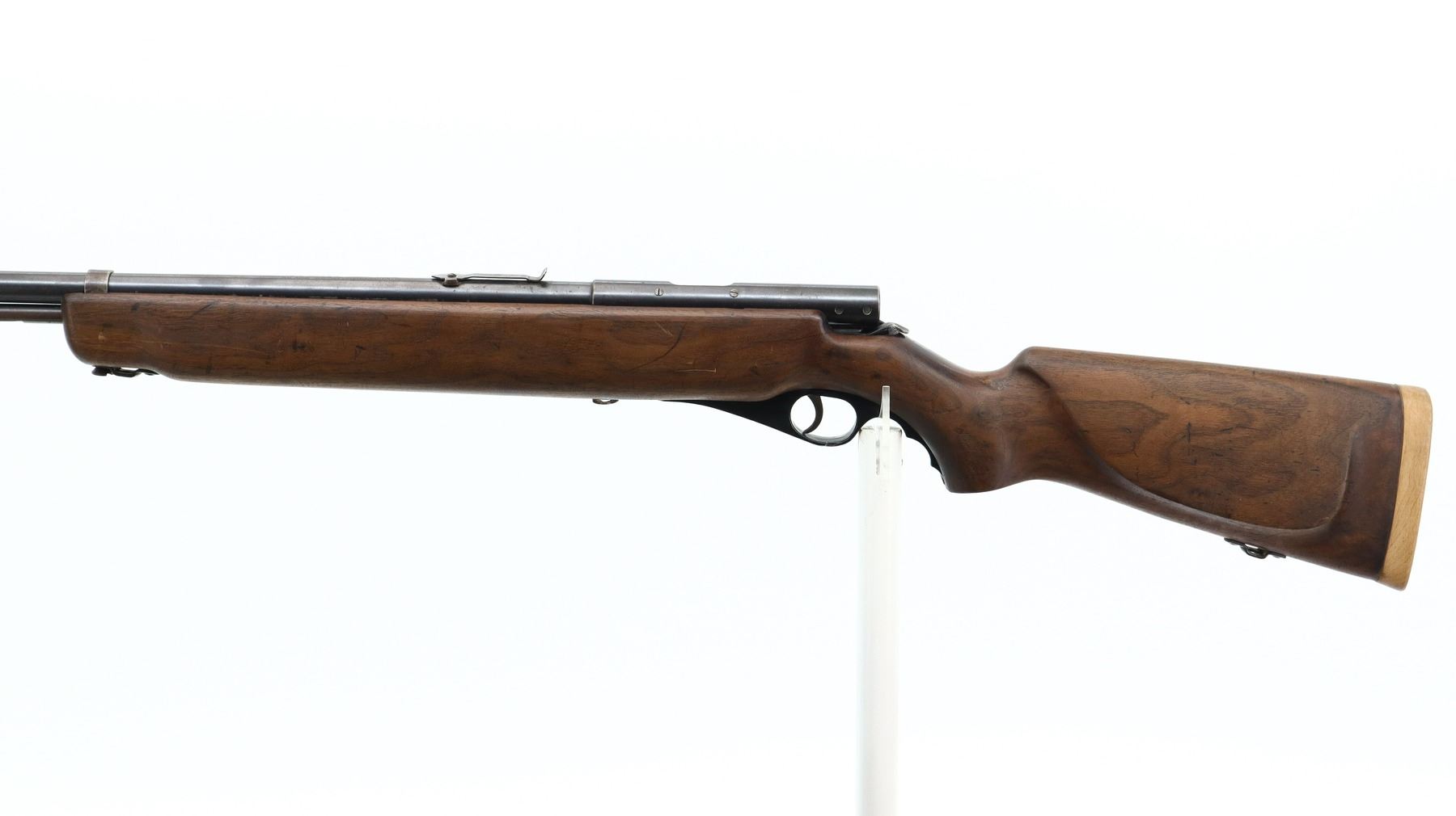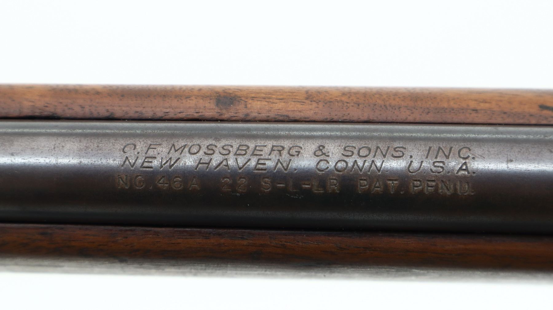 2/10 , MOSSBERG , MODEL: 46A , CALIBER: 22 LR , BORE IS VERY GOOD. BLADE FRONT SIGHT WITH RAMP, U NOTCHED REAR SIGHT MISSING ELEVATOR, BOLT IS INCLUDED DOES NOT STAY IN RIFLE NEEDS REPAIR, RECEIVER DRILLED AND TAPPED FOR SCOPE MOUNT AND PEEP SIGHT. ONE PIECE SMOOTH WOOD STOCK, PISTOL GRIP, CHEEK REST, SMOOTH WOOD BUTT PLATE, BLACK POLYMER TRIGGER GUARD WITH REPLACED SCREWS AND SWIVEL STUDS. METAL FINISH SHOWS SCRATCHES, HANDLING MARKS AND WEAR. STOCK SHOWS DINGS, SCRATCHES AND FINISH WEAR. . ACTION: BOLT ACTION RIFLE. BARREL LENGTH: 26". CONDITION: 2/10. SERIAL # NA. CLASS: CANADIAN NON RESTRICTED CLASS