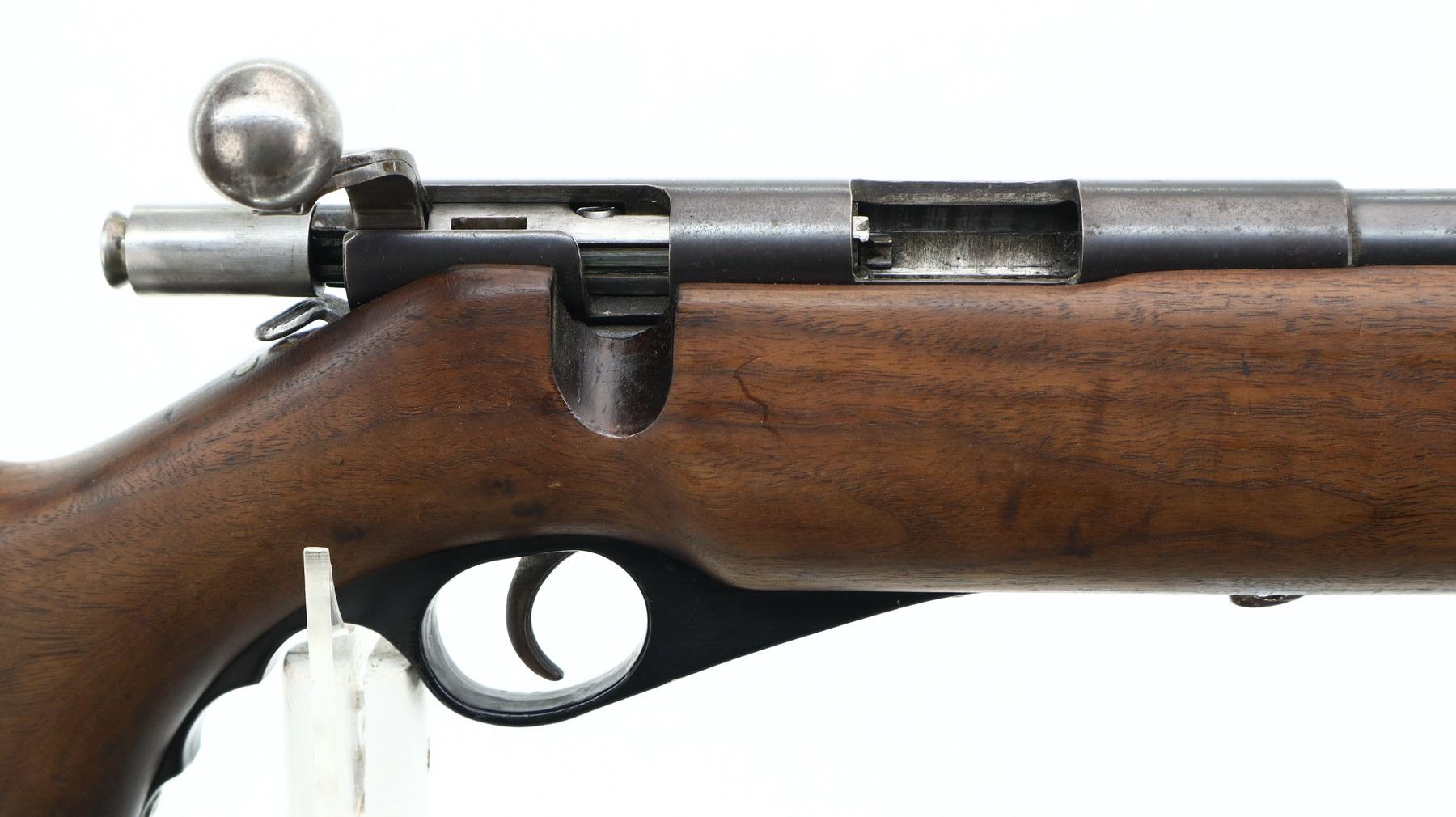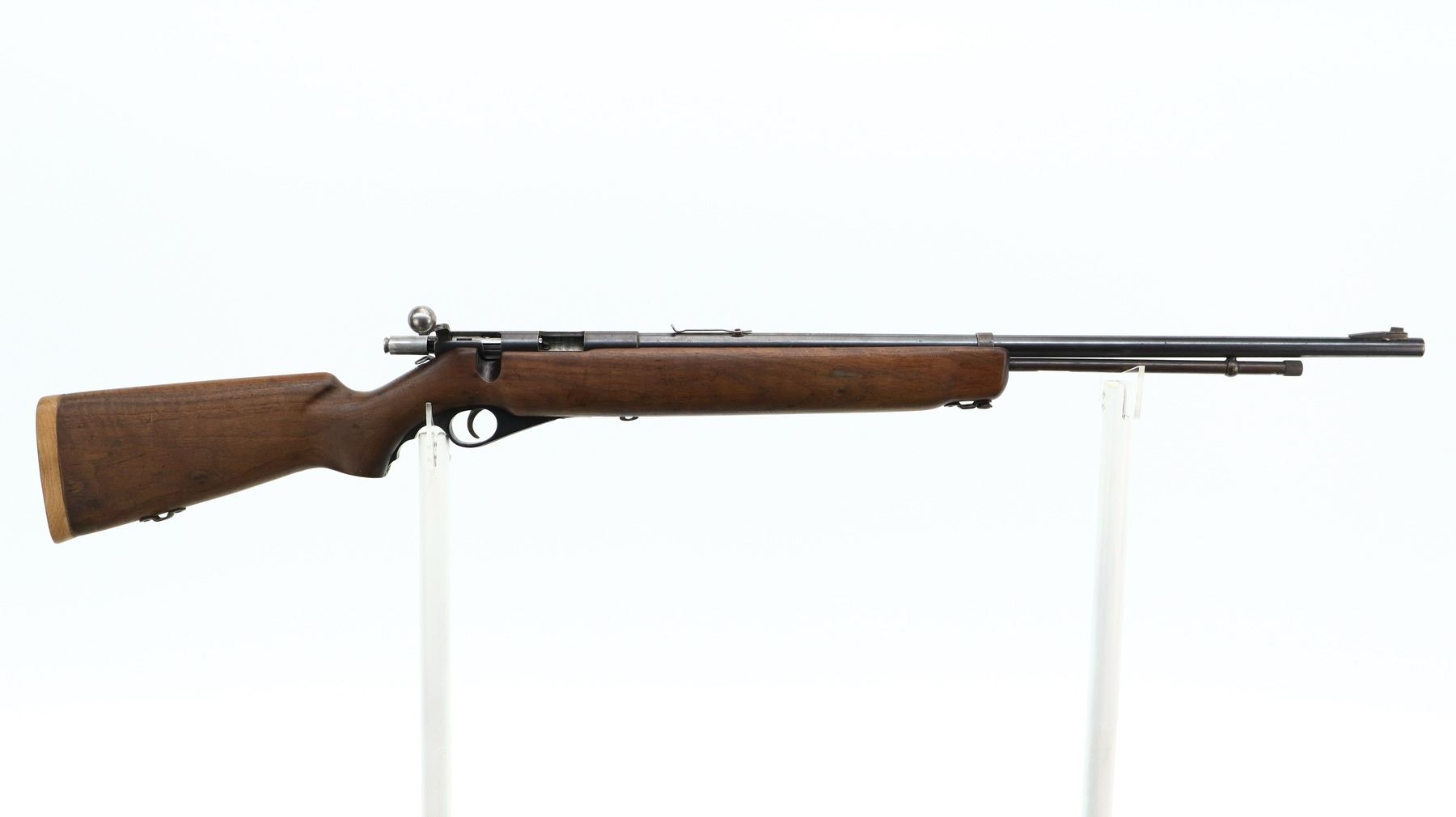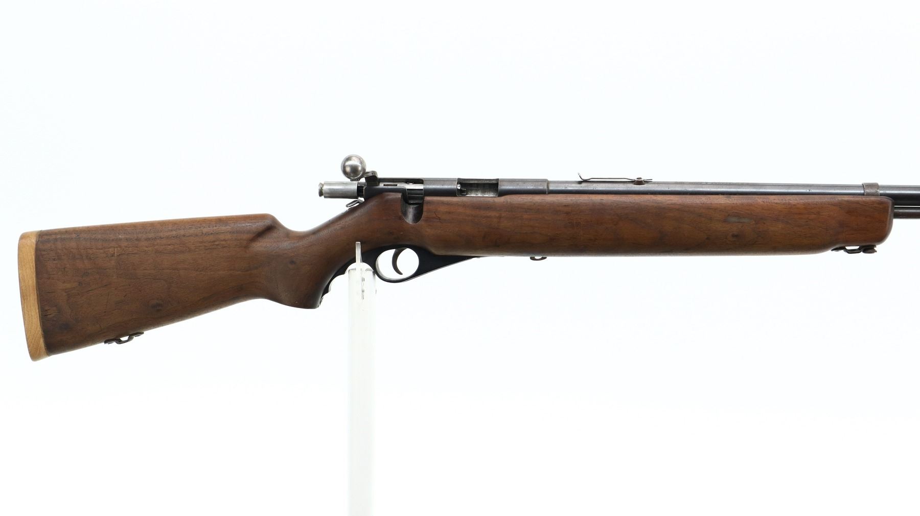 2/10 , MOSSBERG , MODEL: 46A , CALIBER: 22 LR , BORE IS VERY GOOD. BLADE FRONT SIGHT WITH RAMP, U NOTCHED REAR SIGHT MISSING ELEVATOR, BOLT IS INCLUDED DOES NOT STAY IN RIFLE NEEDS REPAIR, RECEIVER DRILLED AND TAPPED FOR SCOPE MOUNT AND PEEP SIGHT. ONE PIECE SMOOTH WOOD STOCK, PISTOL GRIP, CHEEK REST, SMOOTH WOOD BUTT PLATE, BLACK POLYMER TRIGGER GUARD WITH REPLACED SCREWS AND SWIVEL STUDS. METAL FINISH SHOWS SCRATCHES, HANDLING MARKS AND WEAR. STOCK SHOWS DINGS, SCRATCHES AND FINISH WEAR. . ACTION: BOLT ACTION RIFLE. BARREL LENGTH: 26". CONDITION: 2/10. SERIAL # NA. CLASS: CANADIAN NON RESTRICTED CLASS