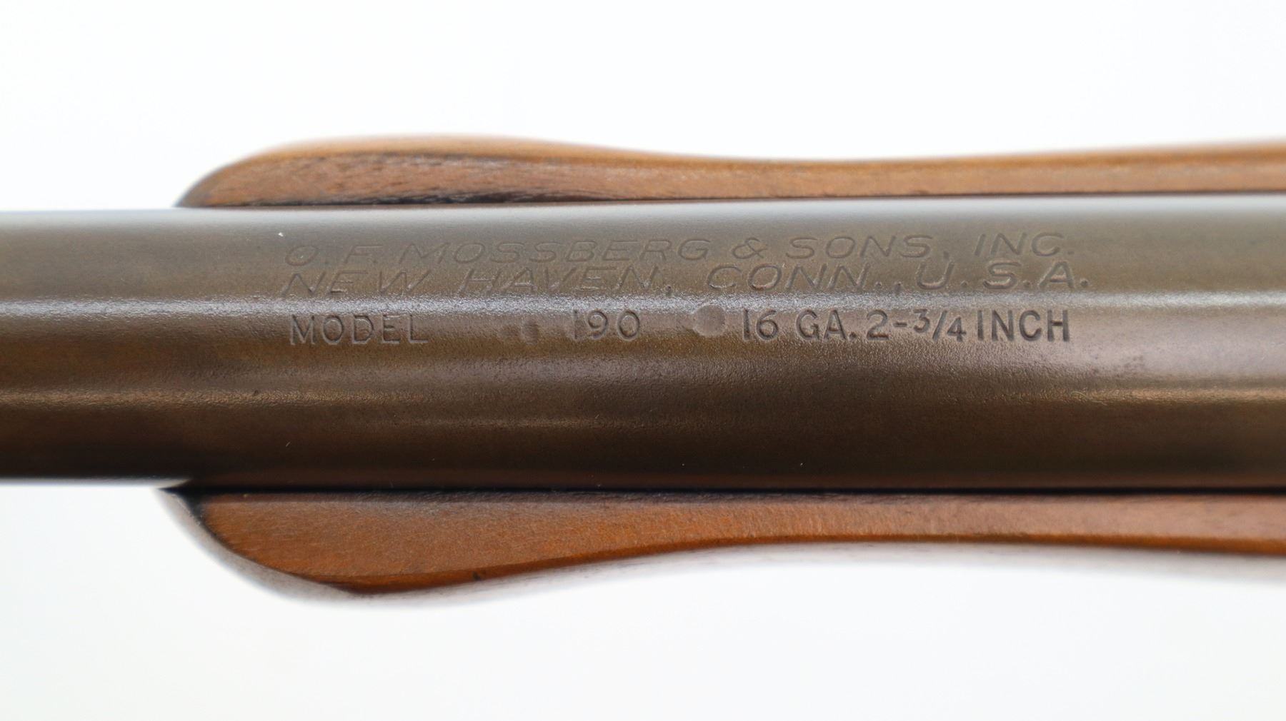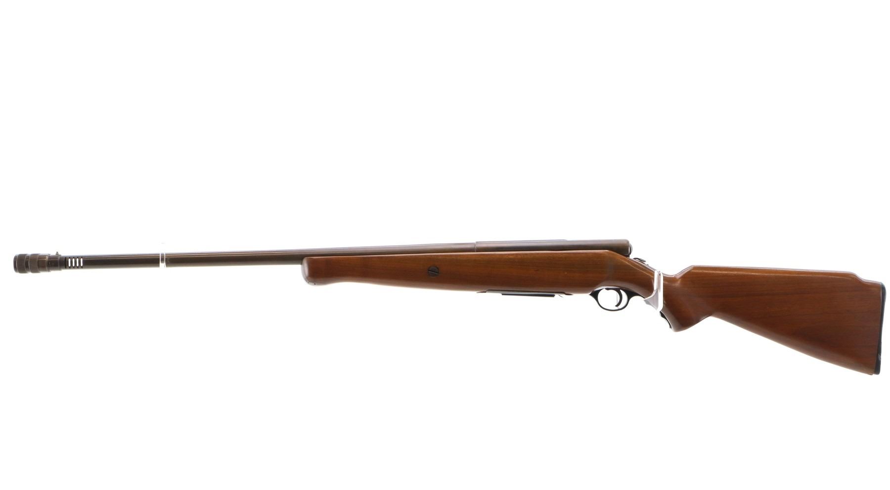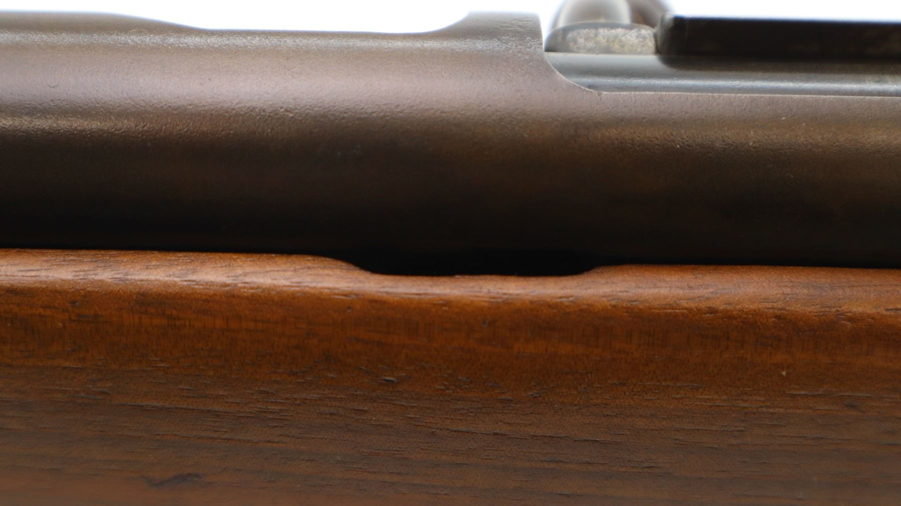 Main Description: Silver bead, ported round barrel, grooved bolt knob. One piece smooth wood stock, forearm has a repair, straight grip, retains safety buttons, grooved black polymer butt plate with small chip