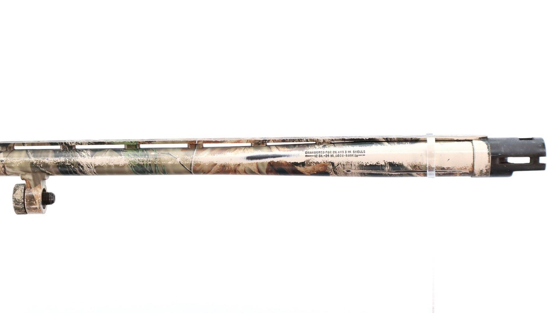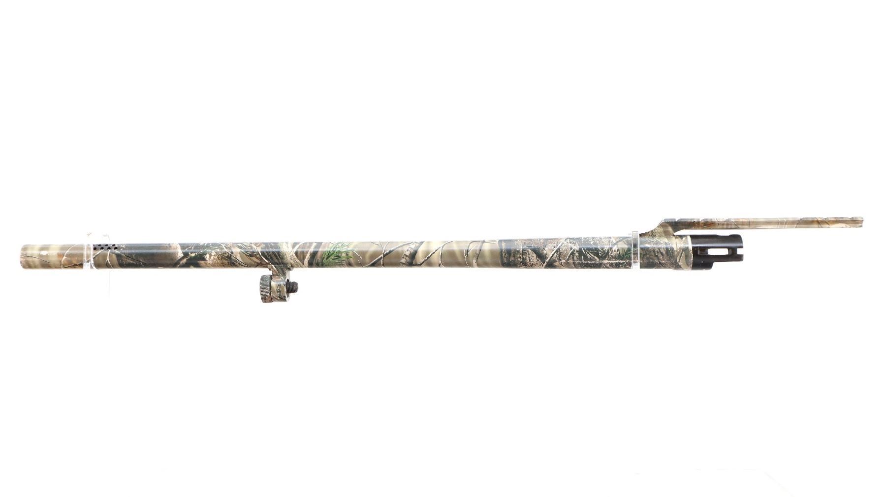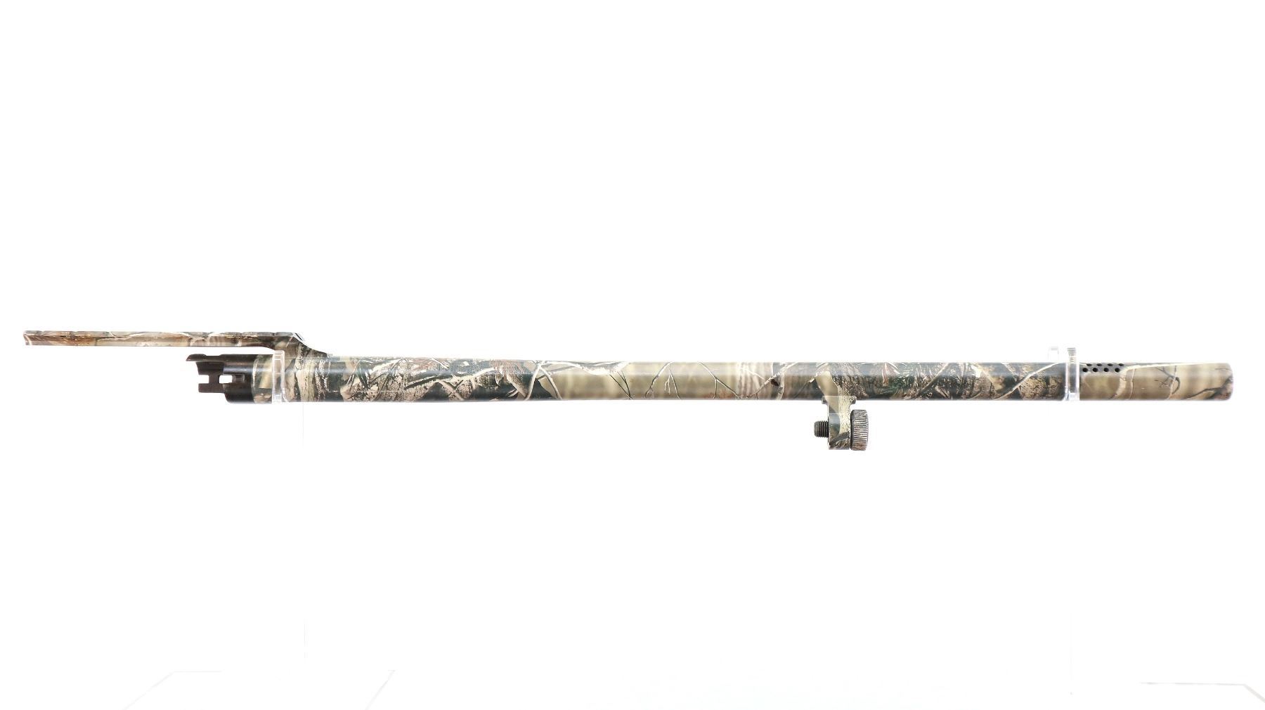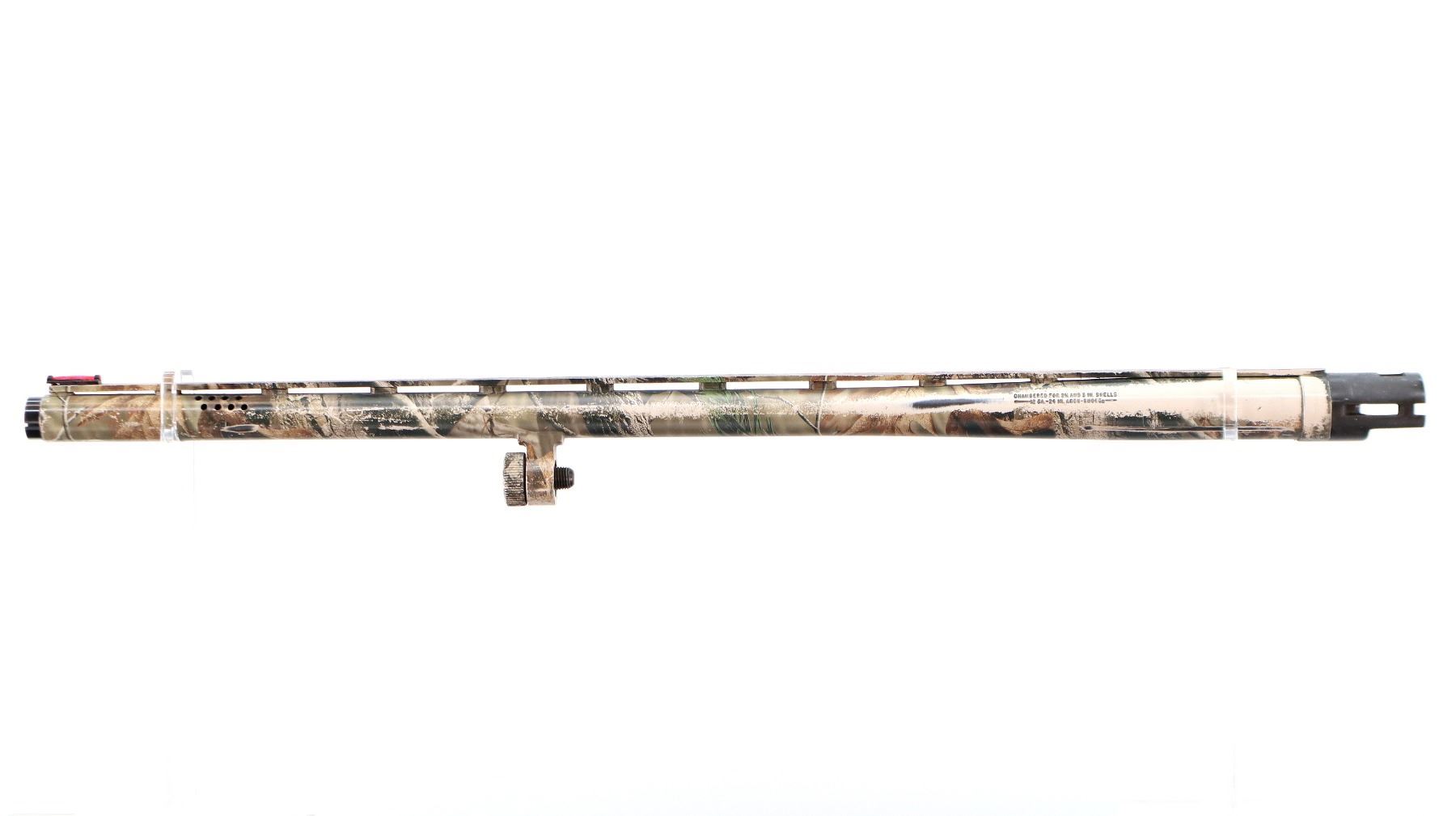 Main Description: White front and brass mid rib beads, Realtree APHD Camo overall, vent rib, ported barrel, alloy receiver, tang safety. Two piece synthetic stocks, finger grooved checkered forearm and pistol grip, black vented rubber recoil pad, swivel studs. 1st Spare Barrel: 12 GX3", 24", Bore is Very Good, Removable Full Choke which is not threaded in fully, may require cleaning or adjustment. APHD camo overall, Red fiber optic front bead, missing mid rib bead, vent rib, ported smooth bore. 2nd Spare Barrel: 12 G X 3", 24", Bore is Very Good (Requires cleaning). No bead, APHD Camo overall, Ported Fully rifled with Cantilever scope rail.
