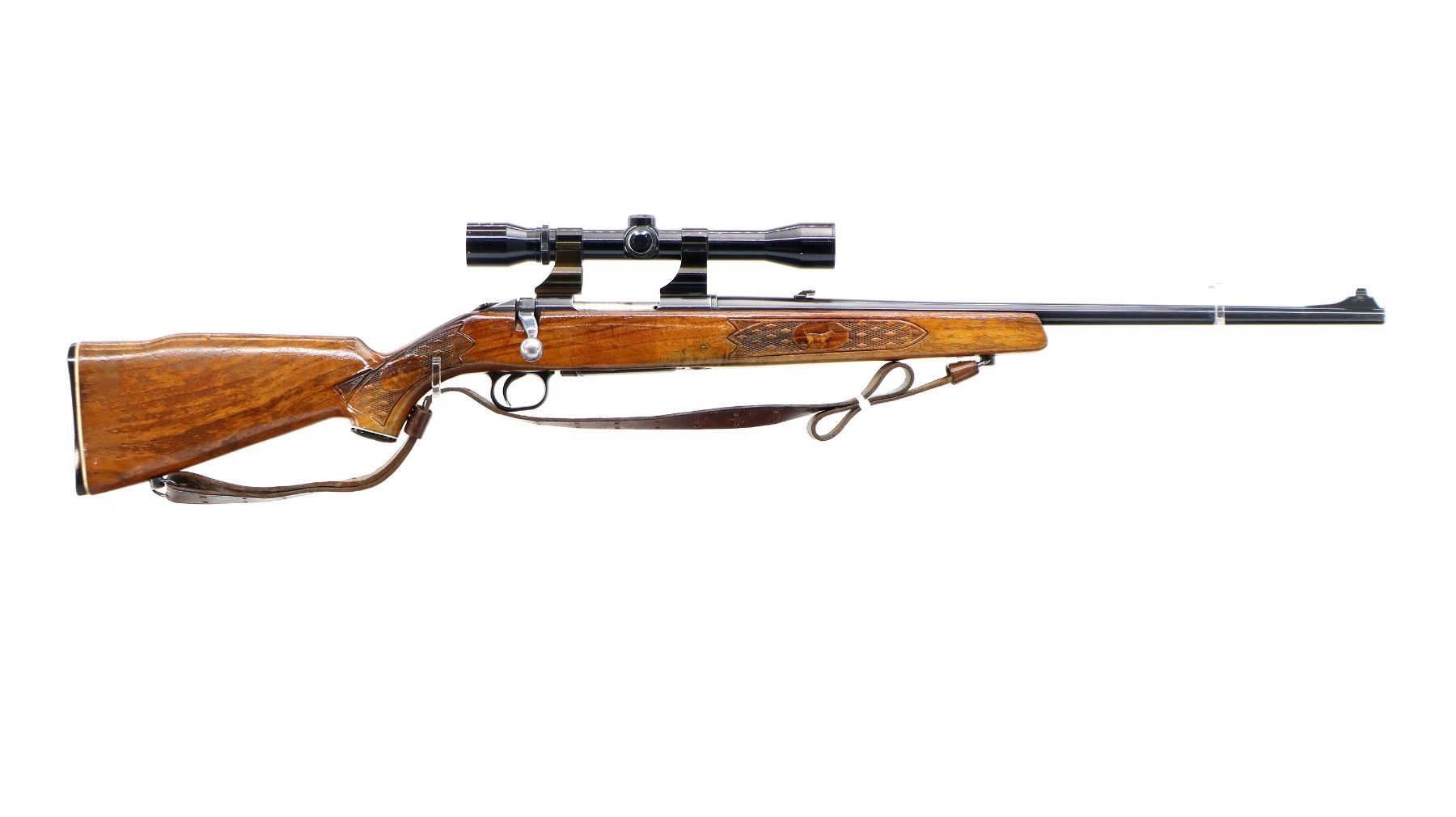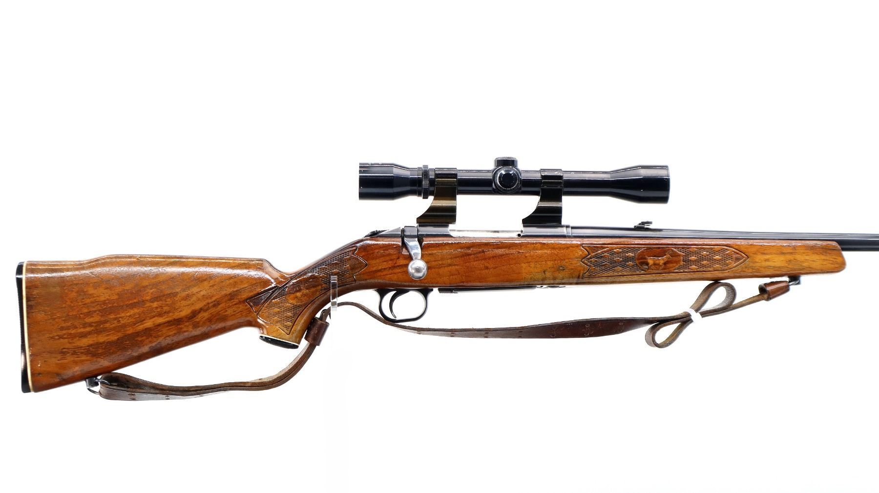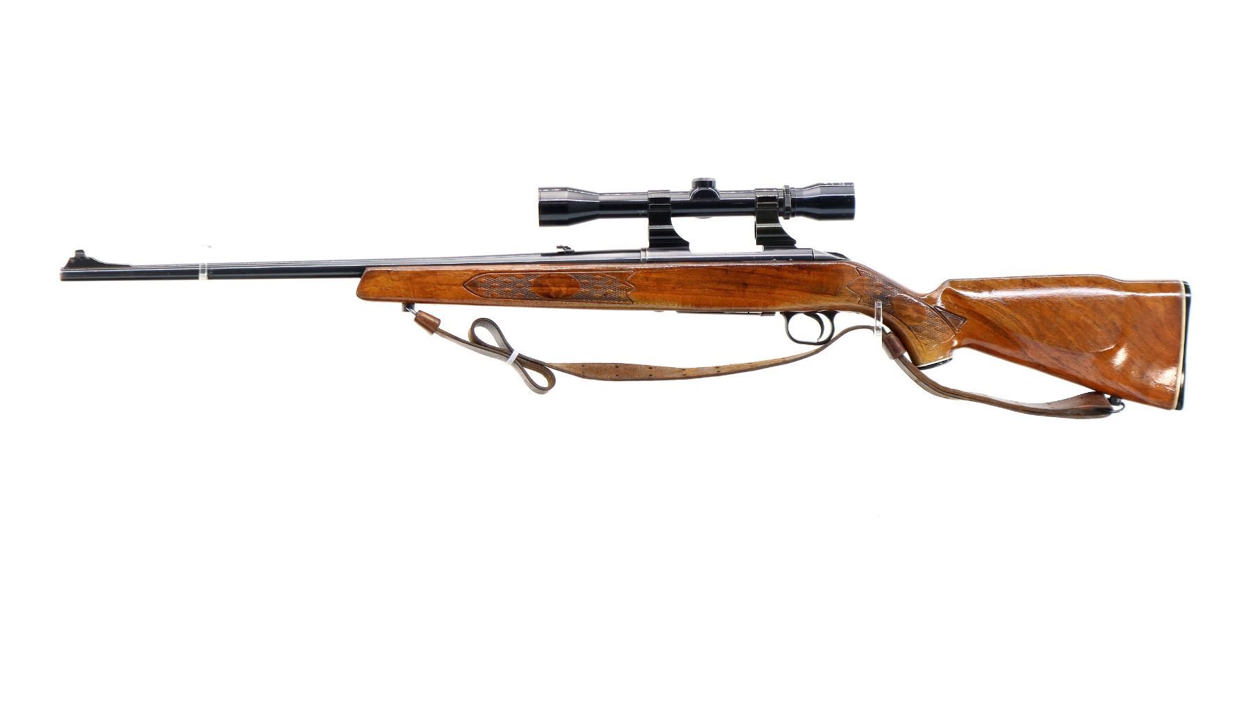 Main Description: Blade front sight with ramp, adjustable folding u notched rear sight, blued finish, receiver drilled and tapped with a Scope 4x32 Optic installed, clear optics with single post with fine horizontal line reticle. One piece refinished wood stock, forend tip is cracked on both sides, checkered forearm and pistol grip, cheek rest, grooved black polymer butt plate, 14" LOP, grip cap, hinged floor plate, sling swivels with brown leather sling.