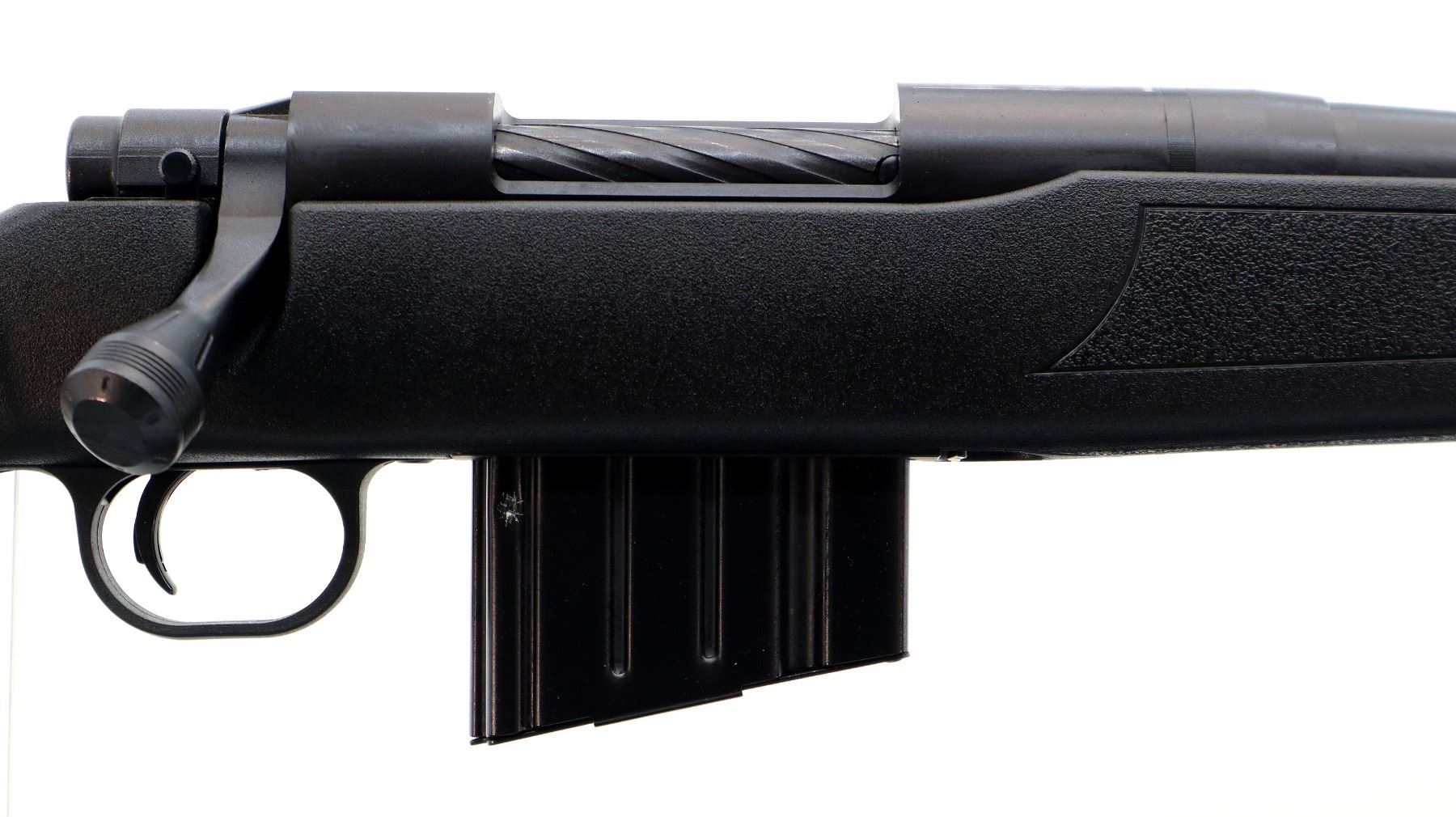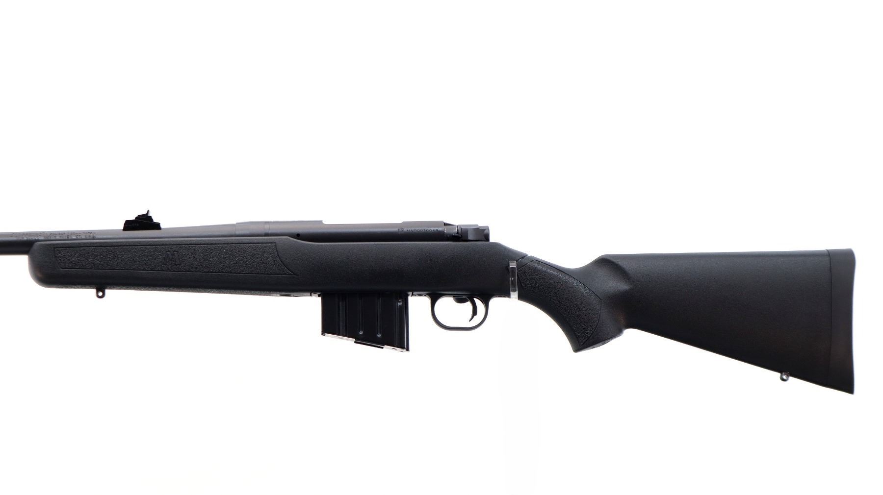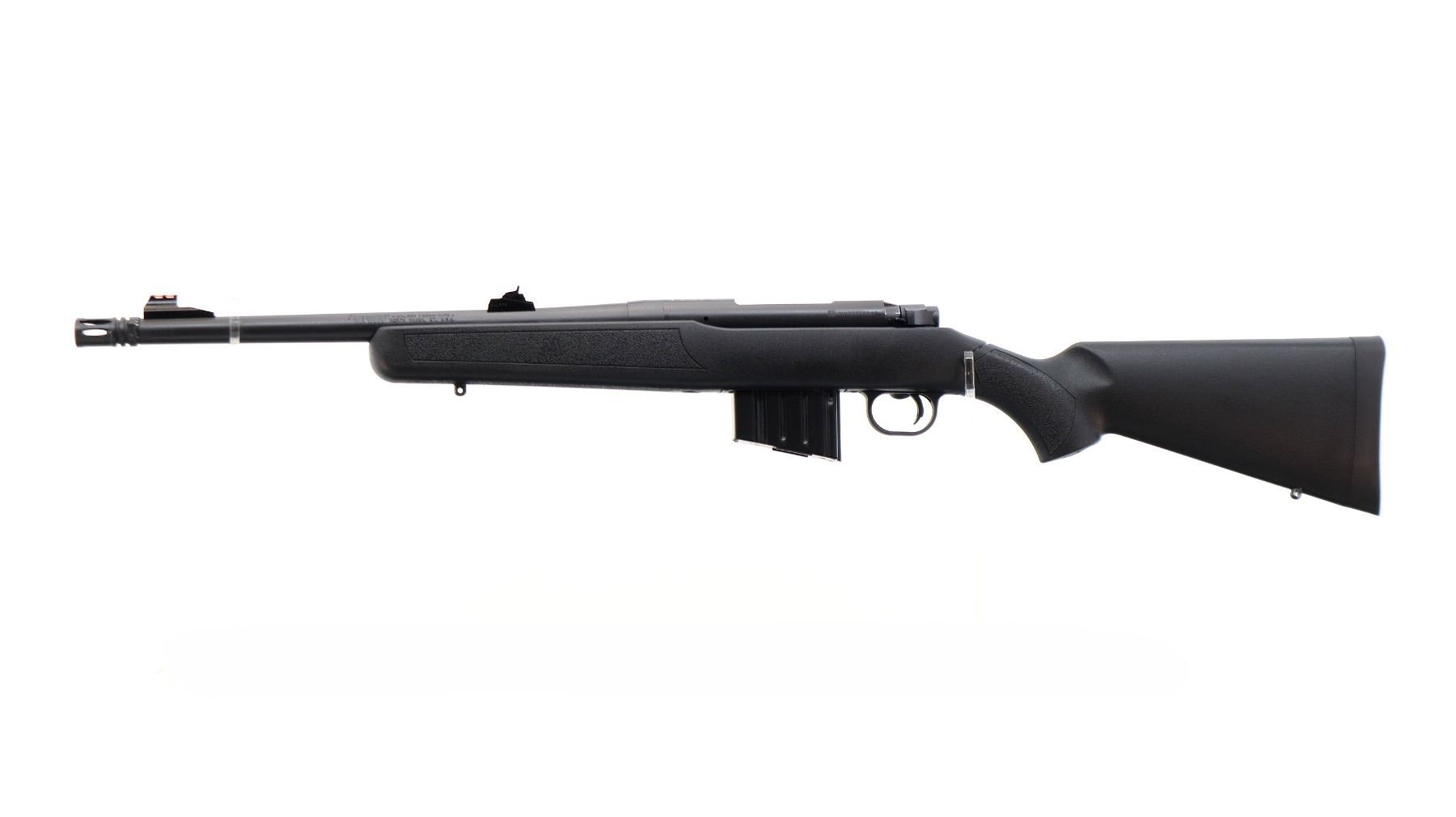 Main Description: Red fiber optic blade front sight with ramp, adjustable u notched rear sight, Parkerized metal finish, threaded muzzle with flashider installed, receiver drilled and tapped with no plug screws, fluted bolt with grooved knob. One piece black synthetic stock, textured forearm and pistol grip panels, black rubber recoil pad, grip cap, swivel studs.