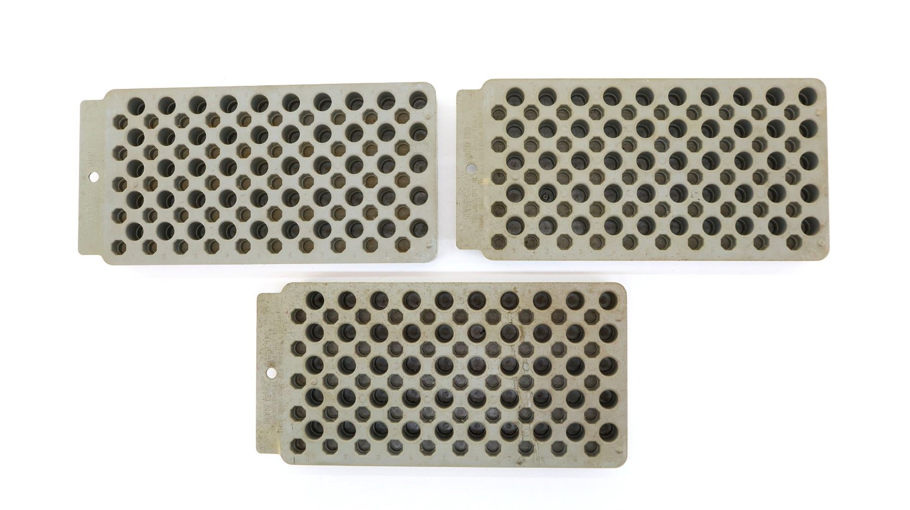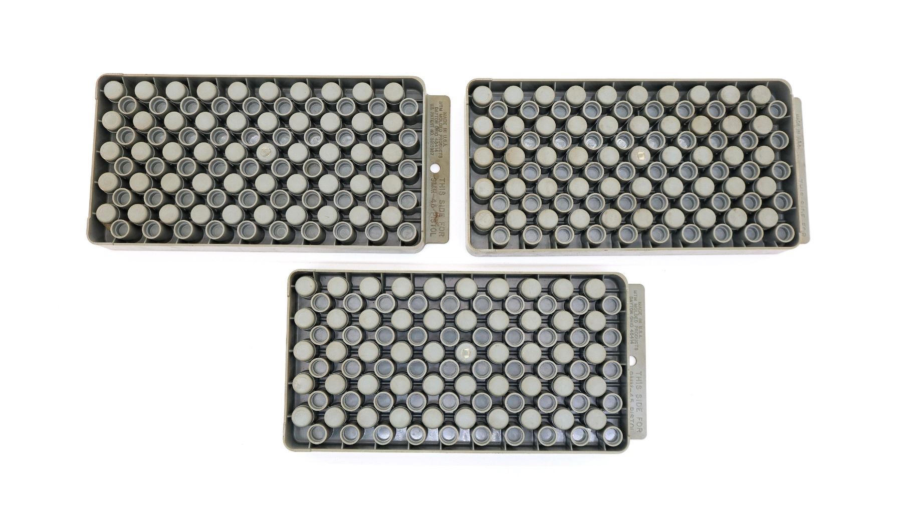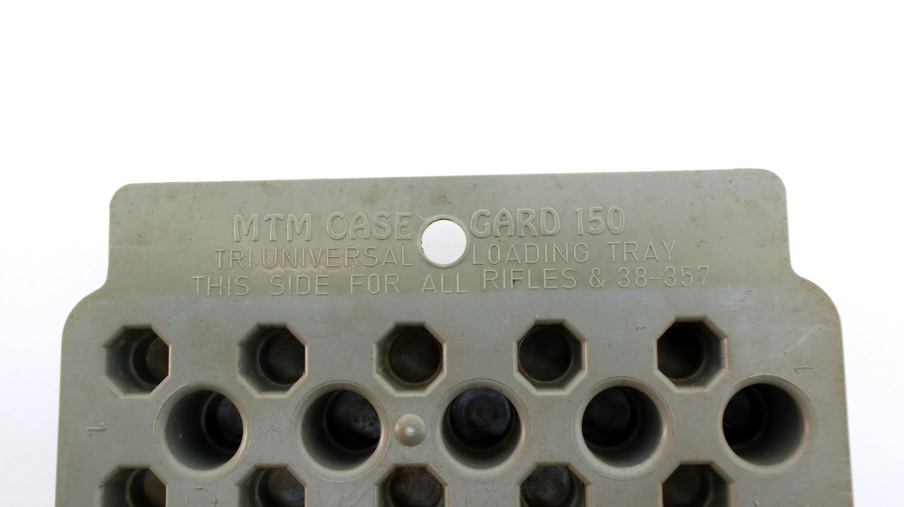 LOT INCLUDES; (3) GREY PLASTIC TRI-UNIVERSAL LOADING TRAYS, FITS 150-RNDS, ONE-SIDE MARKED: "THIS SIDE FOR ALL RIFLES & 38-357" ETC., OTHER-SIDE MARKED: "THIS SIDE FOR 9MM-45 PISTOL" ETC. SEE PHOTOS.