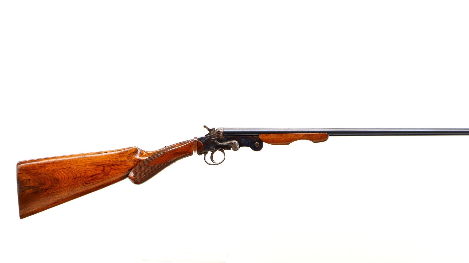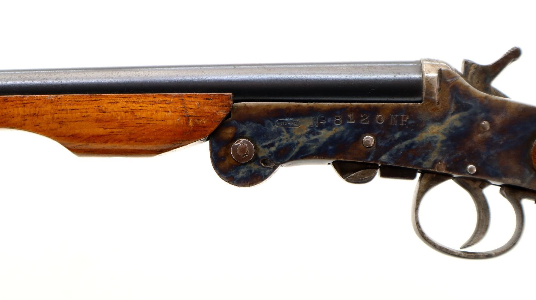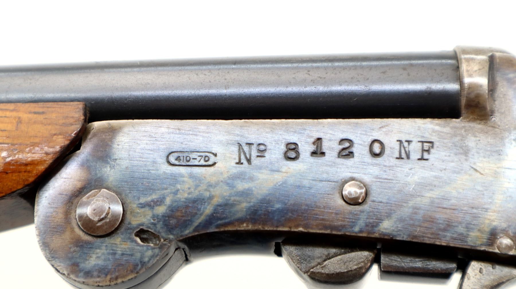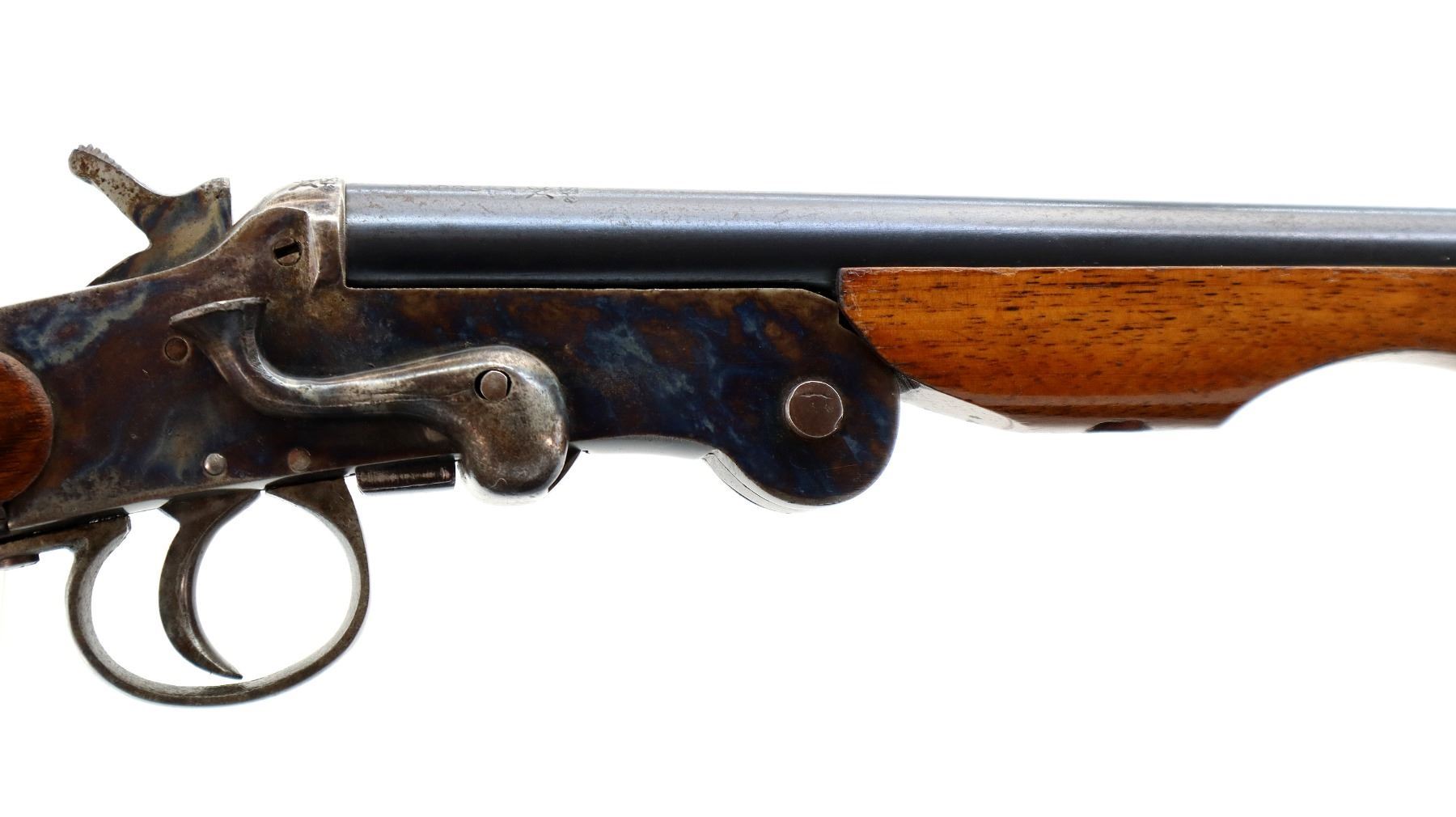 Main Description: Brass bead, blued round barrel, colour case hardened receiver, grooved spur hammer, checkered opening lever. Two piece wood stocks, checkered pistol grip chipped behind upper tang, grooved butt.