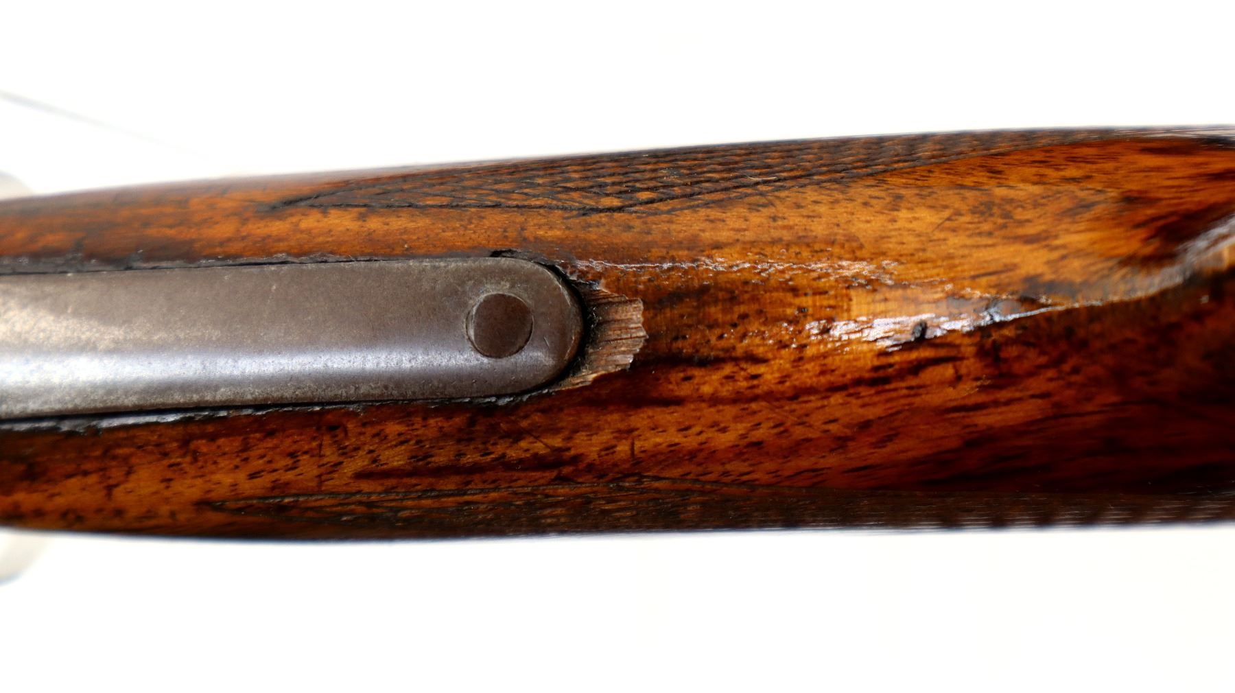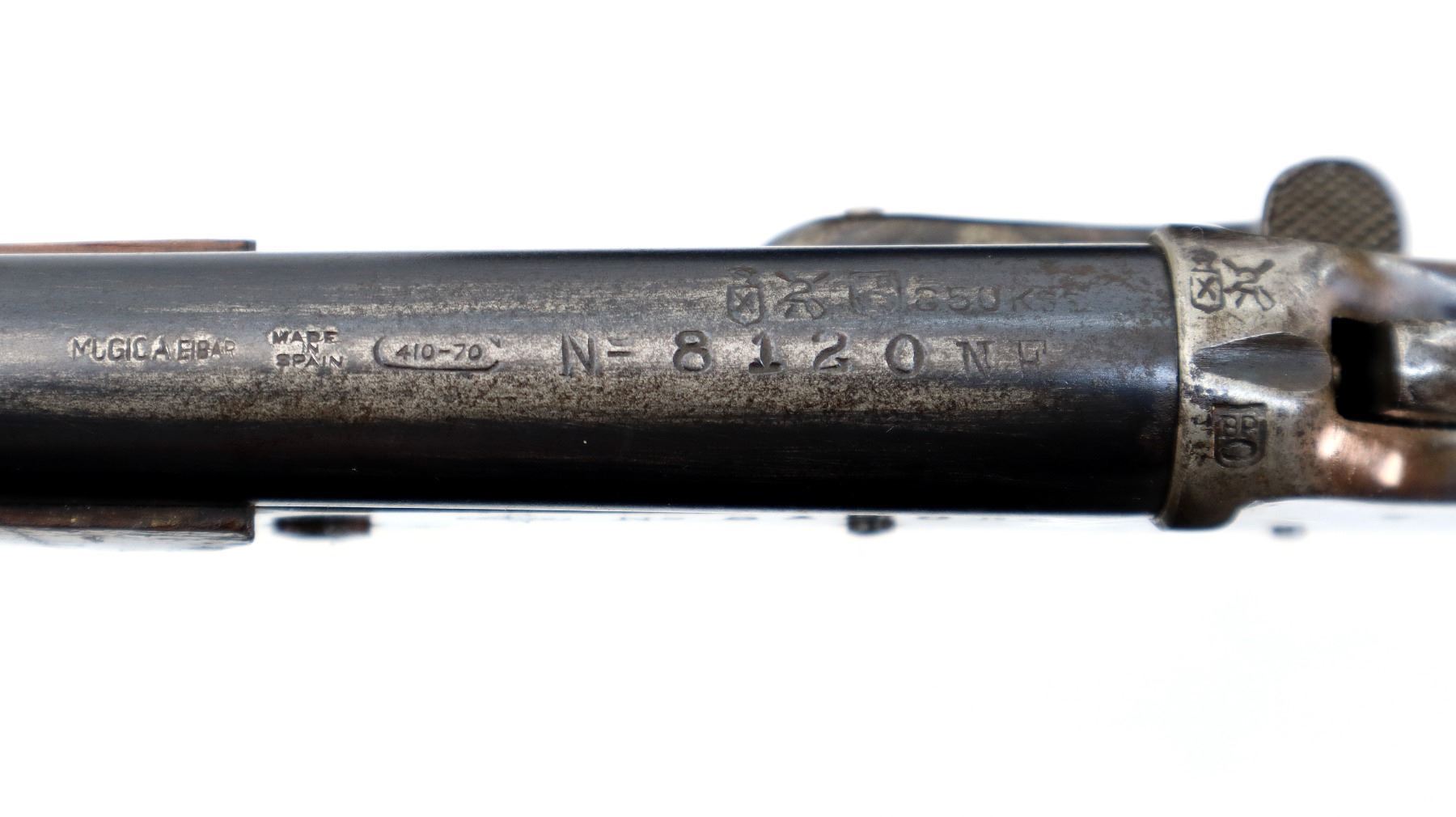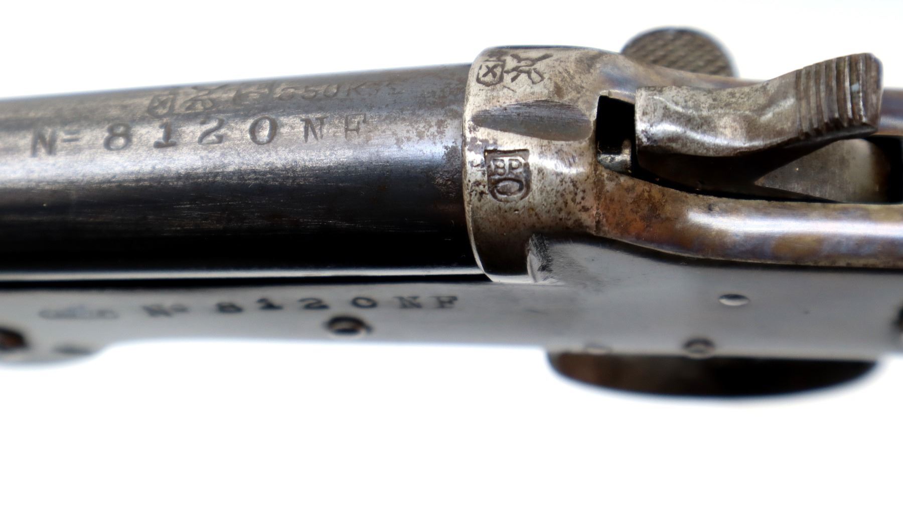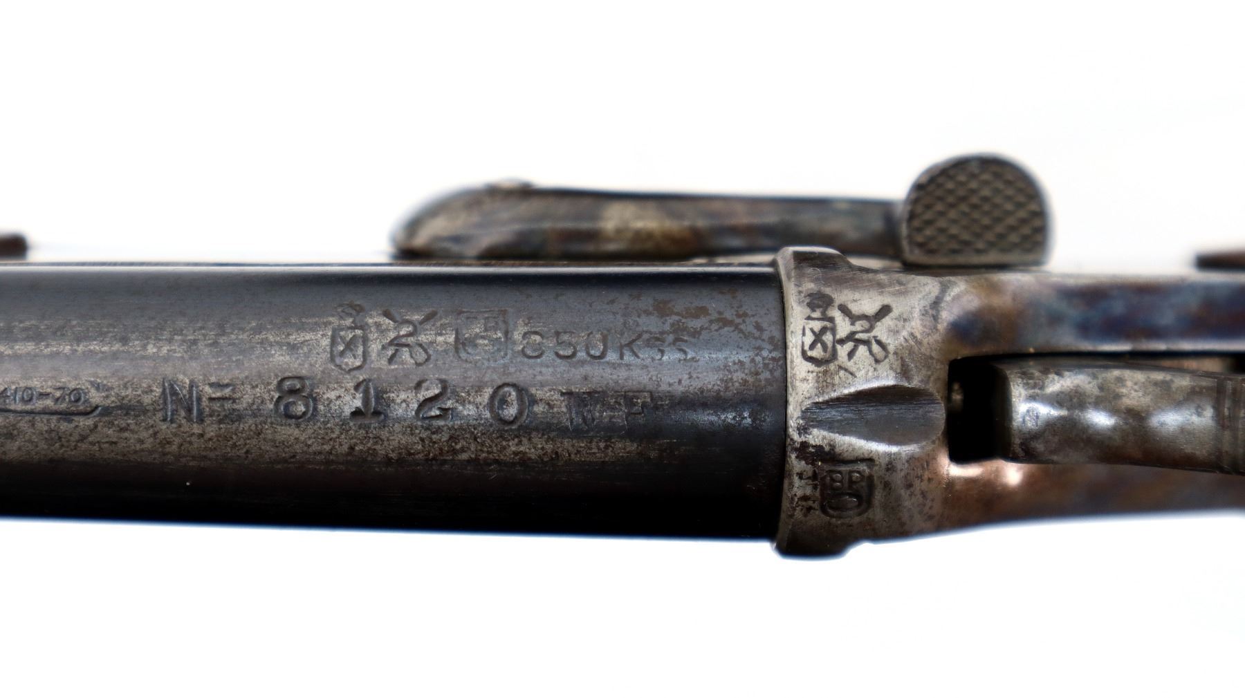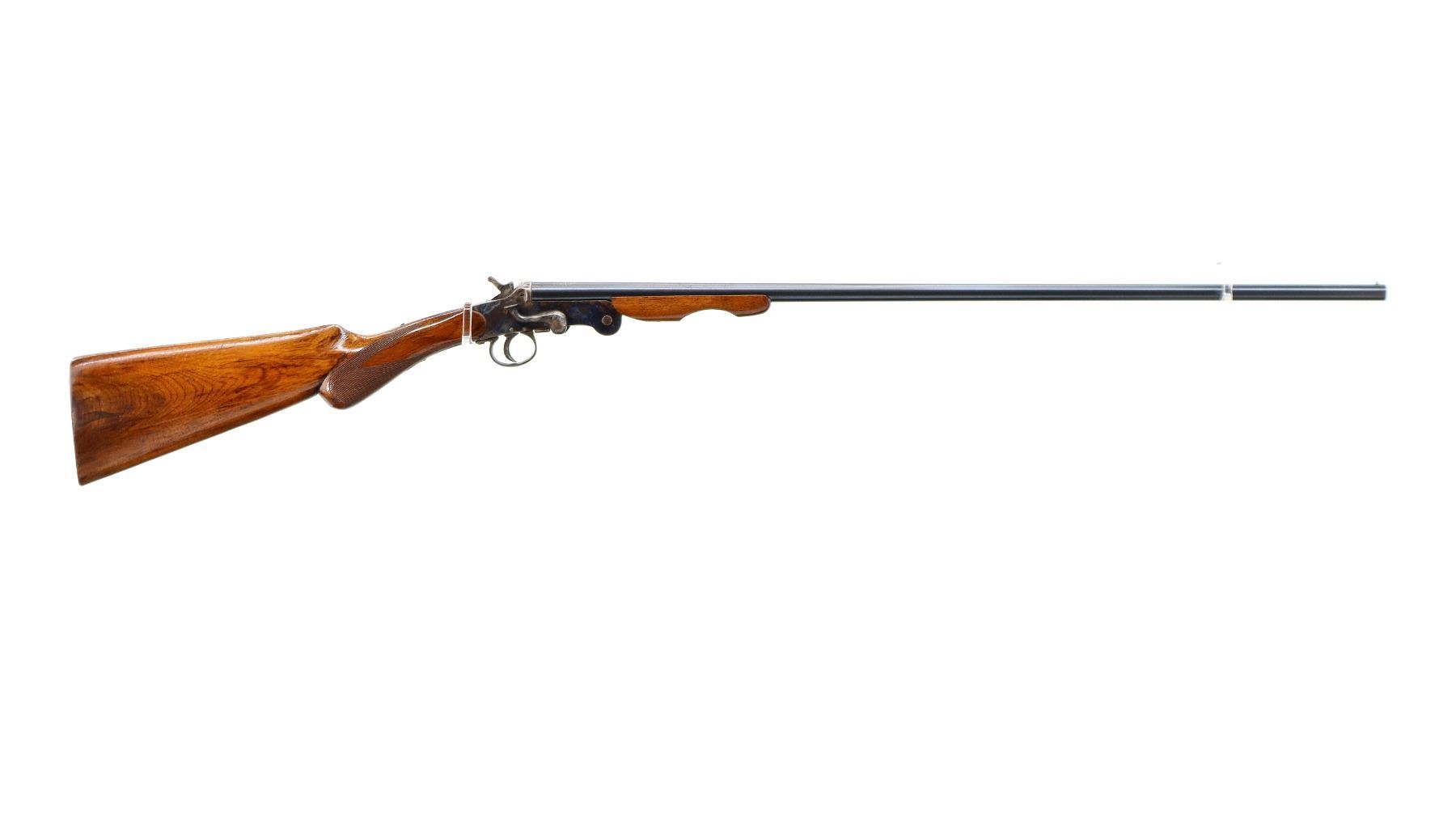 Main Description: Brass bead, blued round barrel, colour case hardened receiver, grooved spur hammer, checkered opening lever. Two piece wood stocks, checkered pistol grip chipped behind upper tang, grooved butt.