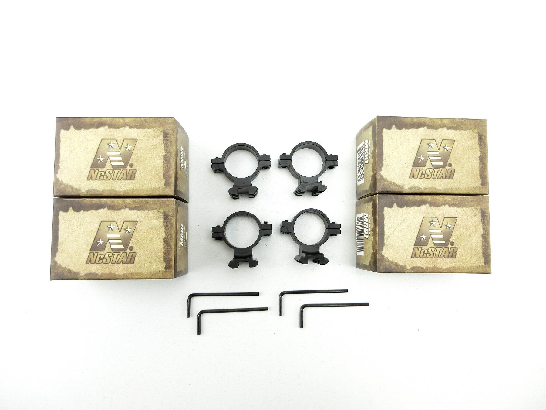 LOT INCLUDES; (4) NCSTAR SCOPE MOUNT ADAPTERS, WITH WEAVER RAILS, 1" DIAMETER, ALUMINUM CONSTRUCTION, WITH ORIGINAL BOX. SEE PHOTOS.