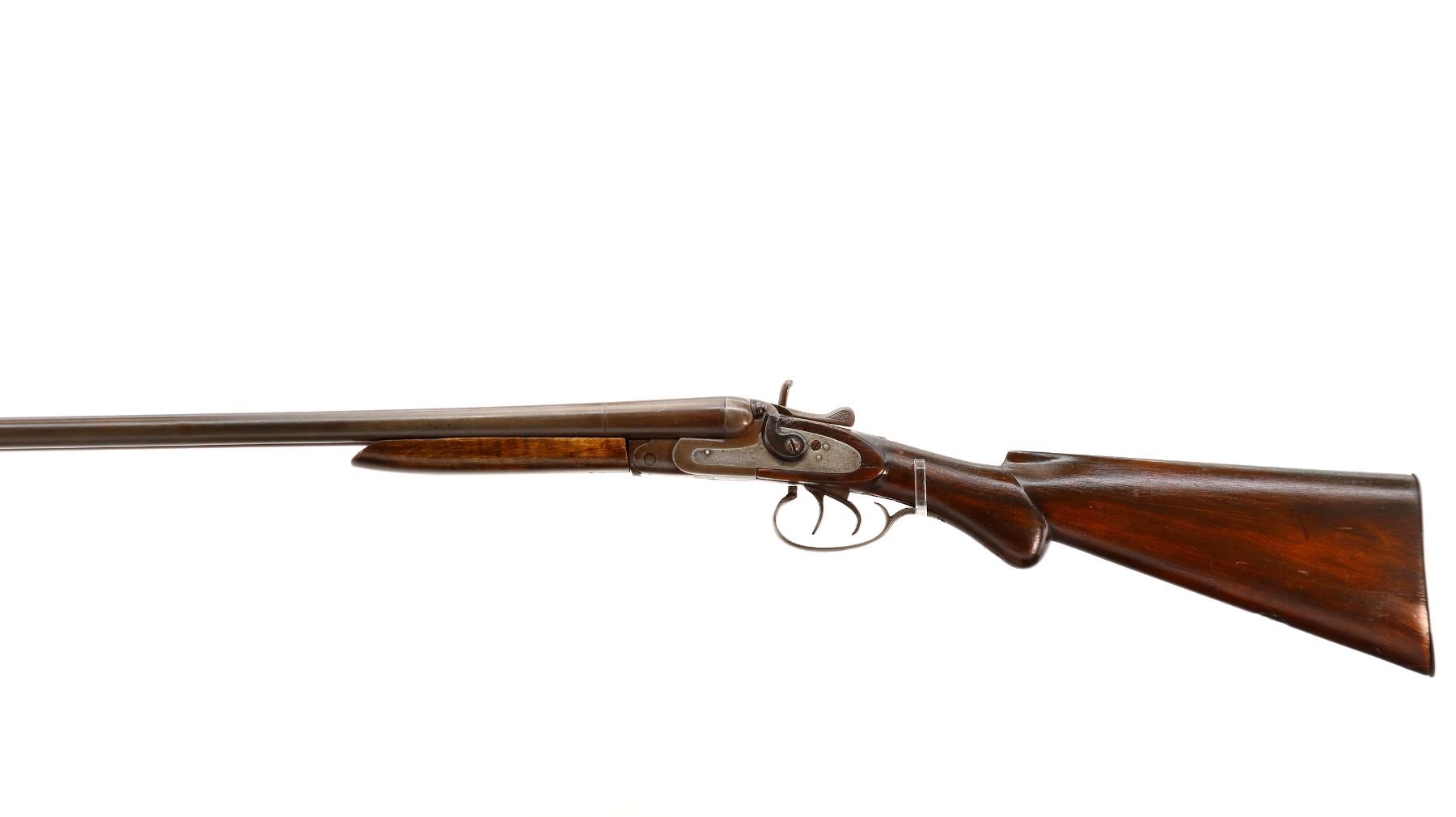 Main Description: Brass bead, laminated steel barrels with smooth rib that are loose on face, side locks, grooved right hand hammer, functions but is loose, left side hammer is broken, firing pin requires repair, extractor, double triggers. Two piece wood stocks, pistol grip, grooved steel butt plate, stock cracked and repaired at toe, missing vanity plate