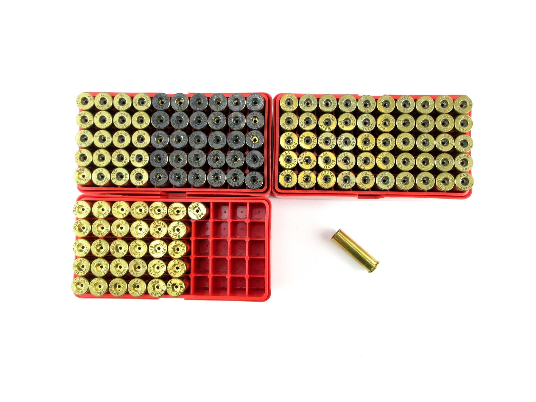 LOT INCLUDES; APPROX. (132) NON-PRIMED BRASS CASES, (3) MTM LARGE PISTOL PLASTIC AMMO BOXES.
