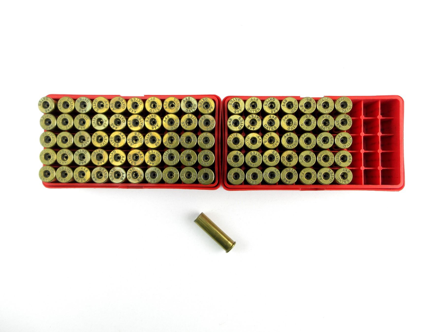 LOT INCLUDES; APPROX. (86) NON-PRIMED BRASS CASES, (2) MTM LARGE PISTOL PLASTIC AMMO BOXES.