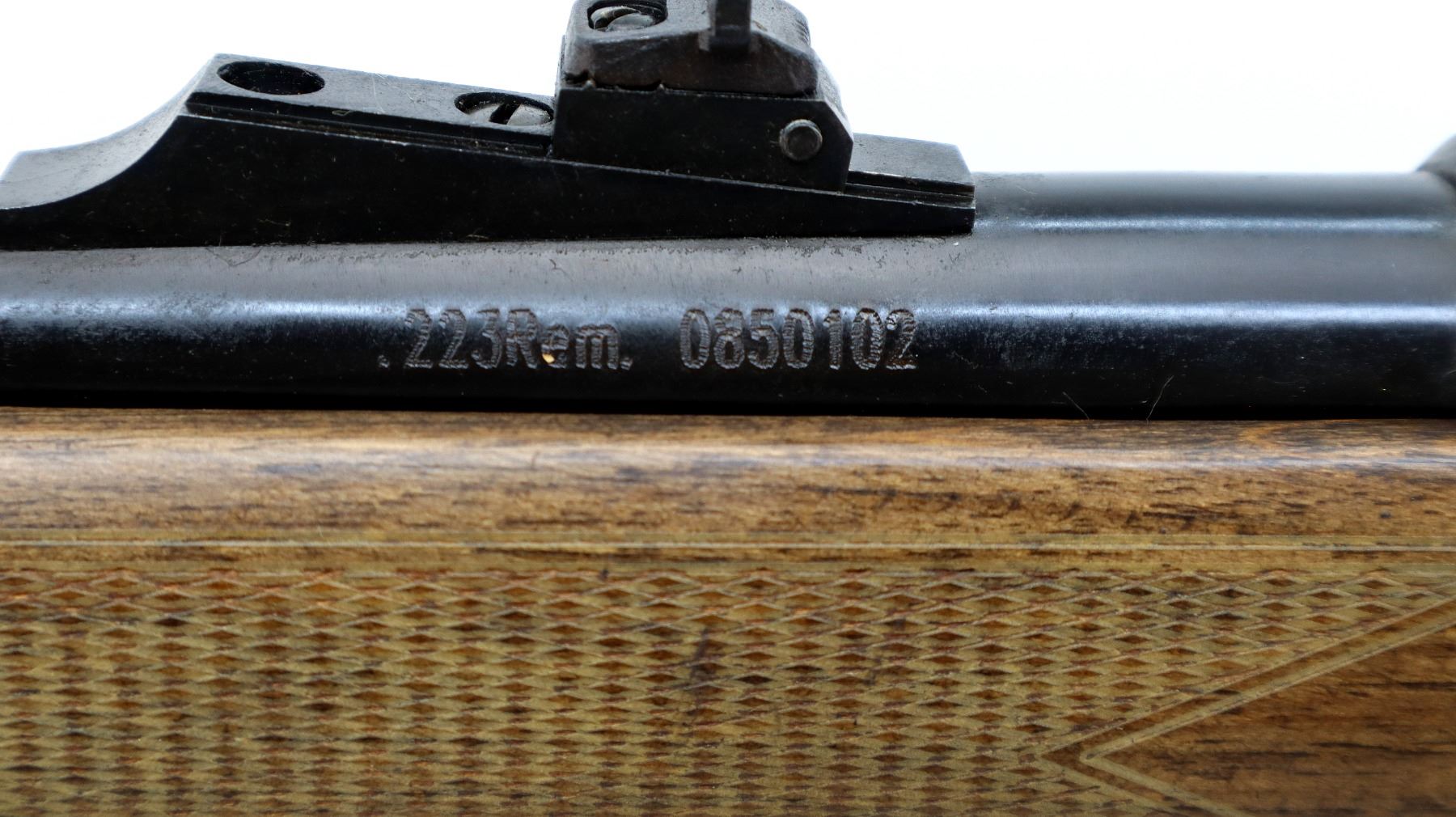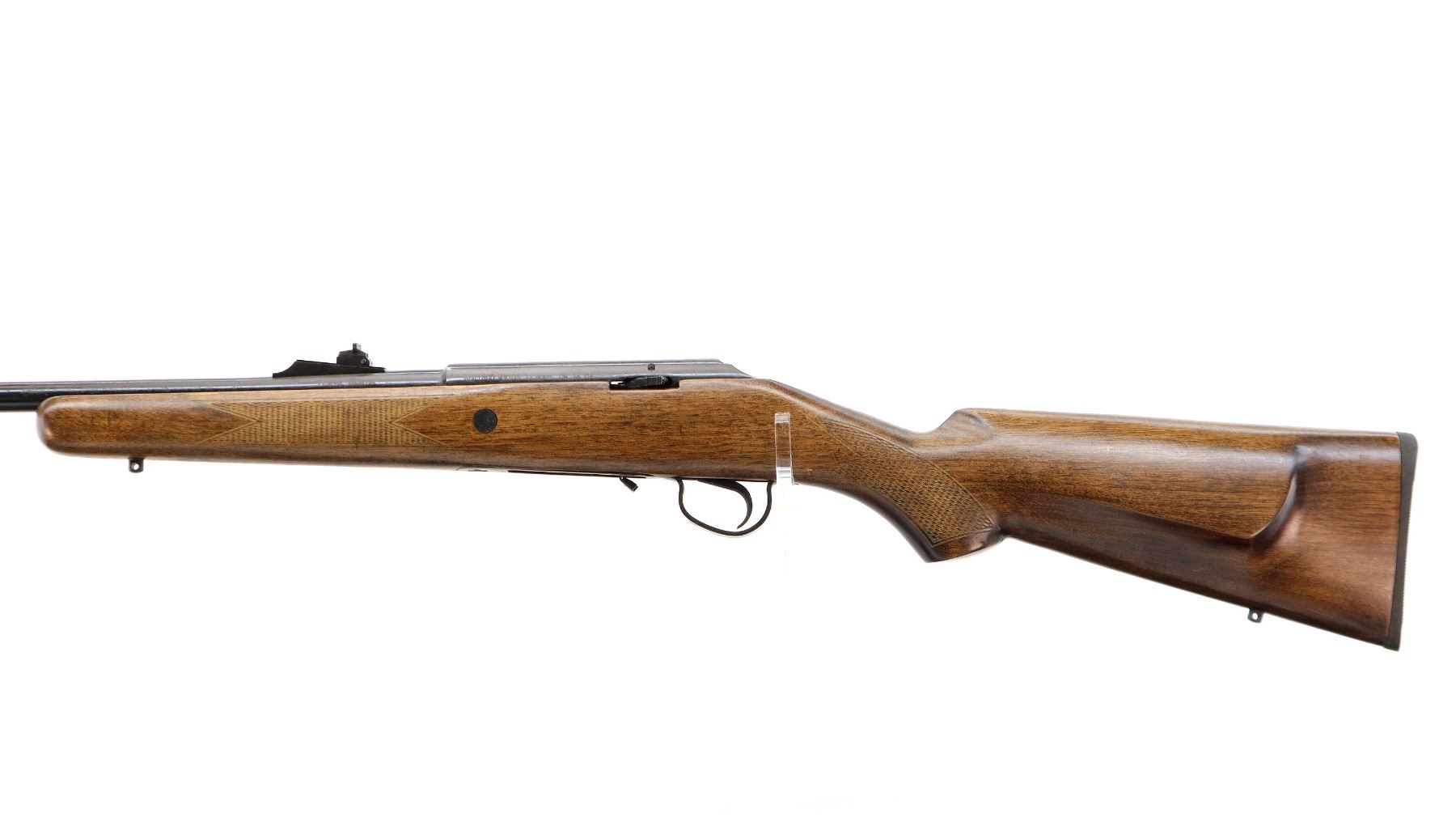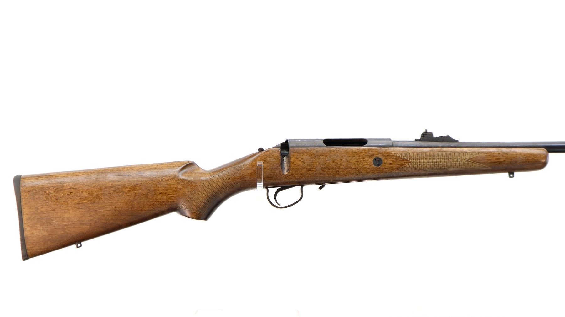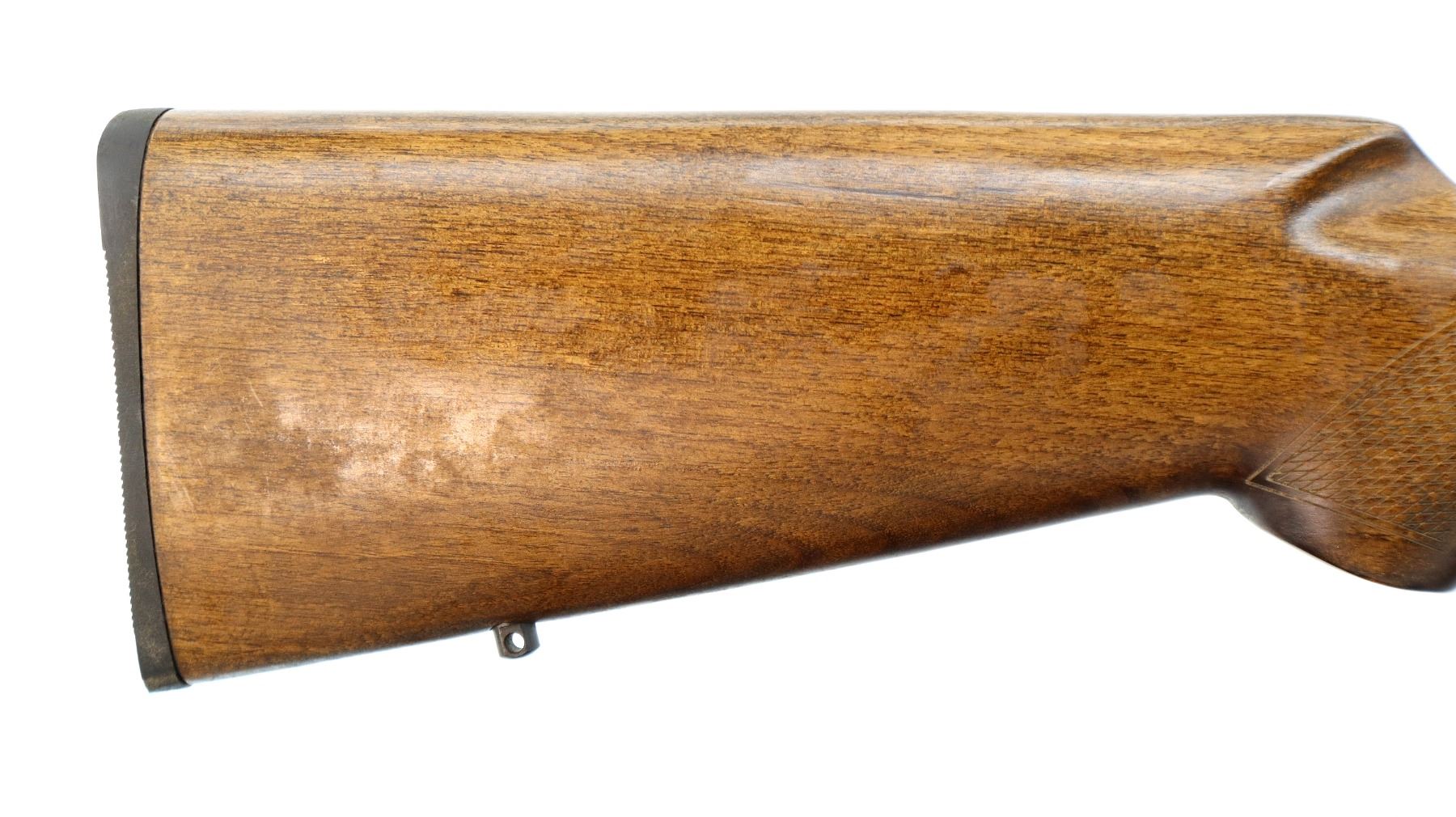 Main Description: Blade front sight with ramp, adjustable u notched rear sight, receiver drilled and tapped with plug screws installed, missing complete bolt assembly. One piece wood stock, checkered forearm and pistol grip, cheek rest, grooved black polymer butt plate, swivel studs.