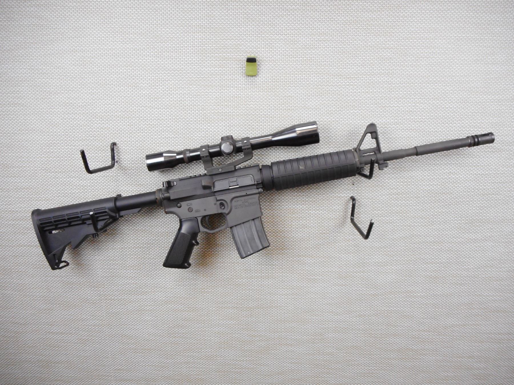 NORTH EASTERN ARMS , MODEL: NEA-15 , CALIBER: 300 AAC BLACKOUT , COMES WITH MAGAZINE, WEAVER SCOPE K6-W, FRONT POST SIGHT, SYNTHETIC FORE AND A2 COLLAPABLE BUTT STOCK, PISTOL GRIP, FLASH HIDER, SHOWS VERY LITTLE HANDLING MARKS, BORE IS EXCELLENT , ACTION: SEMI AUTOMATIC RIFLE , BARREL LENGTH: 406MM , CONDITION: 8/10 , STOCK # R2906 , SERIAL # NEA1513000389D , CLASS: CANADIAN RESTRICTED CLASS