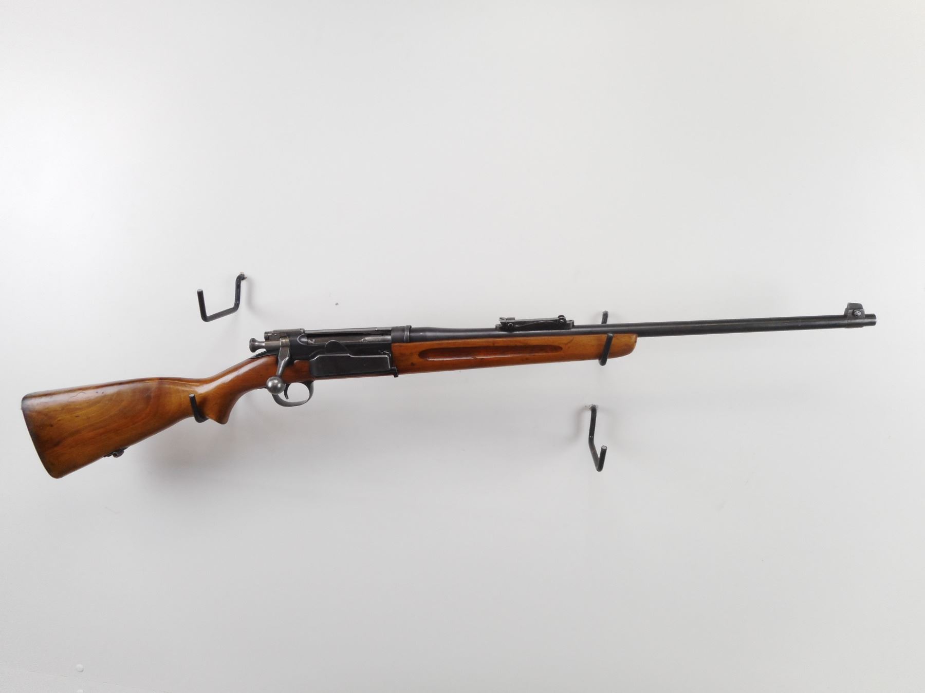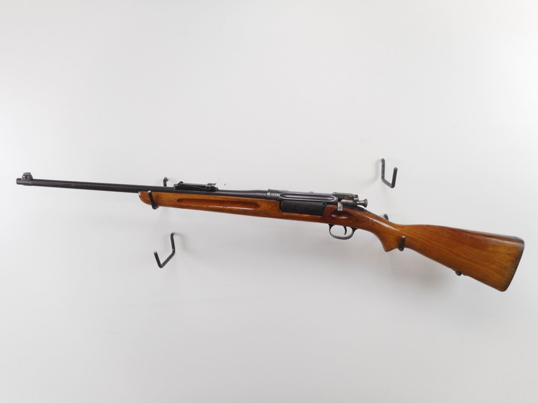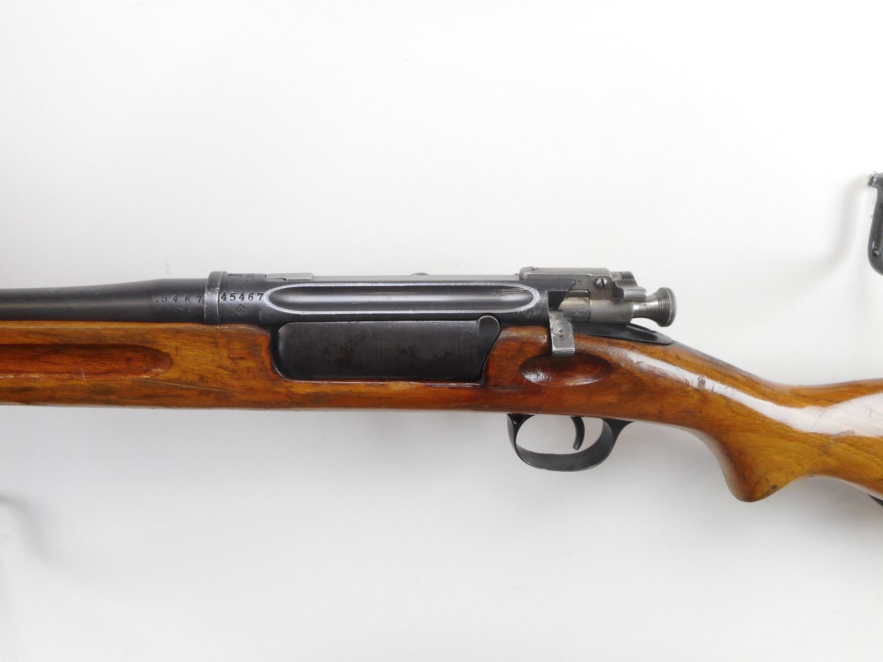 NORWEGIAN KRAG , MODEL: SPORTER , CALIBER: 6.5 X 55 SWEDISH MAUSER , DATED 1899. BORE IS GOOD. BLADE FRONT AND ADJUSTABLE REAR SIGHT. ONE PIECE HARDWOOD STOCK WITH STEEL BUTT PLATE. REAR SLING SWIVEL LOOP. SHOWS EXTENSIVE HANDLING MARKS. , ACTION: BOLT ACTION RIFLE , BARREL LENGTH: 22" , SERIAL# 45467 , CONDITION: 6/10 , CLASS: CANADIAN NON RESTRICTED CLASS