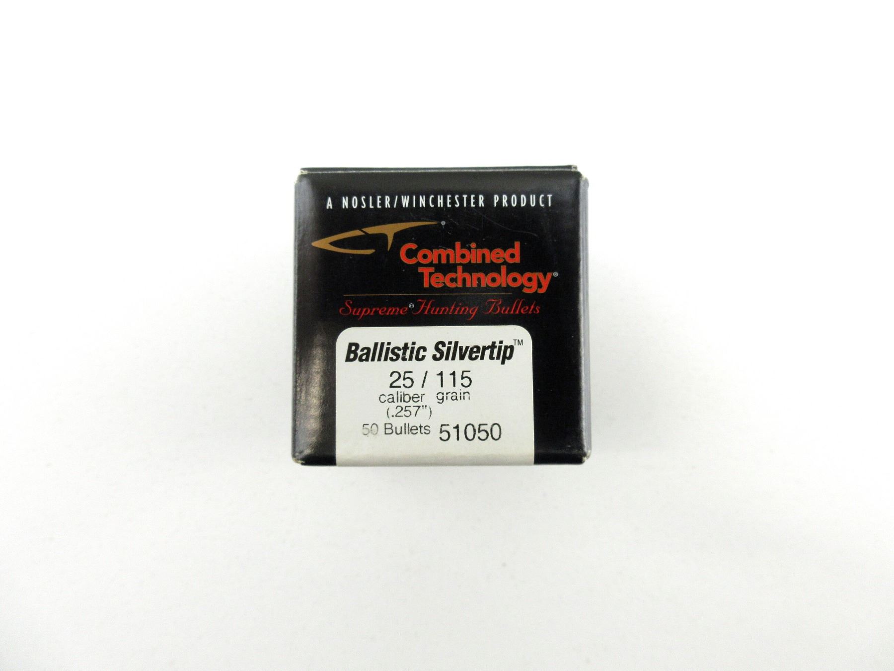 LOT INCLUDES; APPROX. (50) BULLETS, APPROX. DIA .257", 115 GRNS (STATED ON BOX NOT CONFIRMED), BALLISTIC SILVERTIP.