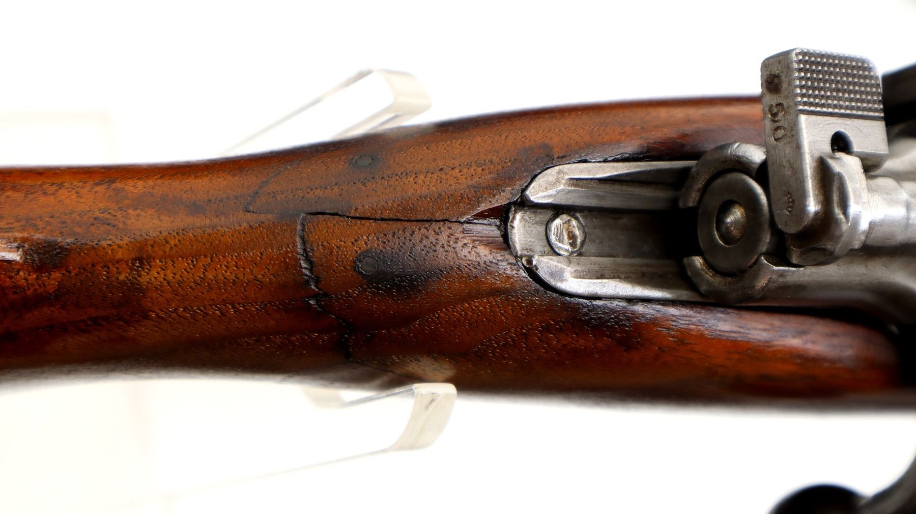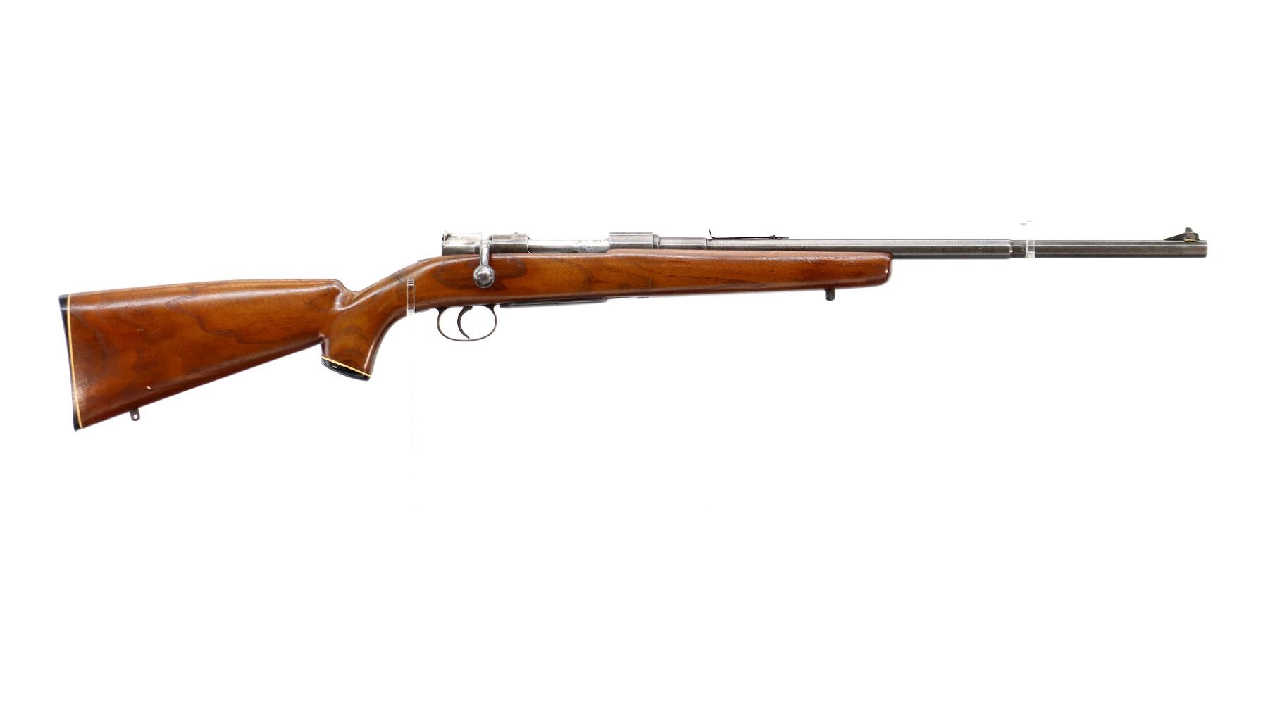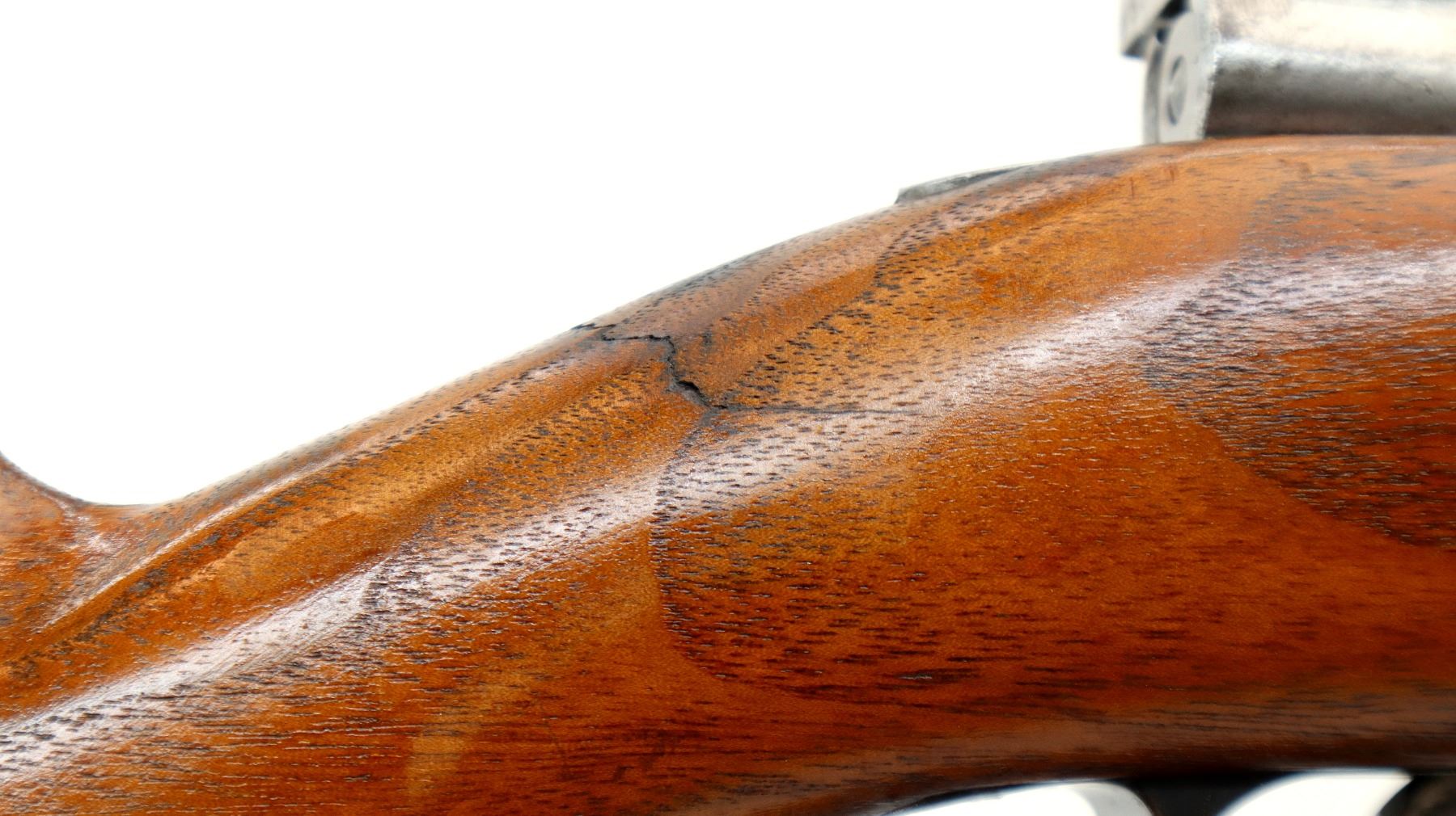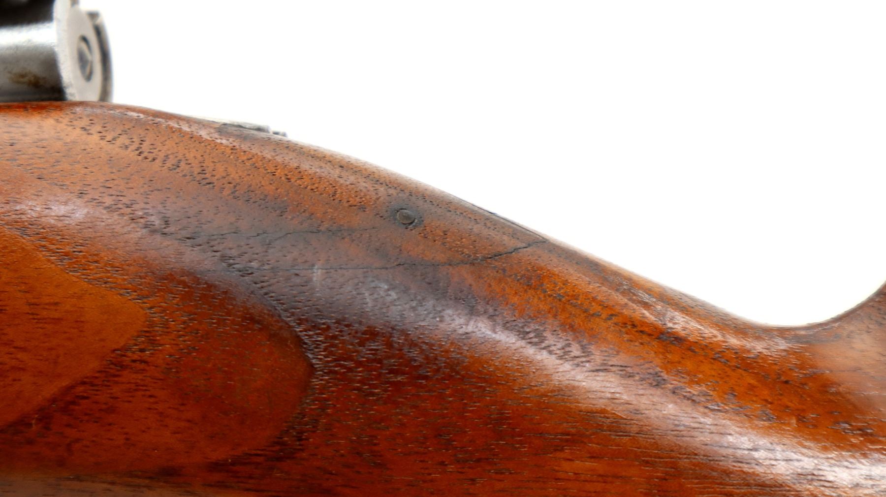 Main Description: Manufactured by Ludwig Loewe Berlin. Replaced blade front sight with ramp, replaced u notched rear sight, shortened barrel, crest on receiver ring, turned down bolt handle. One piece sporterized wood stock, pistol grip cracked behind receiver, checkered black polymer butt plate, grip cap, stock chipped at toe with extra hole, swivel studs.