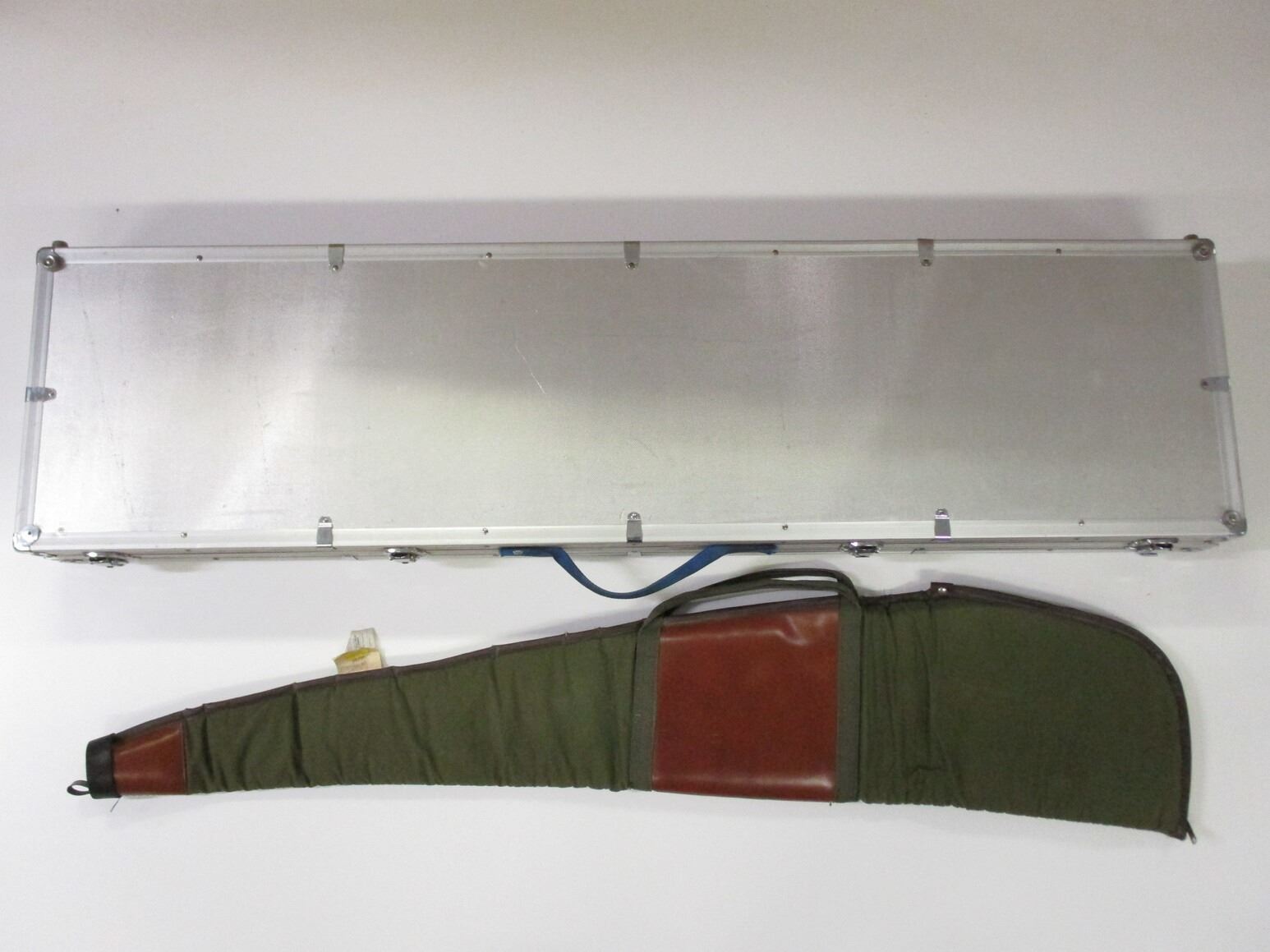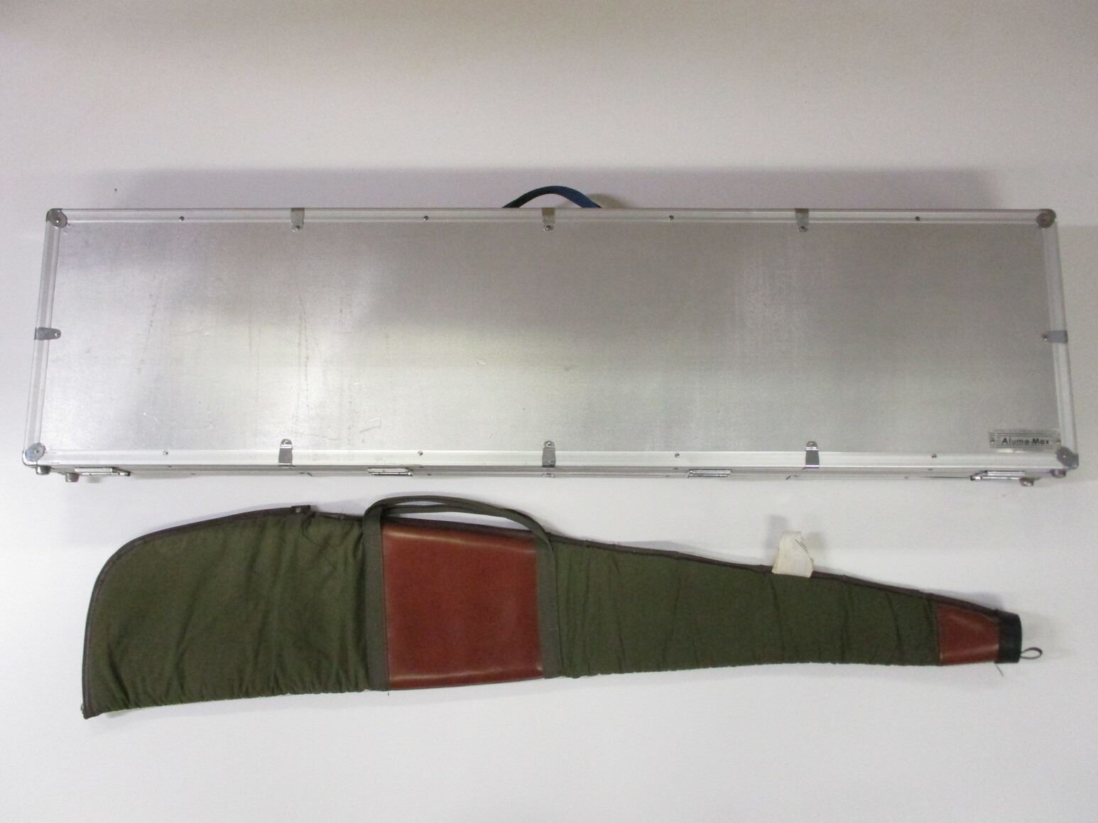 PADDED HARD/SOFT RIFLE CASE LOT , (1) PADDED ALUMA-MAX HARD RIFLE CASE, SILVER COLOURED. APPROXIMATE MEASUREMENTS: 52" x 13 1/2" x 4 3/4". (1) UNMARKED PADDED SOFT RIFLE CASE, GREEN/BROWN COLOUR, APPROXIMATELY 48" OVERALL LENGTH.
