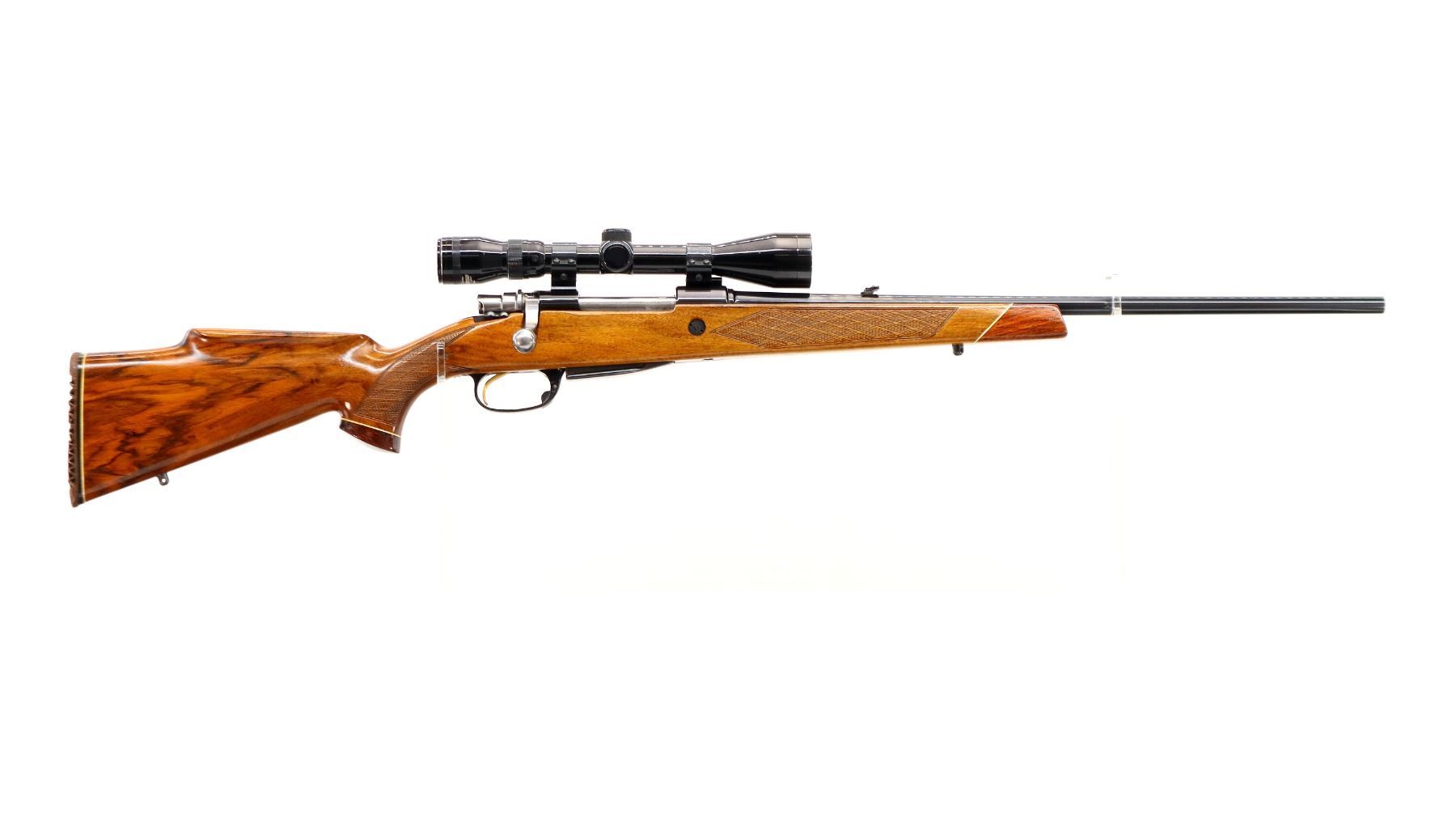 Main Description: Missing front sight holes present, adjustable folding u notched rear sight, blued finish, receiver drilled and tapped with a 3-9x40 scope installed, clear optics with duplex crosshair. Smooth bolt knob. One piece wood stock, Rosewood forend tip and pistol grip cap, checkered forearm and pistol grip with right hand palm swell cracked behind receiver, rollover cheek rest, brown recoil pad which is damaged and hard, 13.5" LOP, gold trigger, swivel studs.