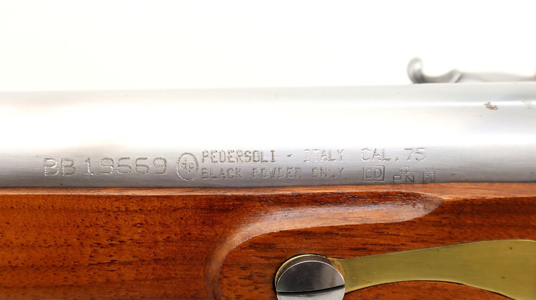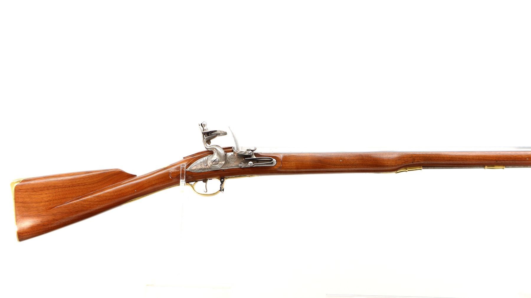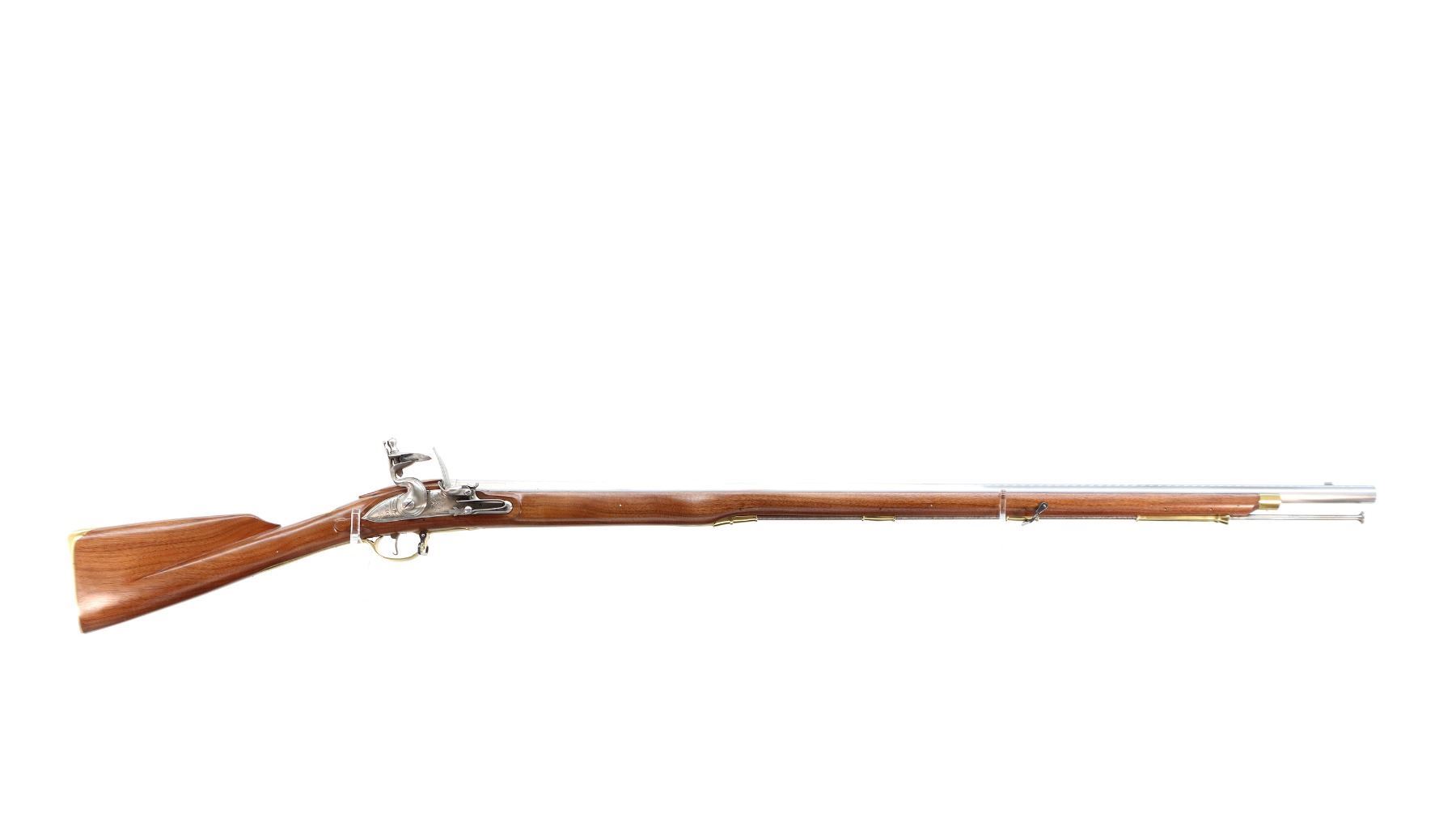 Main Description: Block front sight, silver finish, tapered round barrel, lock marked Grice 1762 with Crown GR, hammer and frizzen function. One piece full military wood stock, straight grip, smooth brass butt plate, vanity plate and trigger guard, sling swivels, steel ramrod. Includes Reproduction Socket Bayonet with Black leather scabbard and white canvas shoulder strap