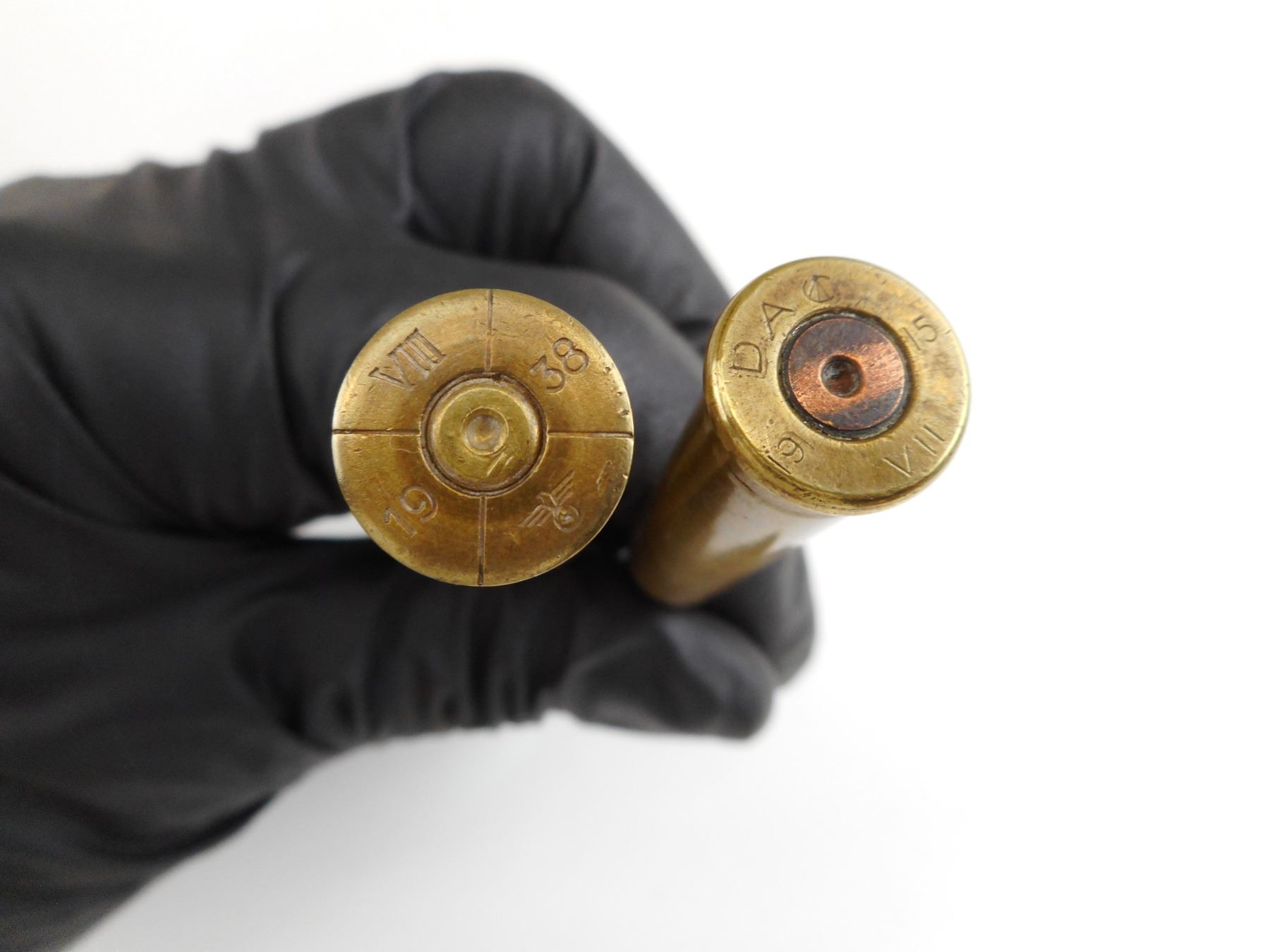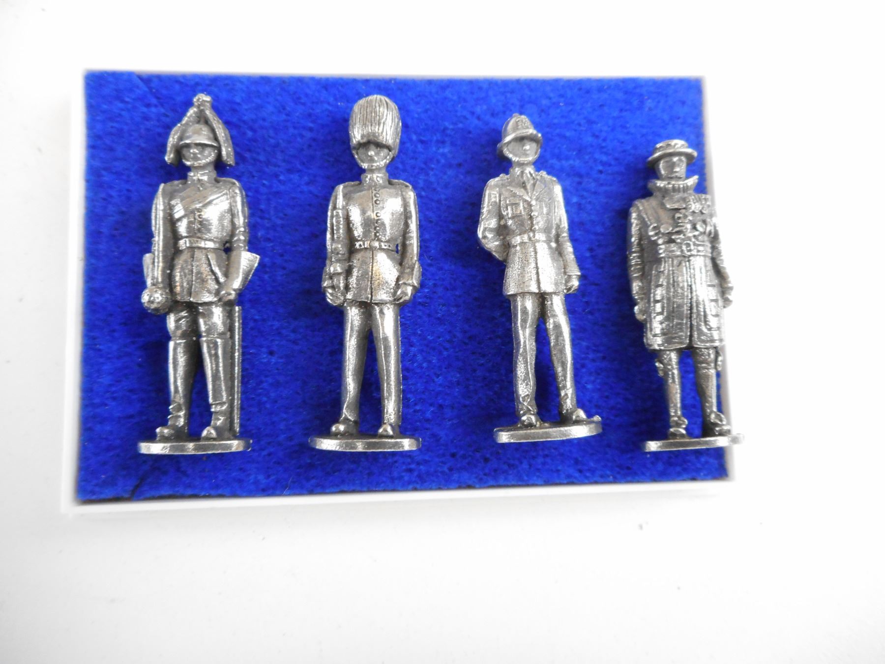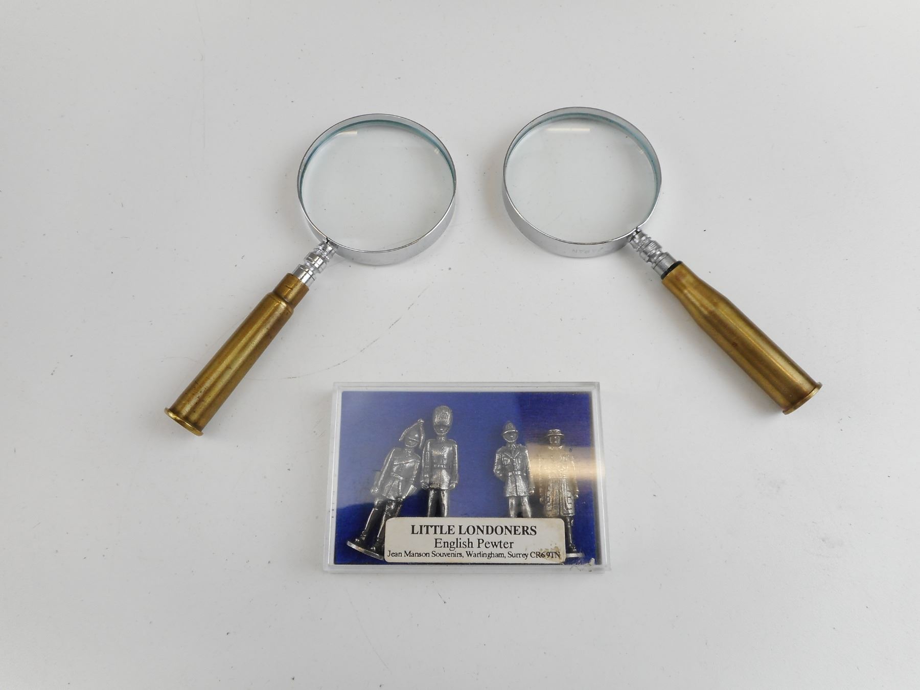 (1) CASE WITH 4 LITTLE LONDONERS PEWTER BRITISH SOLDIERS (2) MAGNIFYING GLASS WITH .303 1915 CASING AS A HANDLE. LOT OF 2
