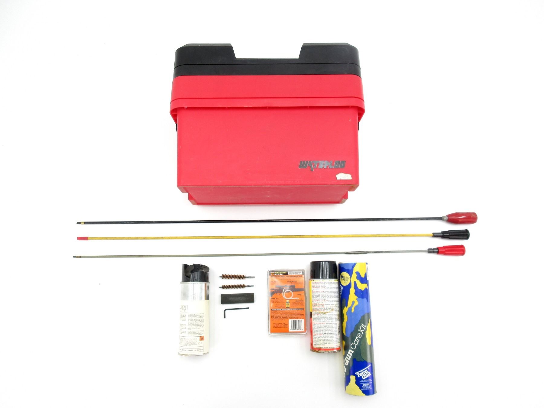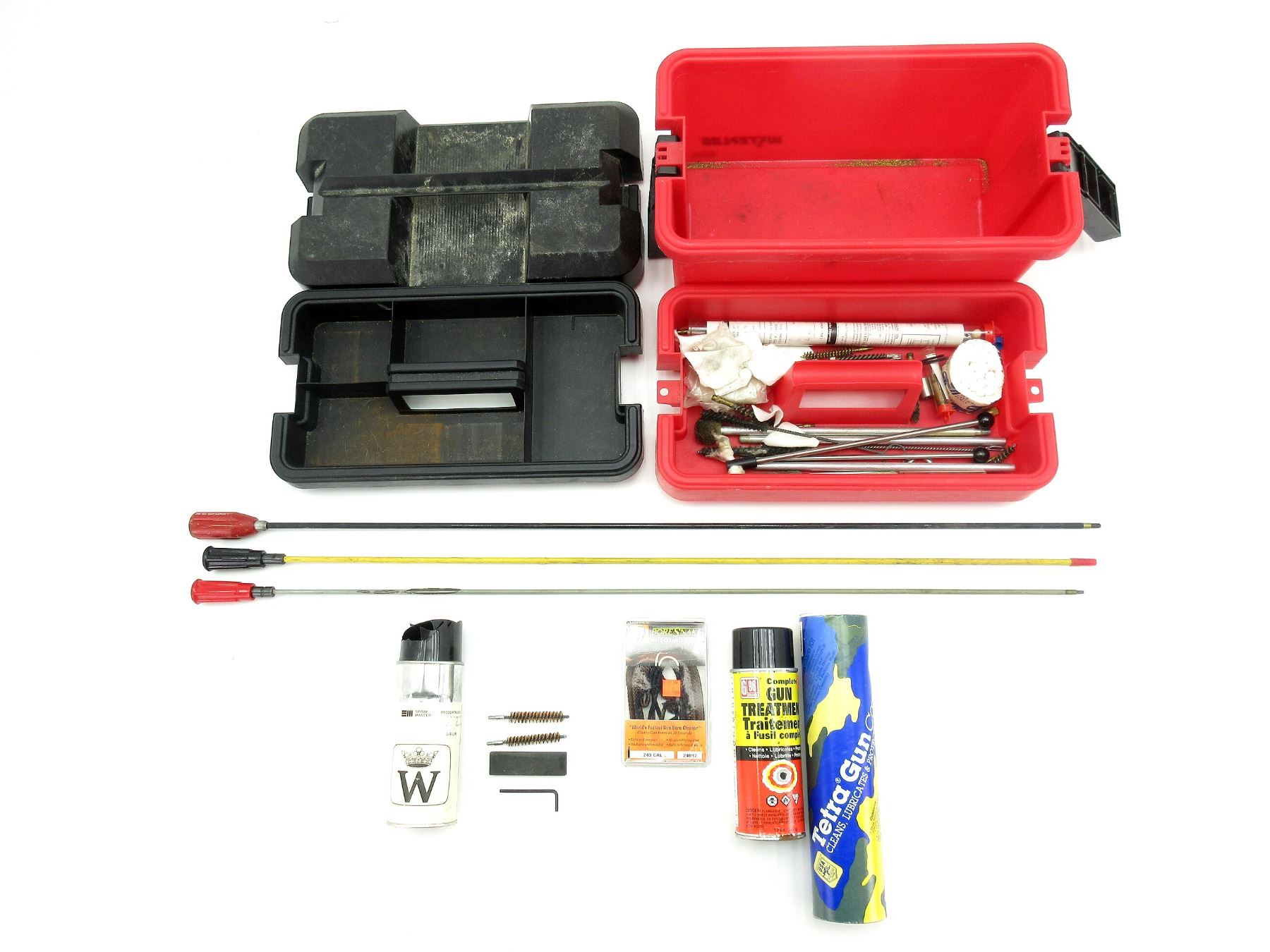 LOT INCLUDES; ASSORTED RIFLE CLEANING RODS, OAL APPROX. 37.25"-38.25", MULTIPLE BRUSHES / TIPS, CLEANING PATCHES, VARIOUS GUN CLEANING LIQUIDS, (1) HOPPE'S 9 .243 CAL. PULL-THRU, APPEARS NOS, (1) UNKNOWN DRY AMMO STORAGE BOX WITH CARRY HANDLE & STORAGE TRAYS, LOCKABLE, APPROX. 15.75" X 8.75" X 12.5", ETC. SEE PHOTOS.