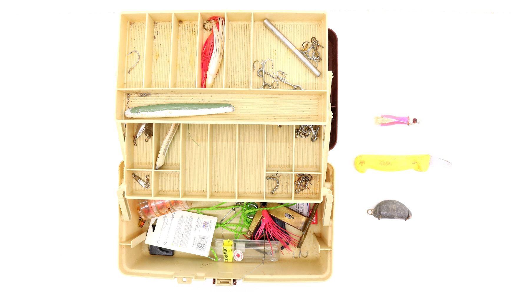 LOT INCLUDES; (1) PLANO TACKLE BOX WITH LATCH & CARRY HANDLE, 3-TRAYS, APPROX. 13" X 7" X 6.75" & ASSORTED FISHING LURES / TOOLS INSIDE TACKLE BOX. SEE PHOTOS.