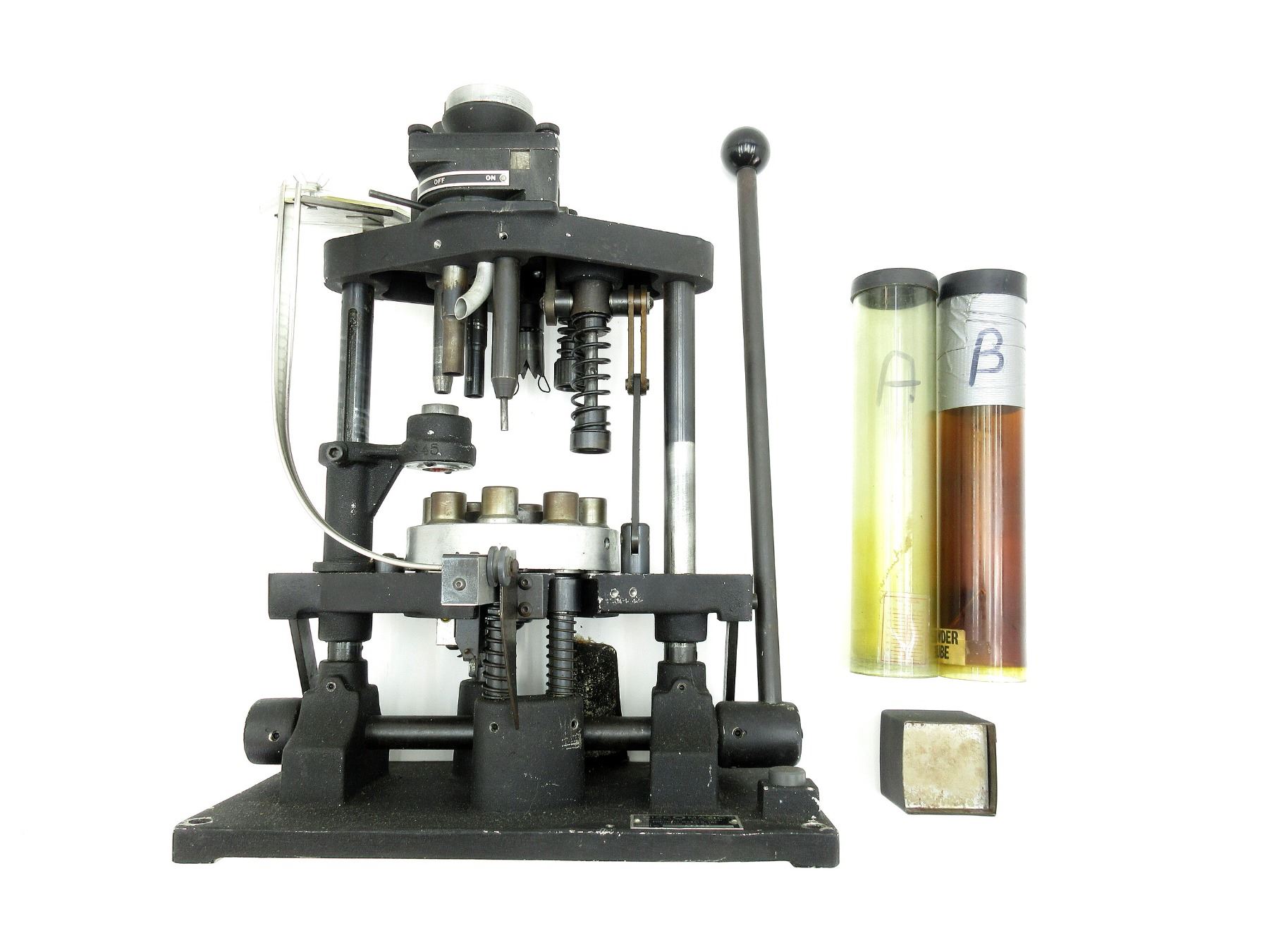 LOT INCLUDES; (1) SIZE-O-MATIC 800B PRESS WITH (2) POWDER & SHOT BOTTLES, ONE WITH TAPE (POSSIBLE CRACKS), (1) PRIMER TRAY / FEEDER, PRESS SERIAL #10075, MAY REQUIRE ADJUSTMENTS AND/OR MAY NOT BE COMPLETE. SEE PHOTOS.