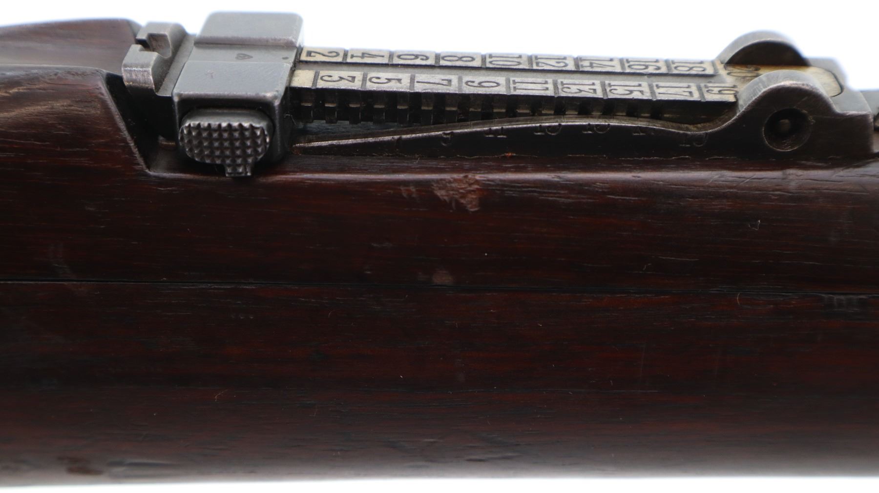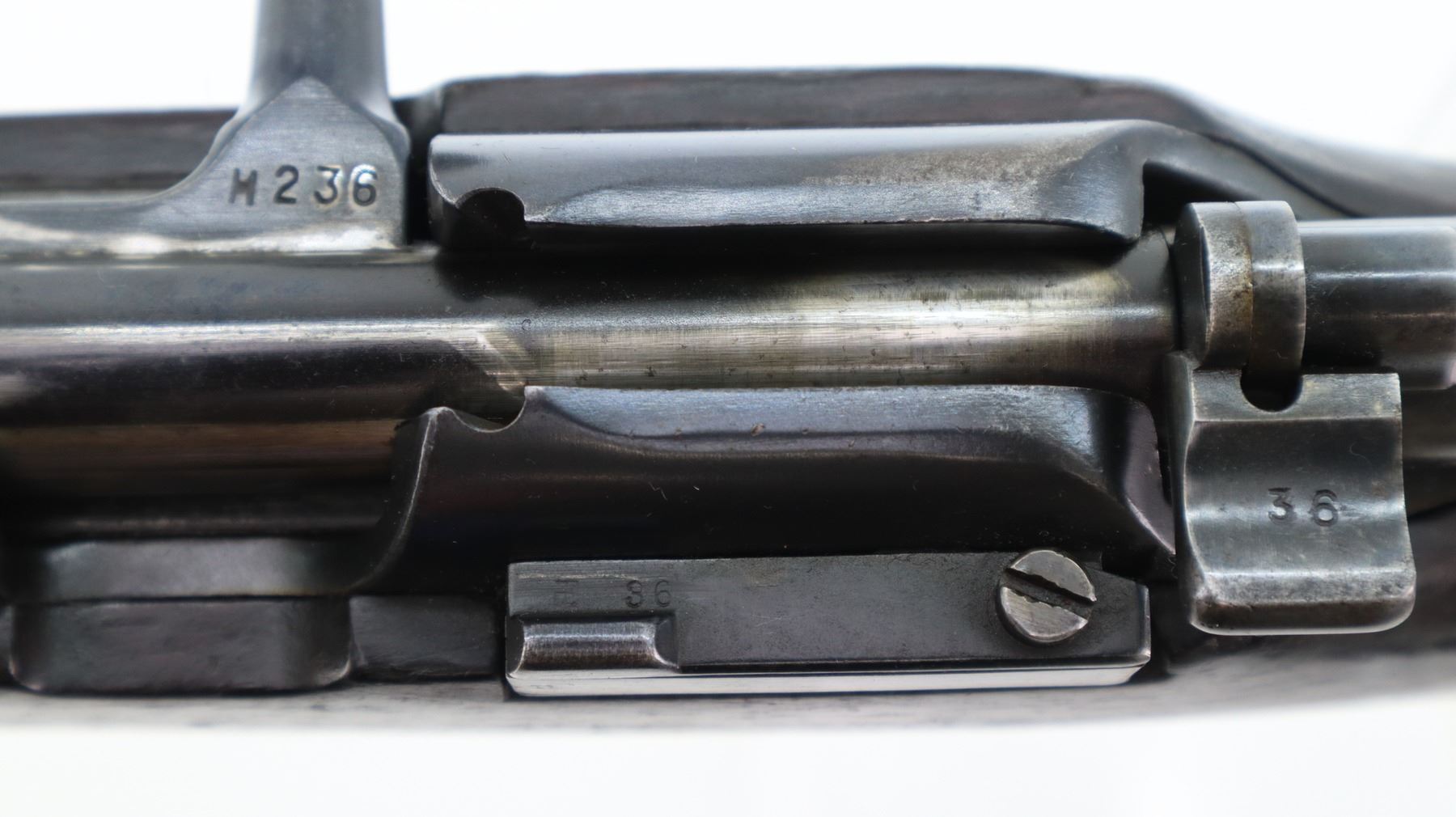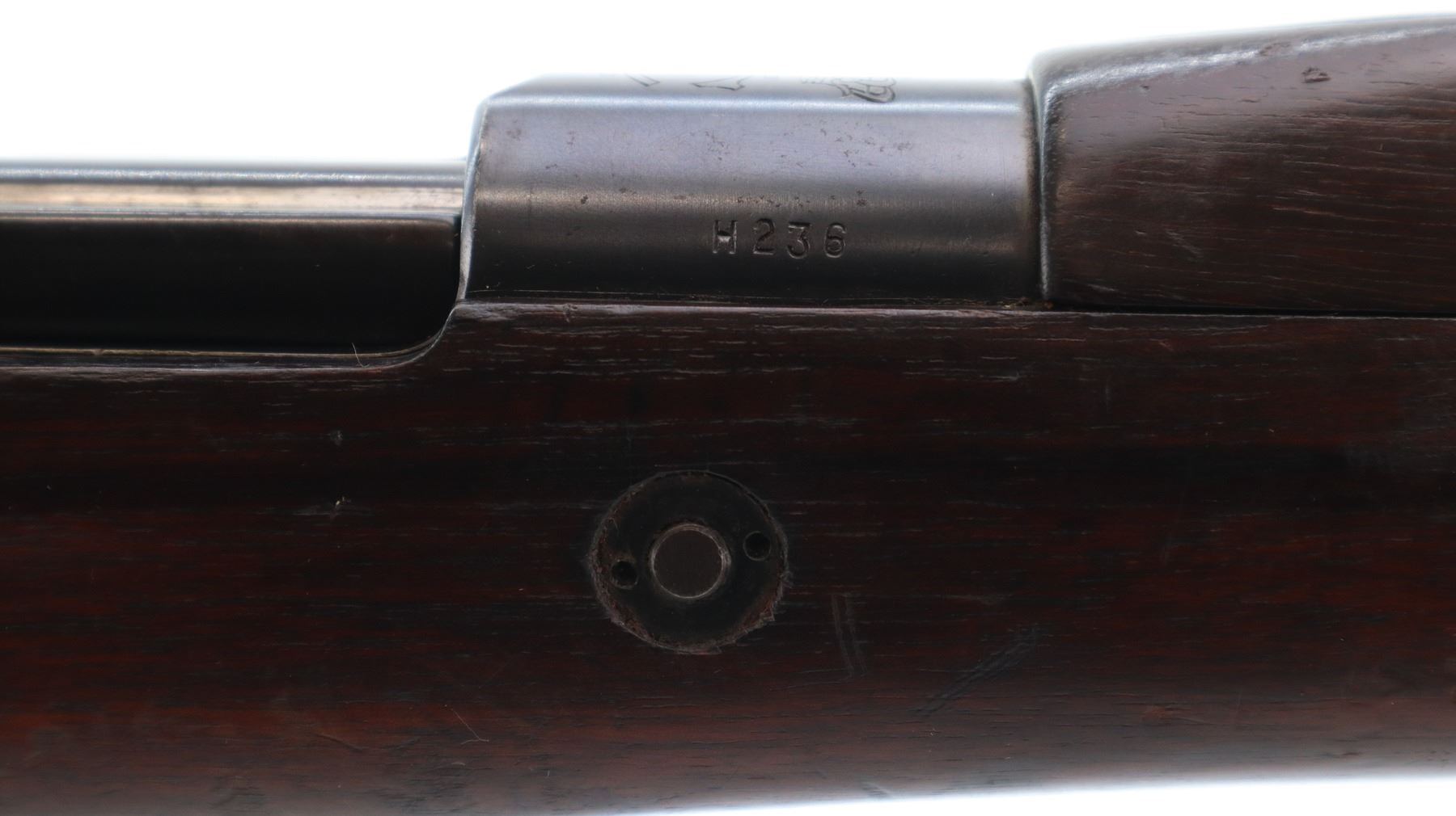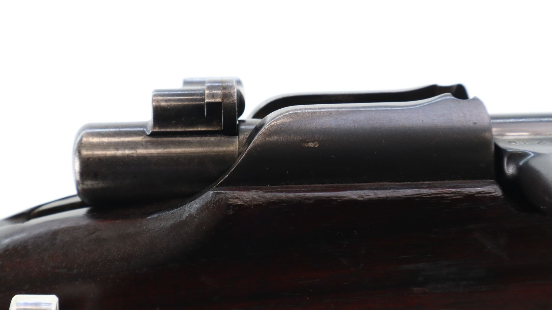 Main Description: Manufactured by DWM, visible numbers match. Blade front sight with ears and ramp, adjustable u notched rear sight, blued finish, straight bolt handle. Two piece smooth full military wood stocks, cracked forend, pistol grip, smooth steel butt plate, sling swivels, bayonet lug, cleaning rod.