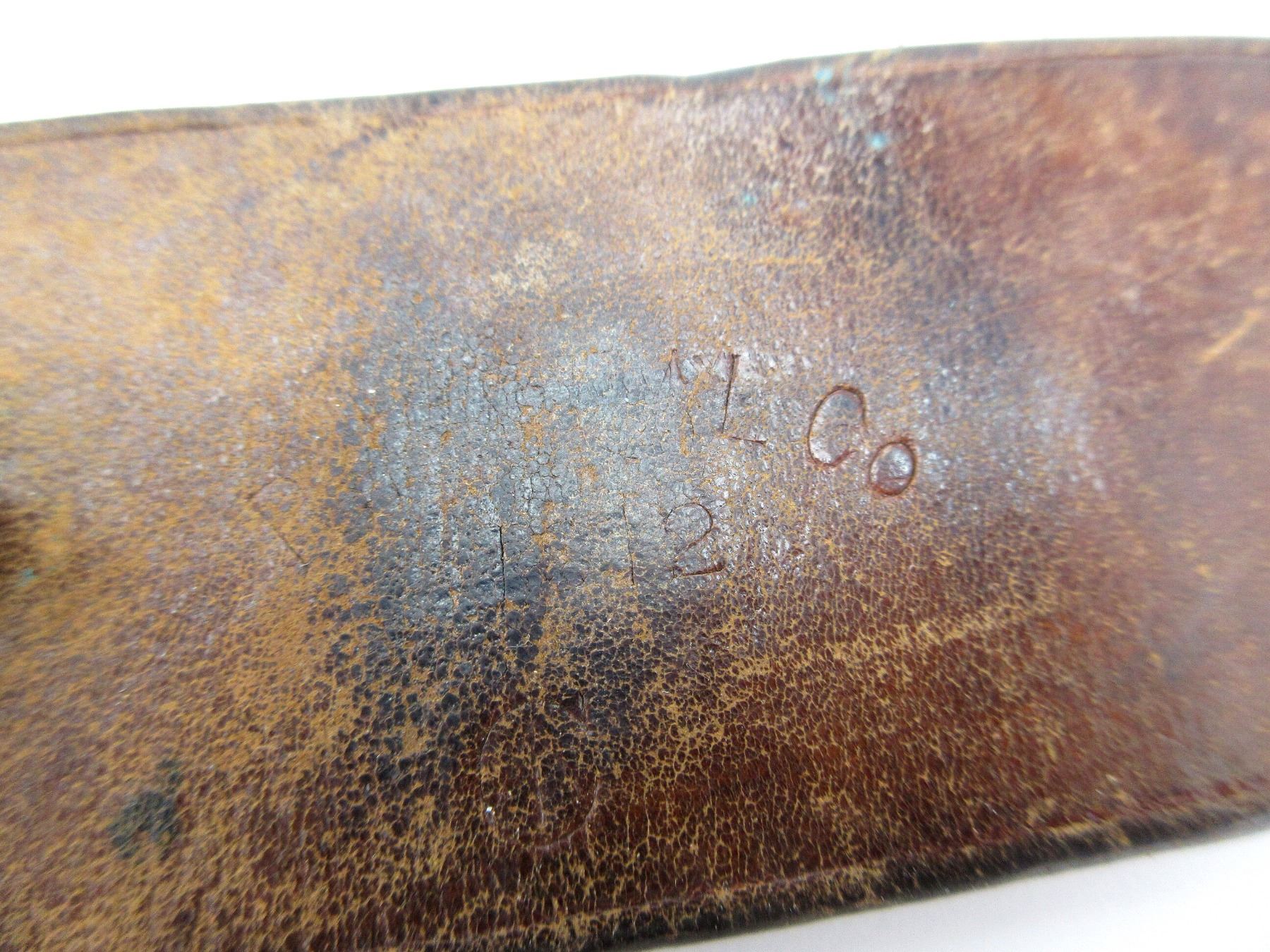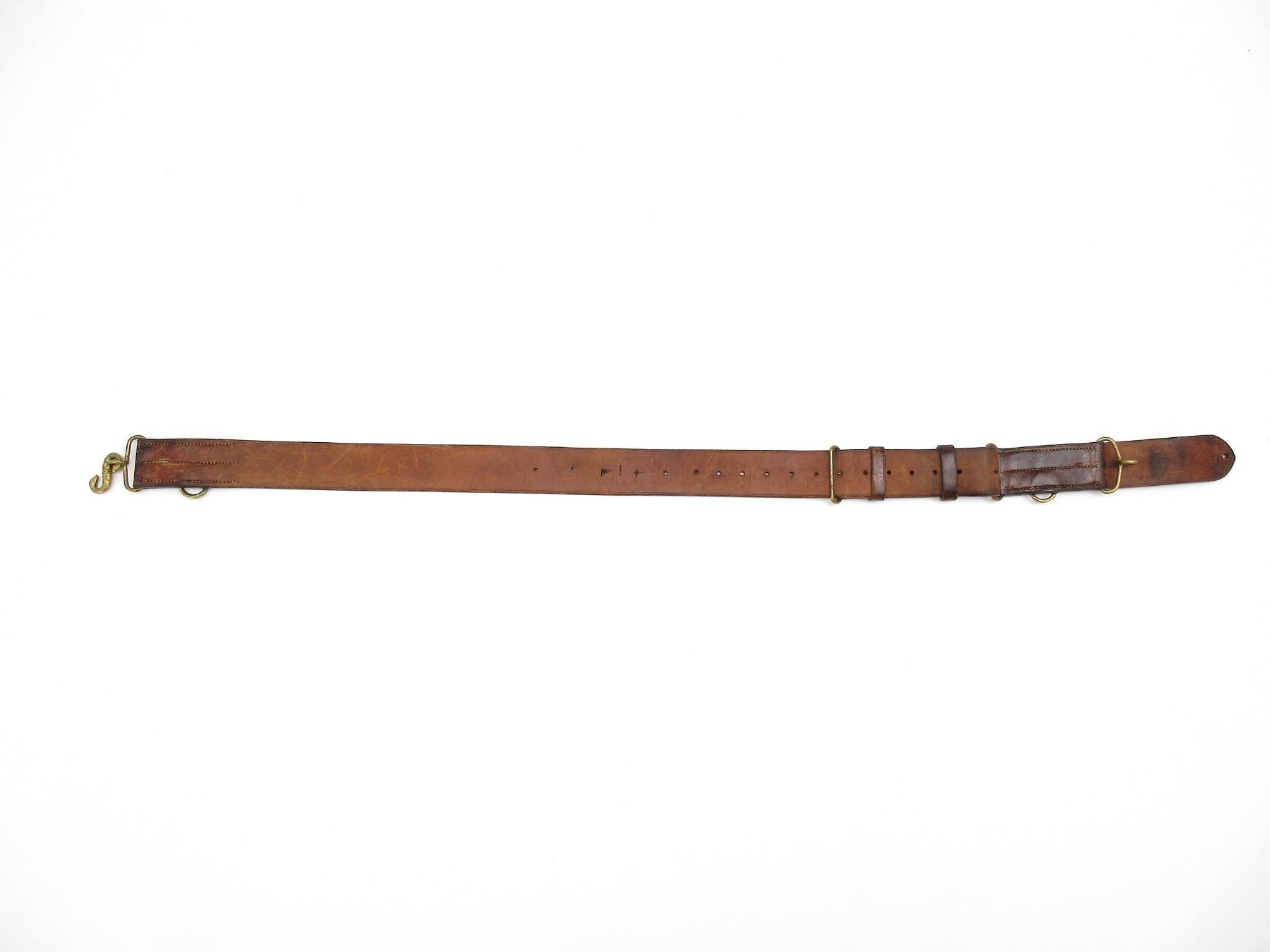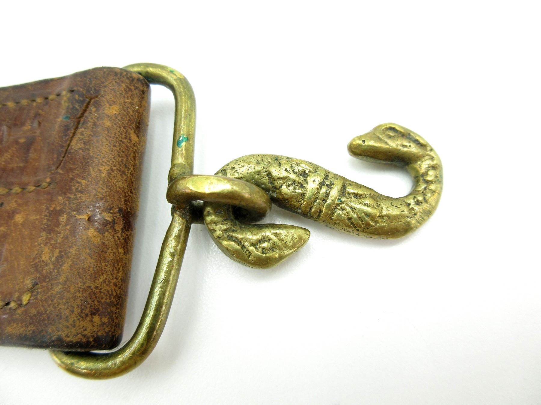 (1) BROWN LEATHER SNAKE BELT WITH BRASS FITTINGS / SNAKE BUCKLE, MARKED: "B??????M. CO, 1912", C-BROAD ARROW & "1, 41, 1, 85", OAL APPROX. 40.5", ADJUSTABLE. SEE PHOTOS.