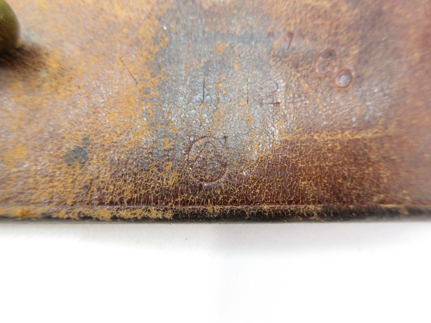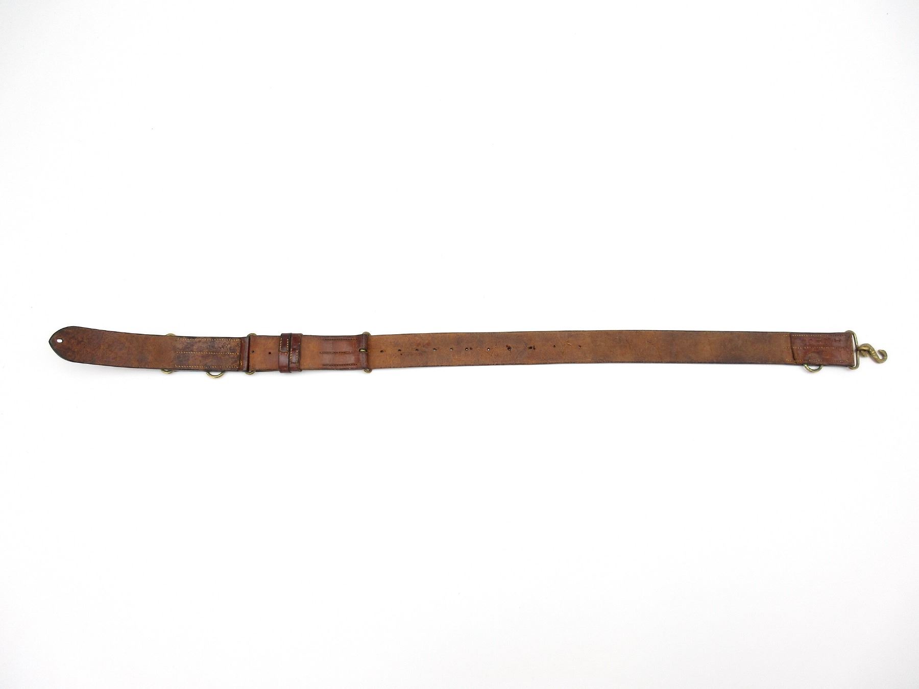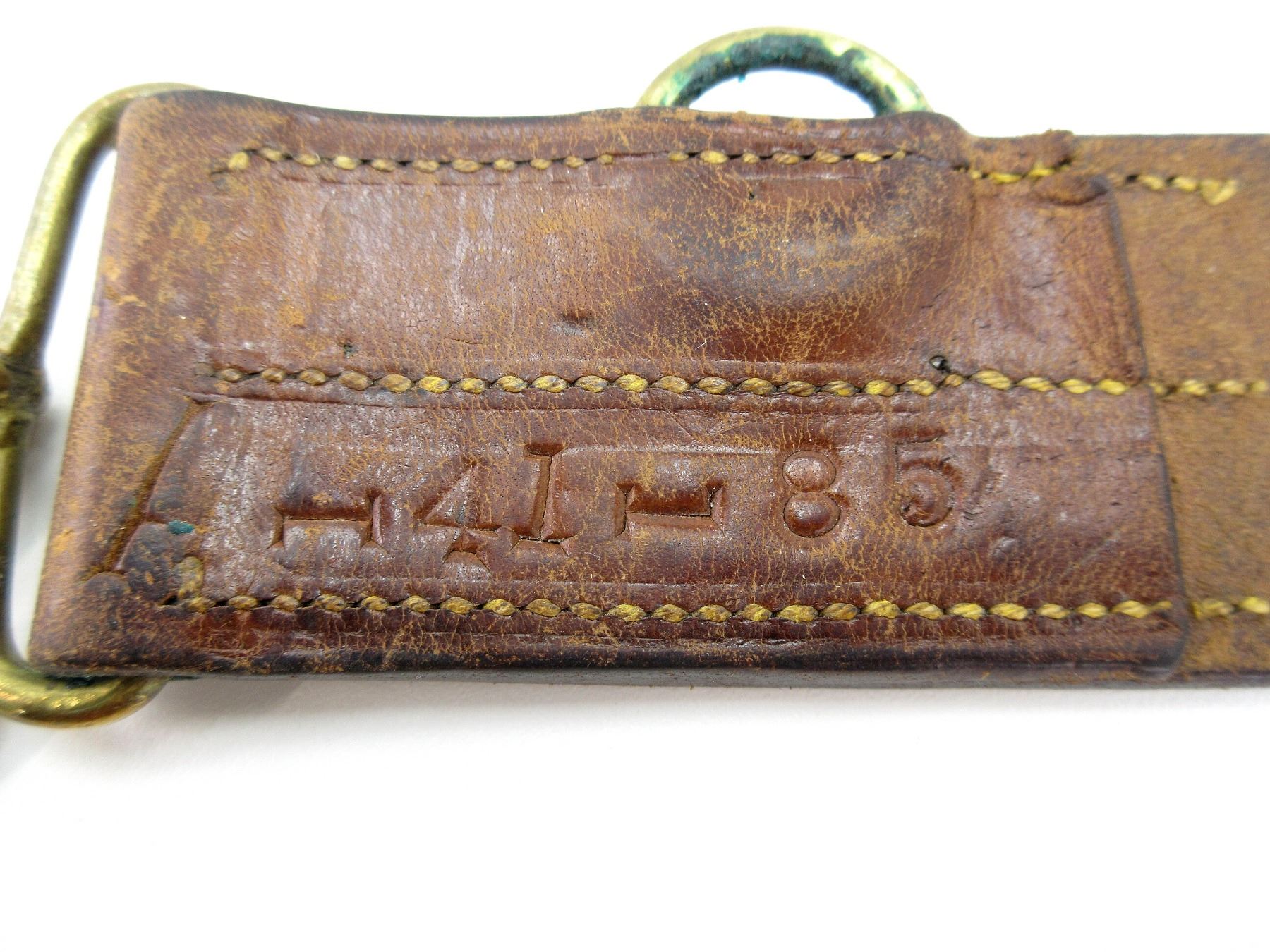(1) BROWN LEATHER SNAKE BELT WITH BRASS FITTINGS / SNAKE BUCKLE, MARKED: "B??????M. CO, 1912", C-BROAD ARROW & "1, 41, 1, 85", OAL APPROX. 40.5", ADJUSTABLE. SEE PHOTOS.