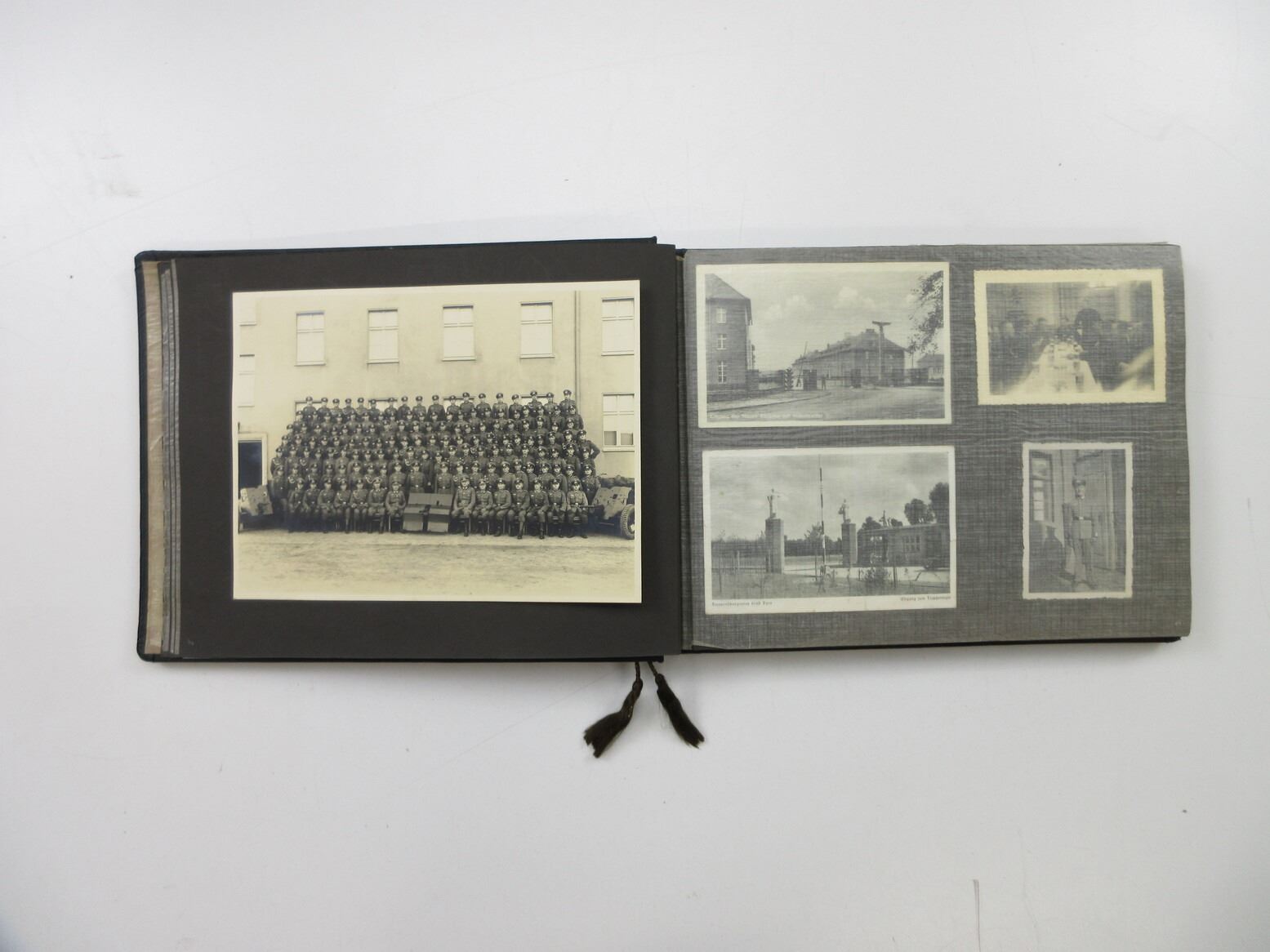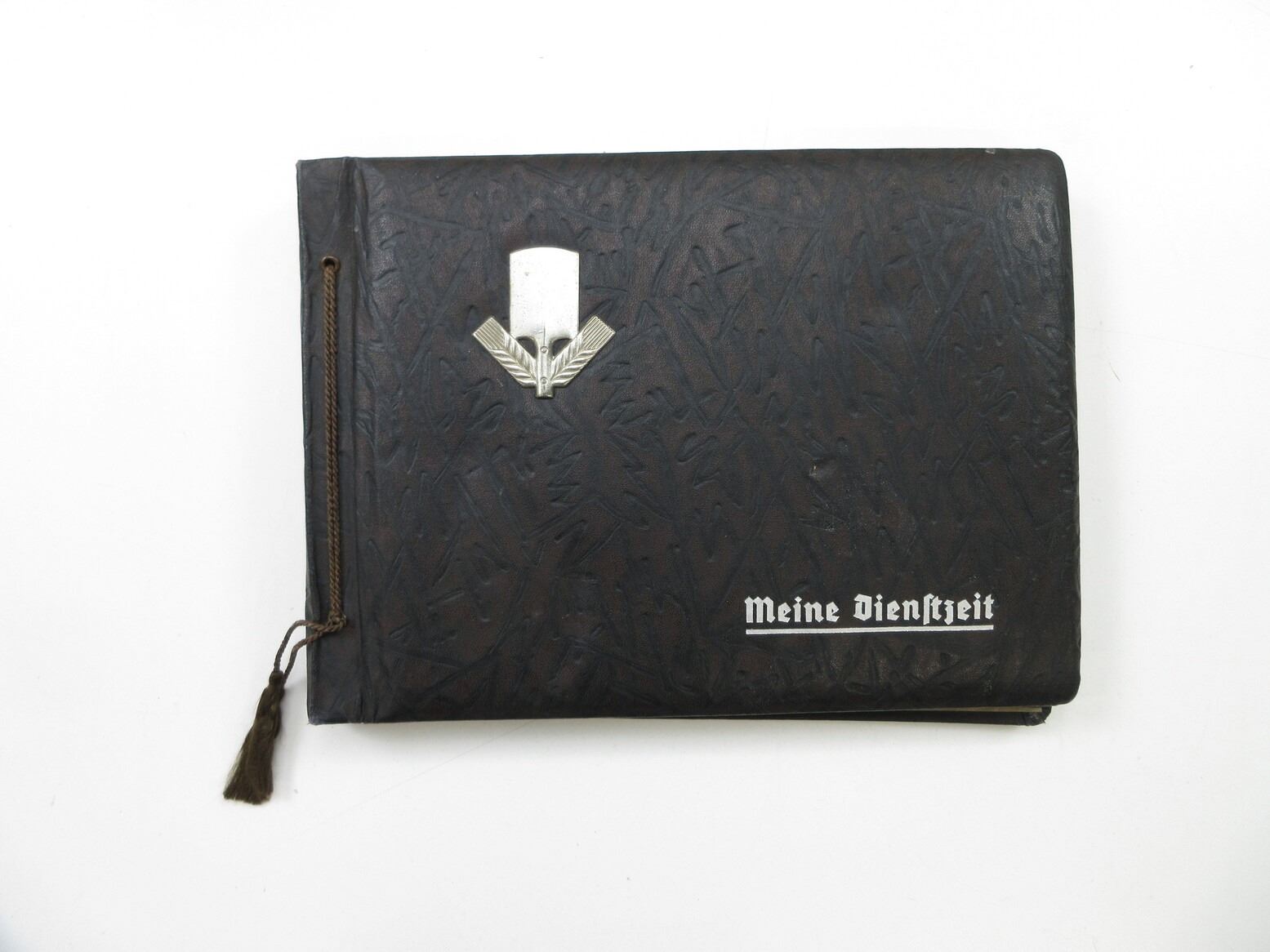 PRE-WWII / WWII GERMAN WEHRMACHT PHOTOS AND ALBUM LOT. LOT INCLUDES; APPROX. (155) PHOTOS OF SOLDIERS / WAR SCENES / ARTILLERY, VARIOUS LOCATIONS, CONSIGNOR STATES: "RAD (REICH LABOR SERVICE) MEMBER ALBUM; PHOTOS COVER TRAINING / WARTIME SERVICE IN ROMANIA & EASTERN FRONT", PICTURES SHOW SOME AGE, ALSO INCLUDES VARIOUS POSTCARDS & CIGARETTE CARDS & (1) BROWN PHOTO ALBUM, MARKED: "MEINE DIENFTZEIT (MY OFFICE)", SMALL BROWN TASSEL ATTACHED, ALBUM APPROX. 12.25" X 9.25" X 1 1/8". SEE PHOTOS.
