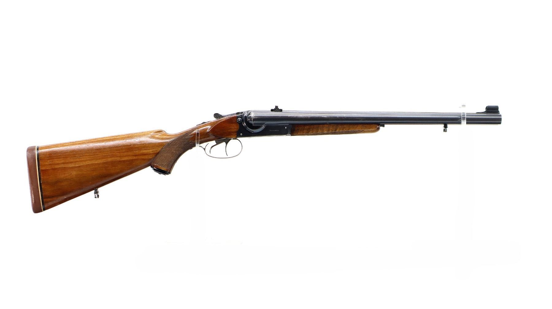 Main Description: This is a custom conversion by Pro Line Shooters Calgary of a 12 G Side By Side to Double rifle. Blade front sight with hood and ramp, u notched rear sight with one fixed and two folding leafs, blued finish, manual safety, ejectors that release when opened and when fired, double triggers, some screws have wear and sharp edges. Two piece wood stocks, checkered forearm and pistol grip, cracked and chipped behind receiver, European cheek rest, brown rubber recoil pad, grip cap, sling swivels.