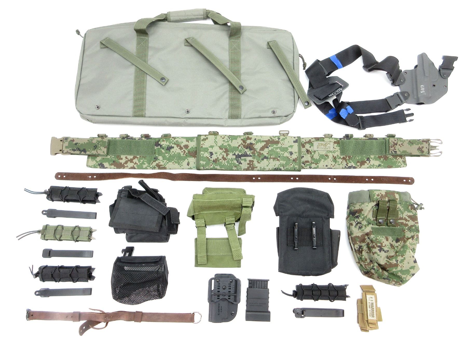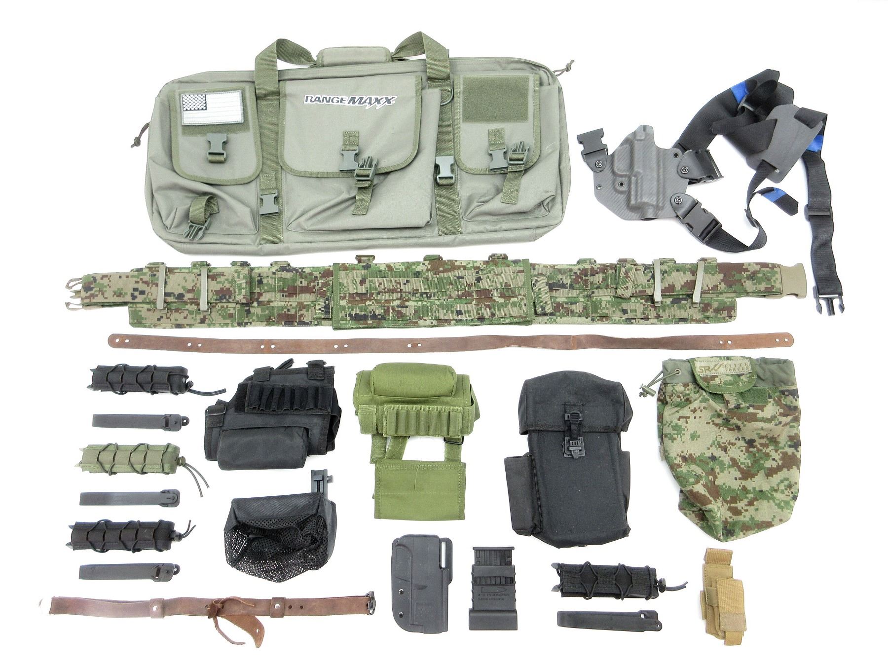 LOT INCLUDES; (1) RANGEMAXX TACTICAL STYLE GUN CASE, SOFT PADDED, GREEN NYLON CONSTRUCTION, WITH VARIOUS POCKETS, WORKING ZIP CLOSURE, CARRY HANDLE, APPROX. 27.5" X 12", (1) SRVV TACTICAL MOLLE BELT, GREEN CAMO, NYLON CONSTRUCTION, PADDED, BUCKLE CLOSURE, WITH VARIOUS ATTACHMENT POINTS, ADJUSTABLE, OAL APPROX. 46", (1) SRVV UTILITY POUCH, GREEN CAMO, NYLON CONSTRUCTION, APPROX. 6" X 10.5" X 3.25", (1) AR15 / M4 DRUM MAGAZINE POUCH, BLACK NYLON CONSTRUCTION, FITS TWO DRUM MAGAZINE, WITH VARIOUS POCKETS, (2) CHEEK RESTS, SLIP ON, WITH AMMO SLEEVE, ADJUSTABLE, BLACK / GREEN NYLON CONSTRUCTION, OAL APPROX. 7.25", WITH VARIOUS OTHER POUCHES, STRAPS, ETC. SEE PHOTOS.