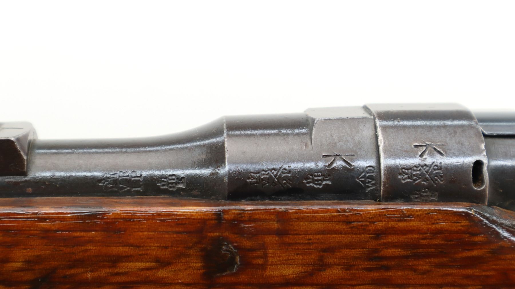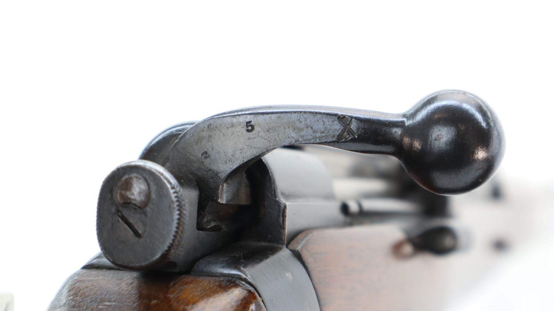 Main Description: Manufactured by Enfield 1893, bolt matches. This rifle is an early Trials Carbine with consecutive serial number to Lot 2156. Barley corn front sight with ears and ramp, adjustable u notched ladder rear sight, blued metal finish, various parts have Double broad arrows indicating sold from stores, bolt has a dust cover, no safety on cocking piece, has a magazine cut-off. Three piece full military wood stocks, hand guard is cracked and repaired, forearm has screws for leather sight cover which is not included. Pistol grip, smooth brass butt plate with trap, unmarked brass stock disk, toe of stock has 2 holes plugged with wood dowel, under side of pistol grip has initial M or W.