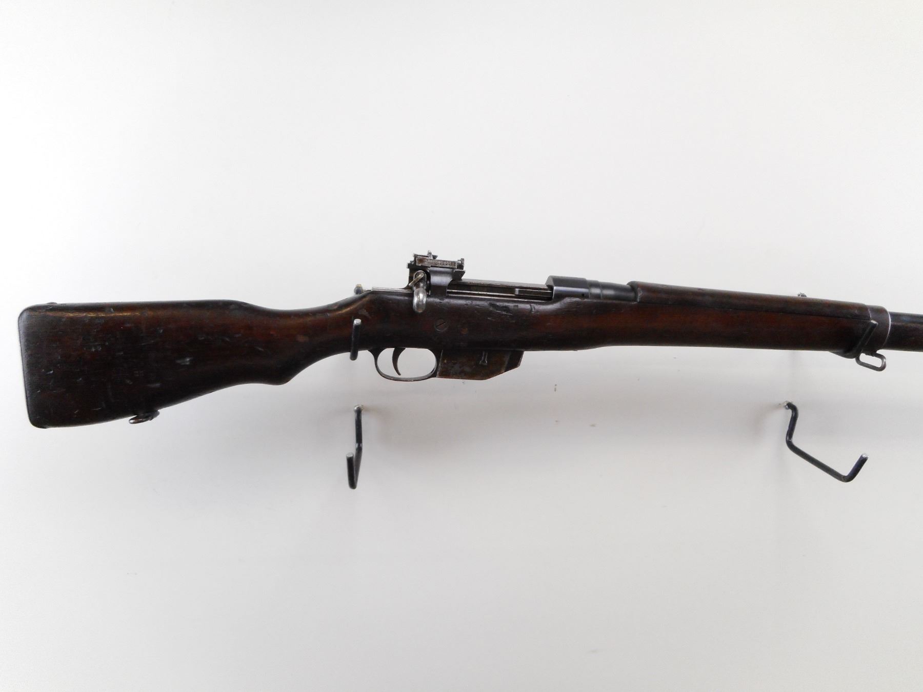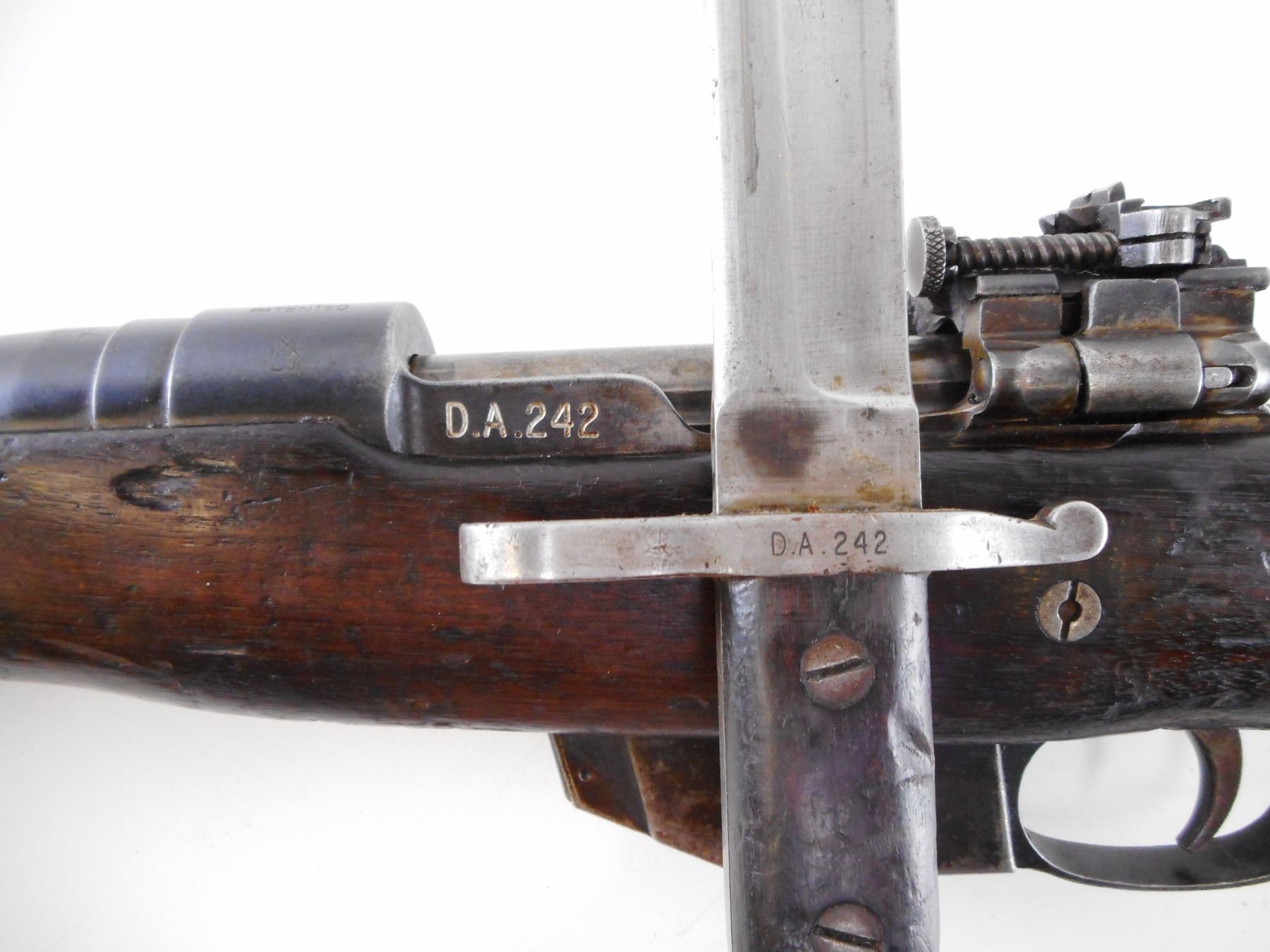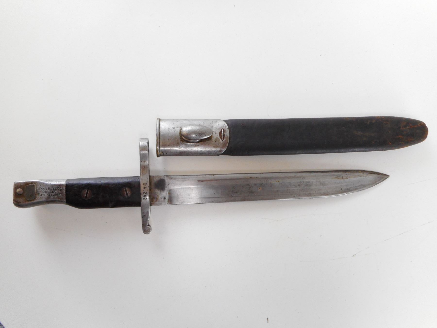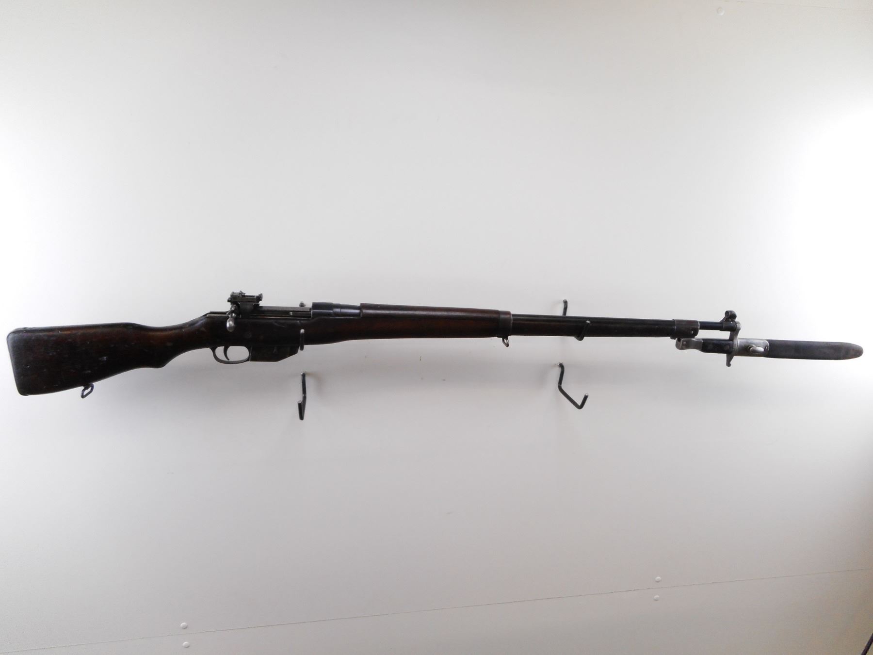 RARE, ROSS , MODEL: 1910 MKIII , CALIBER: 303 BR , COMES WITH MATCHING BAYONET, WITH BRITISH TYPE SCABBARD. BORE IS GOOD, WORN WITH LIGHT PITTING. BLADE FRONT SIGHT WITH HOOD. ADJUSTABLE REAR PEEP SIGHT. BLUED FINISH ON METAL PARTS. UNPINNED COLOUR CASE HARDENED BOLT. SMOOTH STEEL BUTT PLATE WITH BRASS TRAP. 4 SWIVELS. 2 STAMPED BARREL BANDS. BAYONET LUG. RIGHT SIDE OF BUTT STOCK MARKED "31ST BN CEF." LEFT SIDE OF RECEIVER MARKED "DA 242" THIS # WAS SOLD TO ENGLAND FOR USE ON H.M.S. CANADA, SHIP AND RIFLES SOLD TO CHILEAN NAVY MARKED WITH "DA" AND RACK # THE BAYONET IS MATCHING TO THIS. BLUEING SHOWS SOME WEAR AND LIGHT RUST SPECKLES. STOCK SHOWS HANDLING MARKS AND WEAR. , SERIAL # 365ES , ACTION: STRAIGHT PULL BOLT , BARREL LENGTH: 30 1/2" , CONDITION: 6/10 , CLASS: CANADIAN NON RESTRICTED CLASS. CONSIGNOR STATES. "The following two Ross rifles were sent overseas with the CEF, then exchanged to the British for SMLE's. The British reissued them to the Royal Navy stamped with British ownership numbers, and they became part of the on board Armory of various warships. The battleship HMS Canada, was ordered by Chile prior to the start of WWI but not delivered. With the outbreak of war, the British appropriated the battleship. After the war, HMS Canada and several destroyers were sent to Chile, and their on board rifles and bayonets were included. The Chilean Navy renamed the battleship the Almirante Latorre, and stamped the Ross rifles with a DA Navy ownership number on the receiver. The bayonets were stamped to match the rifles. These rifles are early production, with CEF stamps, Royal Navy stamps, and Chilean Navy stamps."